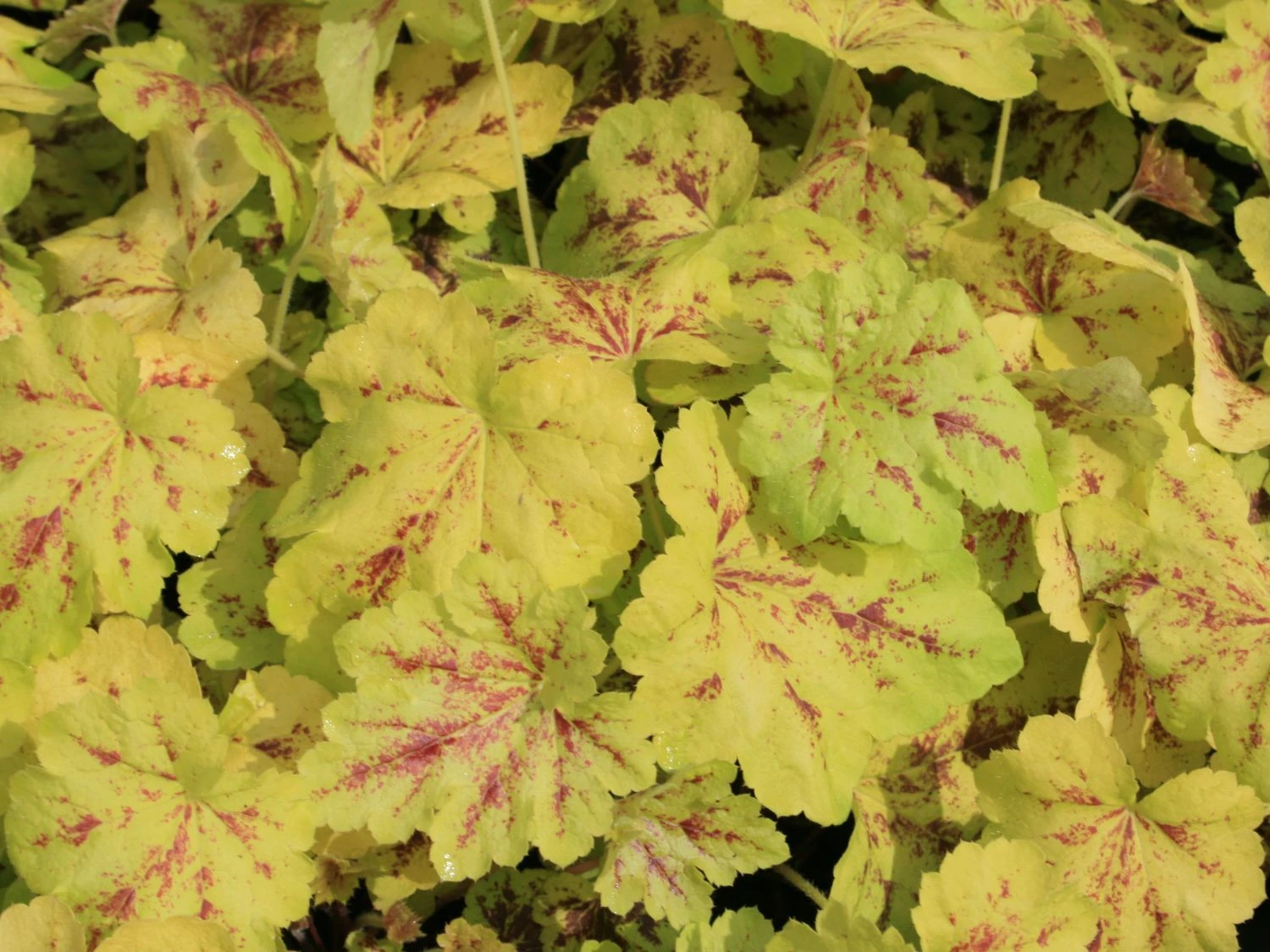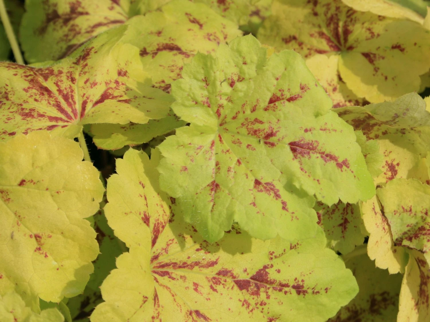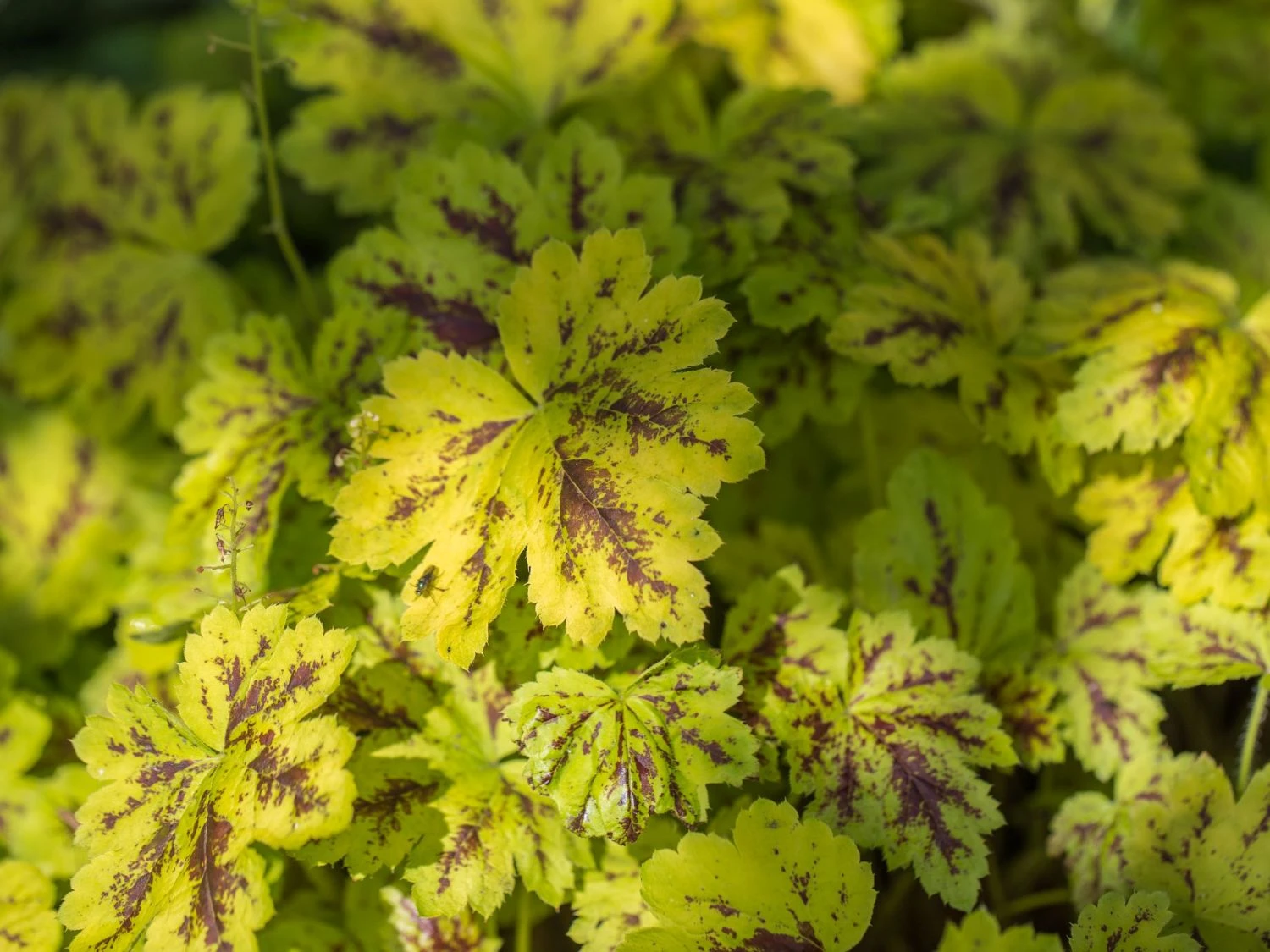 Das frische Gelbgrün dieser schönen Staude erinnert an die Farbe einer Limette. Das Rotbraun in der Blattfärbung ist gesprenkelt. Diese Sprenkel sind dicht gehalten. Dadurch erscheinen sie wie große Flecken, die das helle Grün durchweben. Die edle und anmutige Eleganz der Bastard-Schaumblüte ‚Solar Power‘ liegt in ihrem Blattwerk. Ihr aufregender Blattschmuck sorgt das ganze Jahr hindurch für einen imposanten Anblick. Dieser schöne Anblick verstärkt sich während ihrer Blütezeit. In der Zeit von Mai bis Juni verleiht sie ihrem Aussehen mit den cremeweißen Blüten noch das berühmte I-Tüpfelchen. Ein kompletter Rückschnitt ist nicht nötig. Nur nach der Blütezeit ist ein leichtes Schneiden der verblühten Pflanzenteile sinnvoll. Ein nährstoffreicher, durchlässiger Boden reicht völlig aus. Größere Ansprüche stellt die Heucherella tiarelloides ‚Solar Power‘ an die Lichtverhältnisse. Ideale Standorte liegen in absonnigen bis halbschattigen Bereichen.