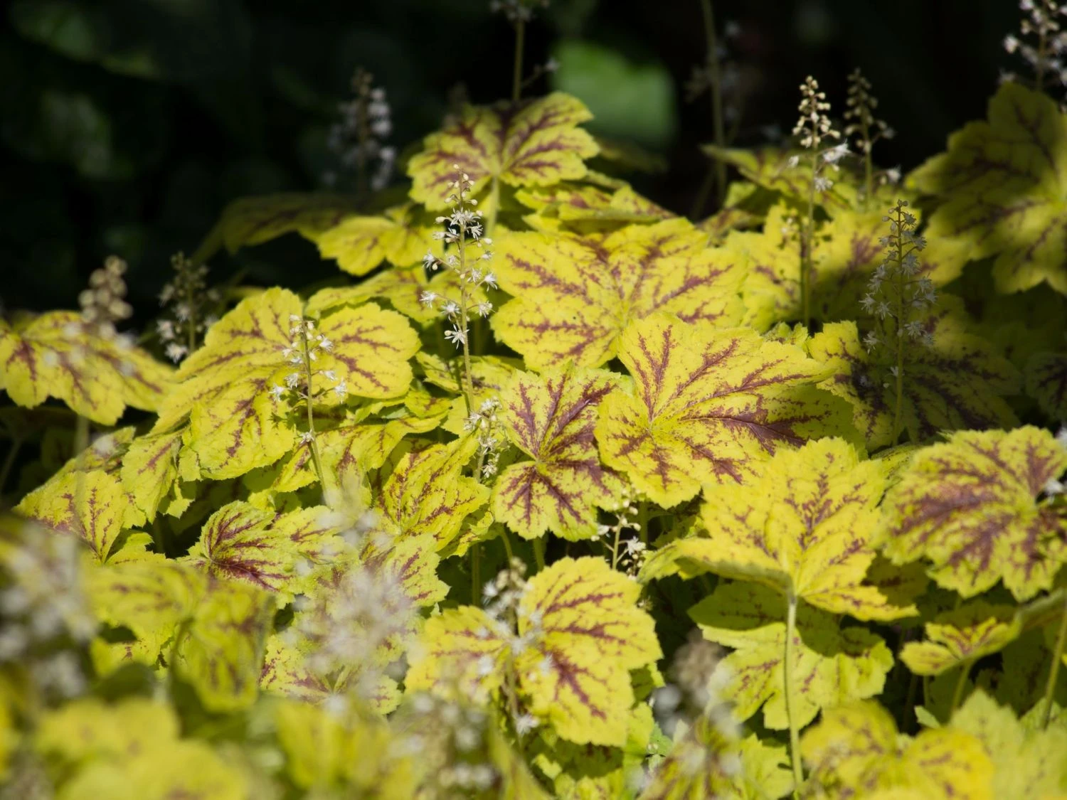Diese wintergrüne Schönheit bezaubert durch das ganze Jahr hindurch. Die (bot.) Heucherella tiarelloides ‚Solar Power‘ zählt zu den aufregenden Arten der Bastard-Schaumblüte. Sie besticht mit einer ganz speziellen Schönheit. Sie ist während ihrer Blütezeit traumhaft anzusehen. Dank ihrer wintergrünen Eigenschaft behält sie durch das ganze Jahr hindurch ihre unglaubliche Attraktivität. Diese anmutige und edle Staude zählt zu den Blattschmuckstauden. Heucherella tiarelloides ‚Solar Power‘ ist das ganze Jahr über ein absoluter Blickfang. Mit einer Höhe von bis zu 40 Zentimetern, ist sie eine niedrig wachsende Staude. Was sie in der Höhe nicht mitbringt, erreicht sie mit ihrem Blattwerk. Ihre Blätter haben eine leuchtende Wirkung. Sie betören den Betrachter mit ihrer Blattfärbung in einem frischen gelbgrün mit rotbrauner Zeichnung.