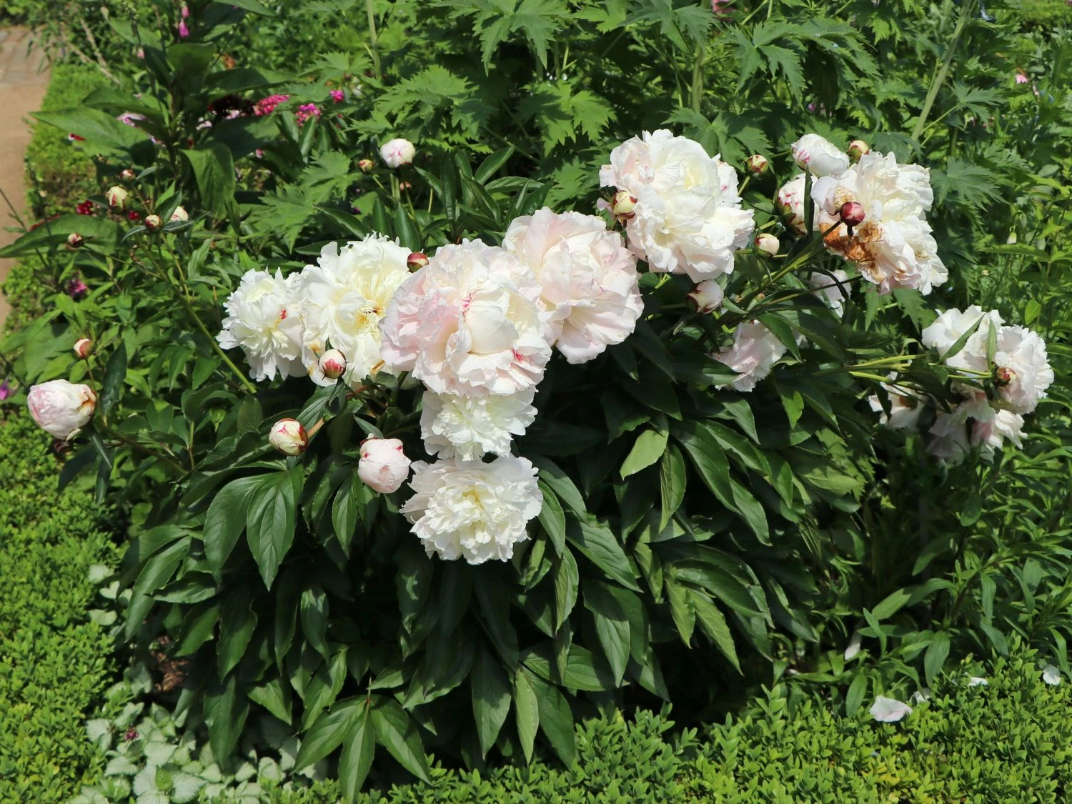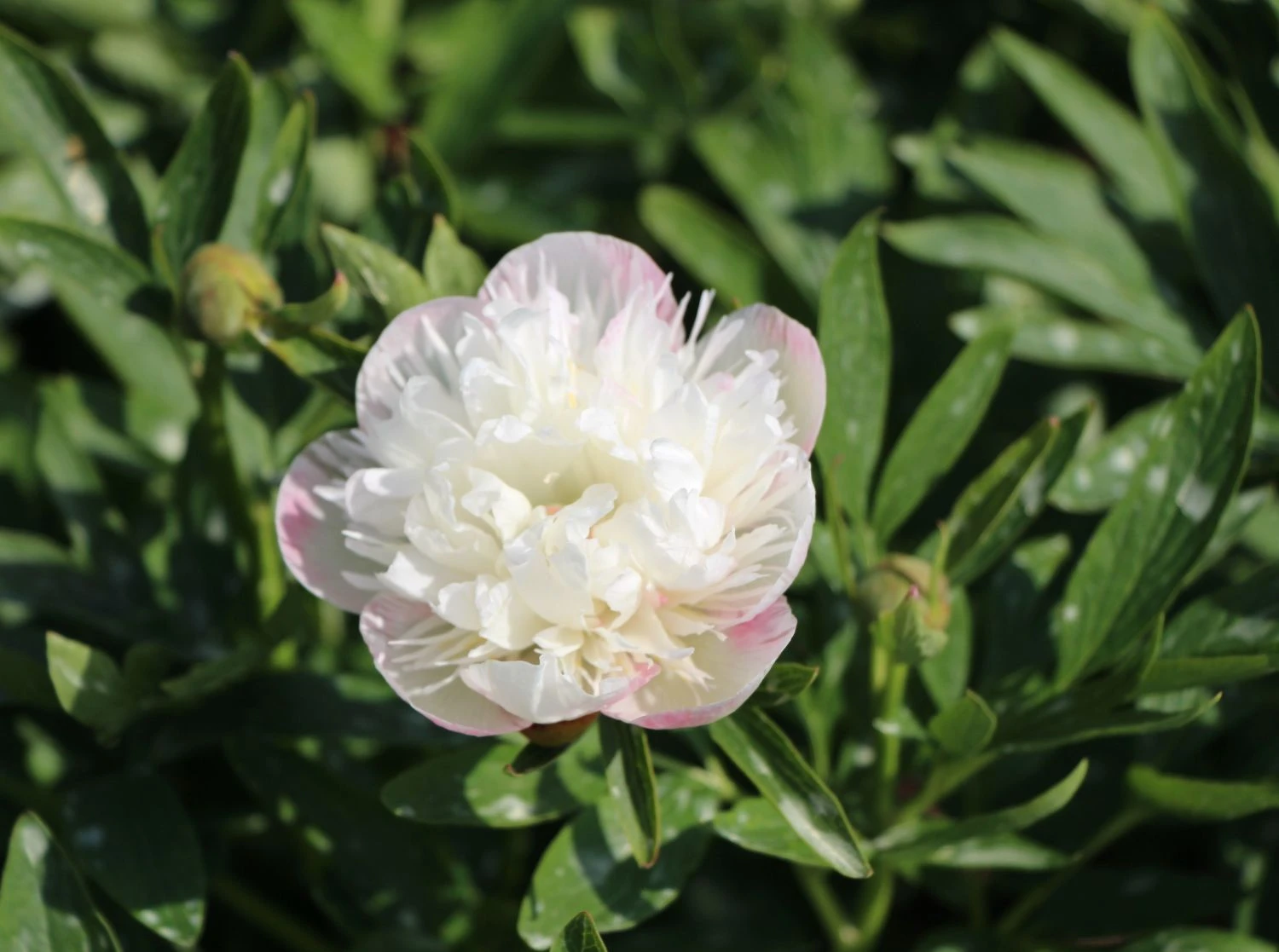 Wenn die Tage länger und die Sonnenstrahlen kräftiger werden, lassen zahlreiche rosa Knospen einen Ausblick auf den nahenden Sommer erahnen. Im Wonnemonat Mai brechen die Knospen auf und enthüllen ihre großen, reinweißen Blüten. Es ist die Zeit der wunderschöne Bauerngarten-Pfingstrose ‚Alba Plena‘ (bot. Paeonia officinalis ‚Alba Plena‘). Sie erfüllt für die nächsten vier bis sechs Wochen den Garten mit ihrem angenehmen, zarten Duft und ihrer reichhaltigen Blütenpracht. Dabei sind die gefüllten Blüten an den schwachen Stielen so schwer, dass sie eine Stütze erforderlich machen.