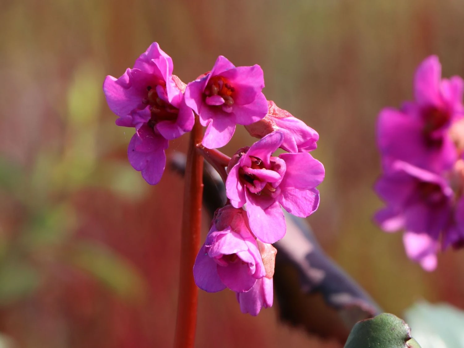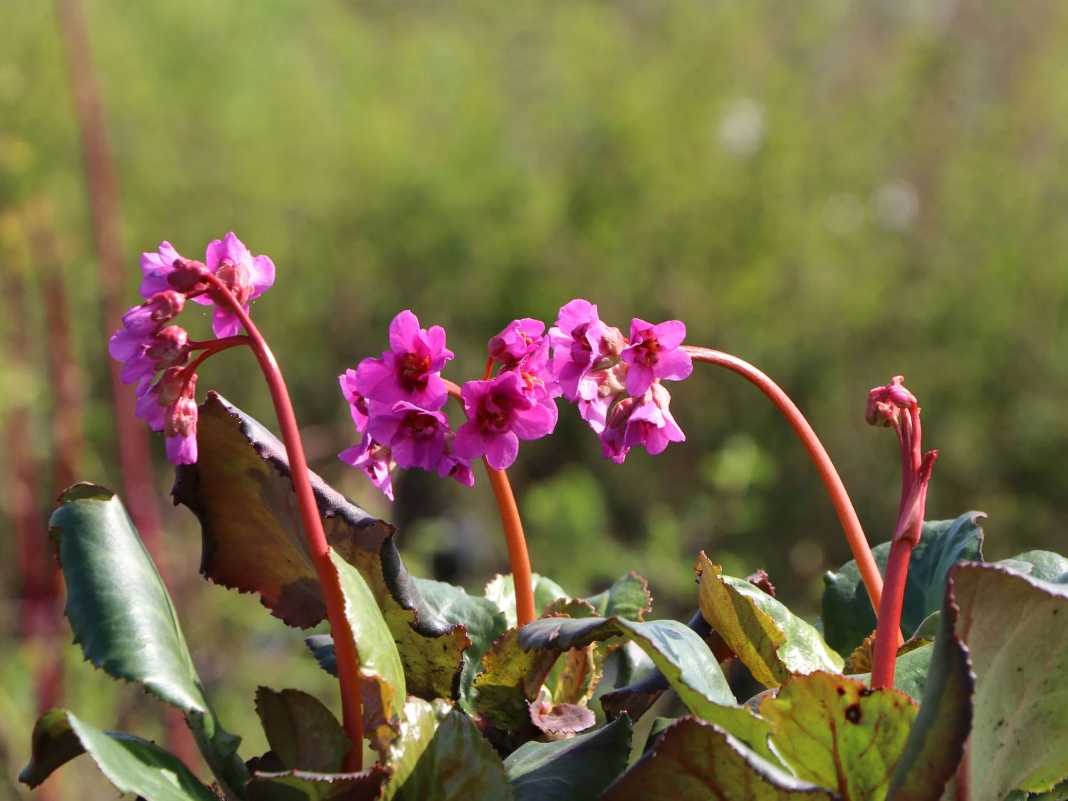 Weithin sichtbar, stehen die doldenartig angeordneten Blütenköpfe über dem Laub empor. Sie stehen gestützt von kräftigen und langen Stielen. Die einfachen Blüten sind glockenförmig geformt. Die Bergenie ‚Abendglut‘ erscheint mit dunkel-purpurroten und anmutigen Einzelblüten. Sie bildet mit ihren Blüten und dem Laub einen schönen, farblich harmonischen Kontrast. Insgesamt erscheint die Bergenia cordifolia ‚Abendglut‘ als Mischung aus Imposanz und anmutiger Eleganz. Sie zieht schnell die Betrachter in ihren Bann. Die Bergenie ‚Abendglut‘ gedeiht an sonnigen bis halbschattigen Standorten. Ein gut gewählter Boden ist frisch, gut durchlässig und nährstoffreich. Sie kommt mit einer normalen und frischen Beschaffenheit des Bodens gut zurecht. Unter diesen Voraussetzungen entwickelt sie sich prächtig. Die beeindruckenden Blätter und die zauberhaften, doldenartig angeordneten Blütenstände sind beliebte Schnittblumen für die Vase.