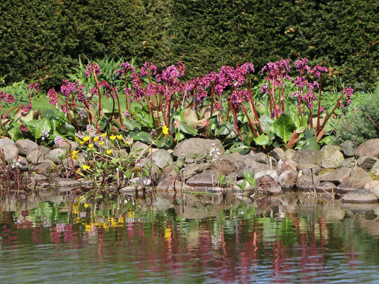 Die robuste und wintergrüne Bergenie ‚Admiral‘ gedeiht prächtig im Halbschatten und verträgt frische Böden. Die Bergenia cordifolia ‚Admiral‘ eignet sich hervorragend als Randbepflanzung von verschlungenen Gartenwegen, plätschernden Bächen und kleinen, idyllischen Teichen. Sie wirkt wunderschön im Kontrast zu benachbarten, feinen Gräsern. Die füllige, anschauliche Wuchsform der Staude ist aus botanischer Sicht eine gelungene Kombination. Sogleich sich ihre dunklen Blütenstängeln und die purpur-rosa Blütenfarbe, in Kombination mit hauchzarten hellen Gräsern, sanft im Wind wiegen. Jedes Gärtnerherz schlägt bei diesem Anblick deutlich höher. Die Bergenie ‚Admiral‘ eignet sich ebenso gut als Schnittpflanze. Ebenso bei späten Frösten, die im fortgeschrittenen Frühjahr auftreten und häufig die Farbenpracht komplett zunichte machen, lassen sich die zauberhaften Blüten schneiden. Die frühen Blüten bieten Bienen und Insekten eine gute Nahrungsquelle. Vor Schneckenfraß fürchten sich Hobbygärtner selten. Ein nährstoffreicher Boden, ein halbschattiger und nicht sonderlich zugiger Standort sorgen für einen kräftigen und ausladenden Wuchs der Staude. Die Bergenie ‚Admiral‘, die zur Familie der Steinbrechgewächse gehören und ursprünglich aus Zentral-Asien stammen, sind in der Regel frosthart und beständig.Sie ist auch unter den deutschen Namen Riesensteinbrech bekannt.
