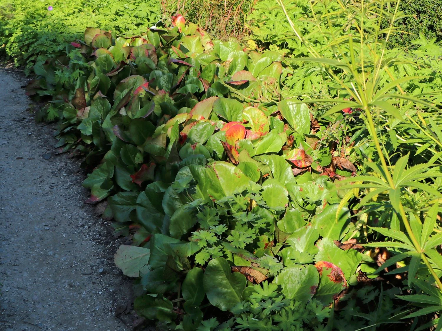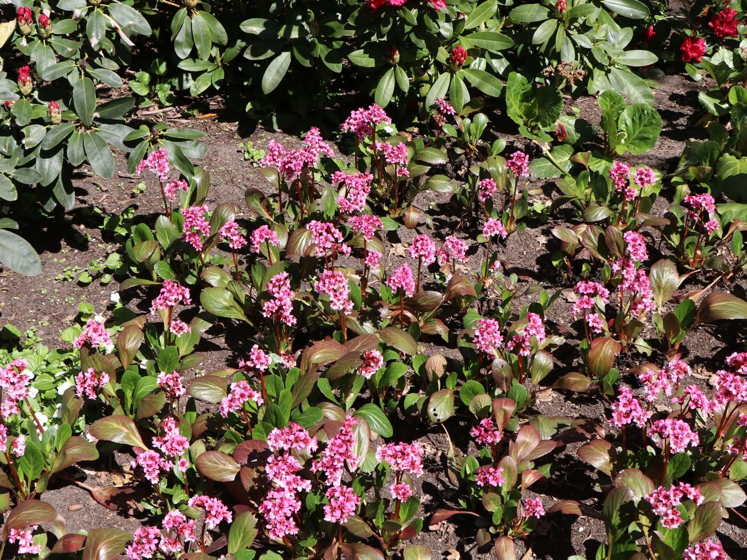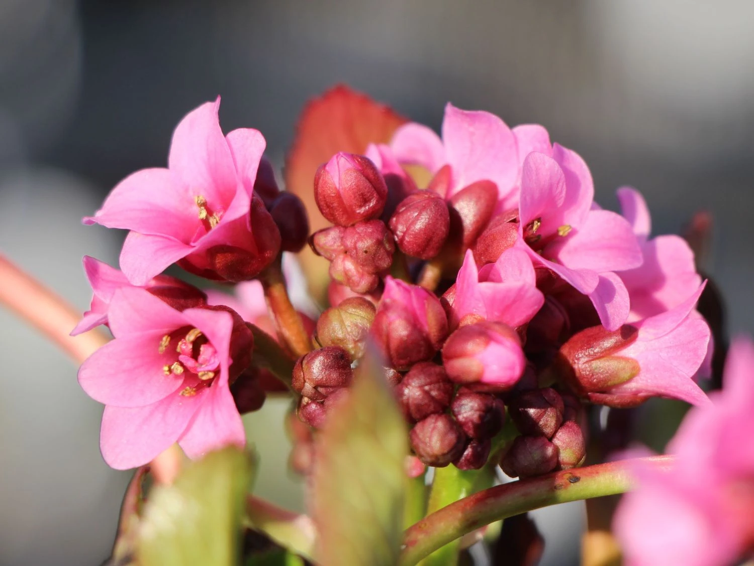 Die Pflanze trägt im Volksmund als weiteres Synonym die Bezeichnung Wickelwurz. Das kommt von der Neigung zur Rhizombildung, durch die sich die Pflanze verbreiten und vermehren kann. Hier ist beherzt zur Schere zu greifen, sobald die Rhizome beginnen sich im Beet zu weit auszubreiten. Die Pflanze belohnt es mit frischem Wuchs, neuen Trieben und kräftigen Blüten. Wie die meisten Stauden, dankt die Bergenia cordifolia ‚Pink Dragonfly‘ regelmäßige Nährstoffgaben mit reichlicher Blüte und satter Blattfärbung. Die prachtvollen und kräftig pinken Blüten in ihrer doldenförmigen Anordnung, erinnern an eine pinkfarbene Libelle. Regelmäßig geschnitten und gedüngt, erfreut die Bergenie den Betrachter bis in den Herbst mit einer reichen Blütenpracht. Eine weitere Besonderheit ist die rötliche Verfärbung der Blätter in den kalten Monaten. Damit verleiht sie Staudenbeeten oder Steingärten in der Winterzeit ein lebendiges Aussehen.