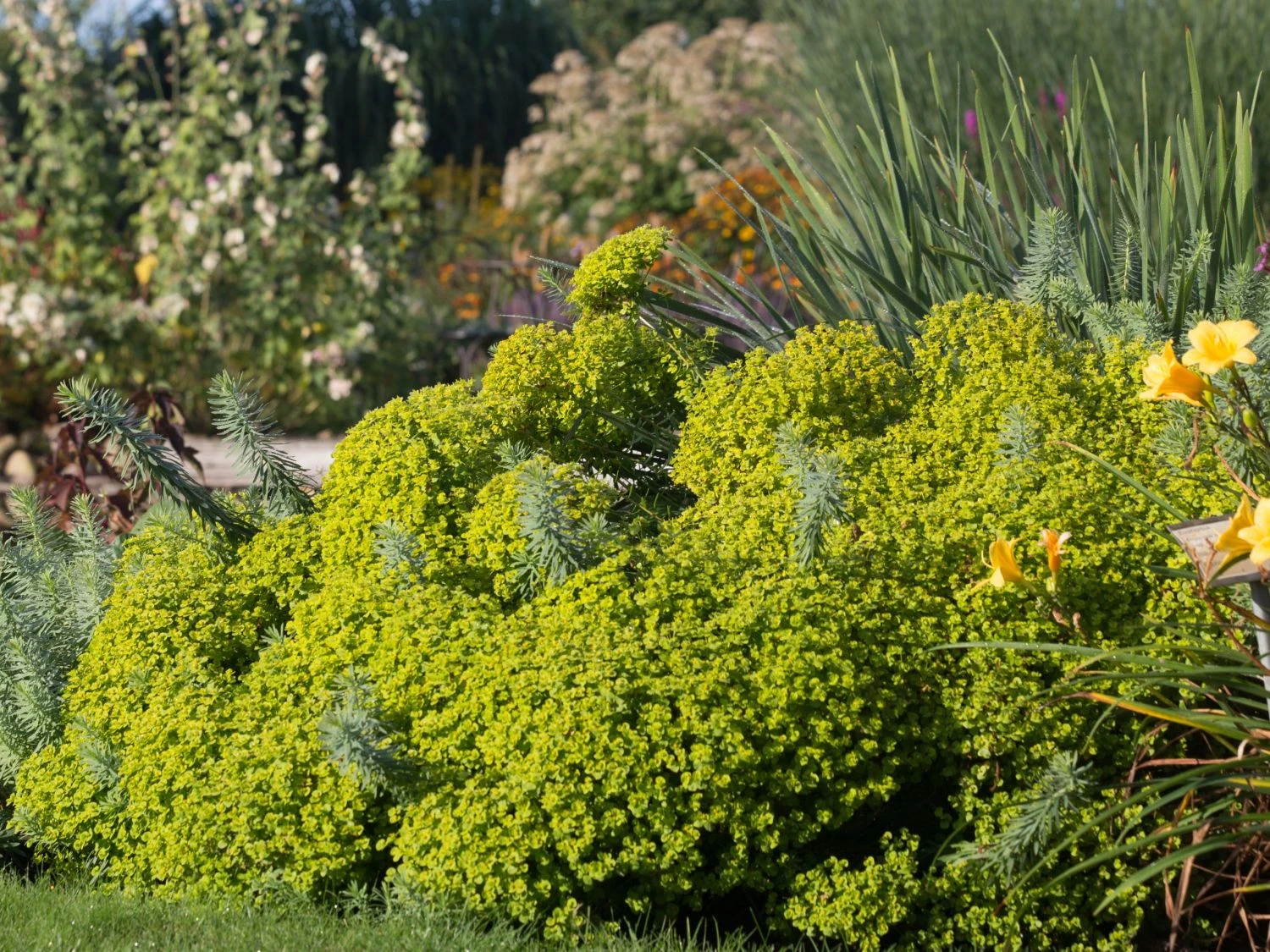 Die Bläuliche Wolfsmilch ist eine interessante Staude, die sich glücklicherweise wachsender Beliebtheit erfreut. Diese Art der Gattung Wolfsmilch in der vielfältigen Familie der Wolfsmilchgewächse, überzeugt mit ihrem außergewöhnlichem Äußeren. Die Pflanze ist vielen Gärtnern auch unter dem Namen Steppen-Wolfsmilch bekannt. Gemeinsam mit den anderen Arten der Wolfsmilch trägt sie den Titel Staude des Jahres 2013. Die (bot.) Euphorbia seguieriana subsp. niciciana präsentiert sich dem Betrachter mit hellgelben Blütenständen, die eigentlich Hochblätter, also Scheinblüten sind. Die Blüten stehen in großen Dolden zusammen und zeigen sich am Ende beblätterter Stängel.