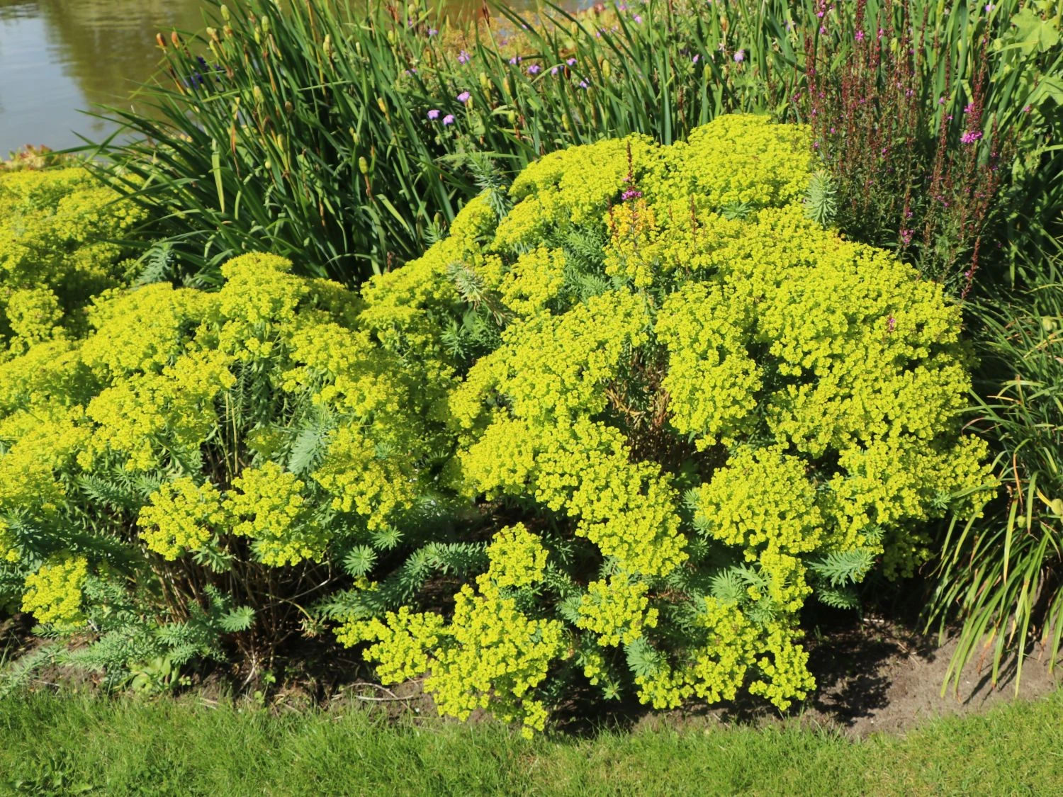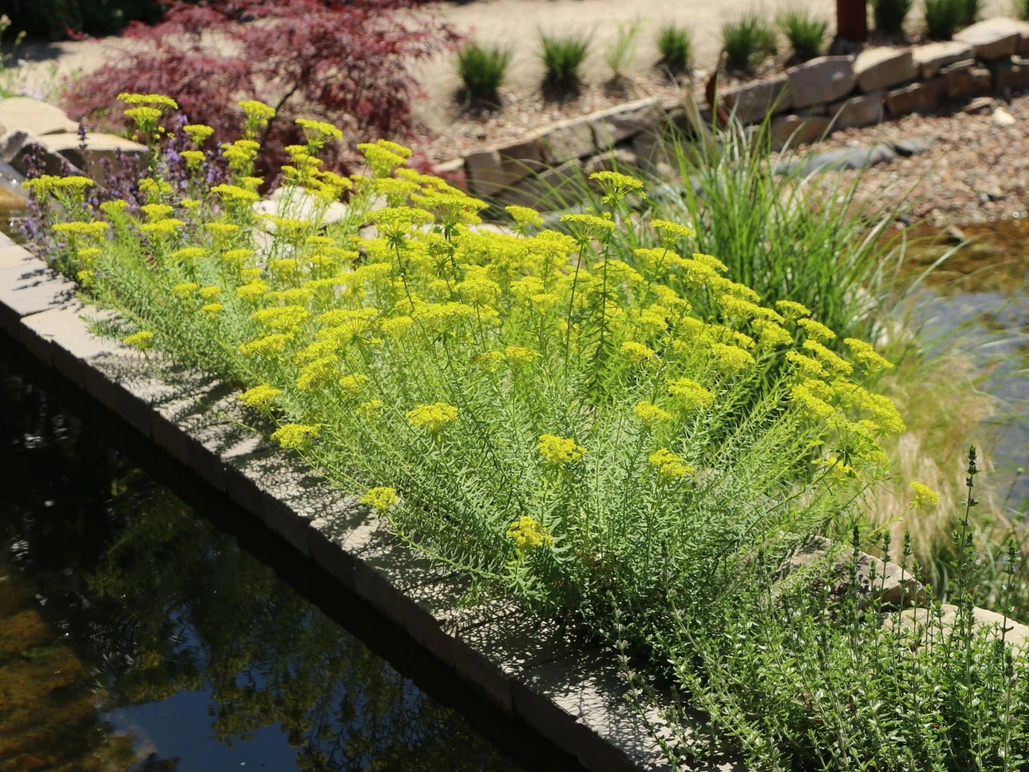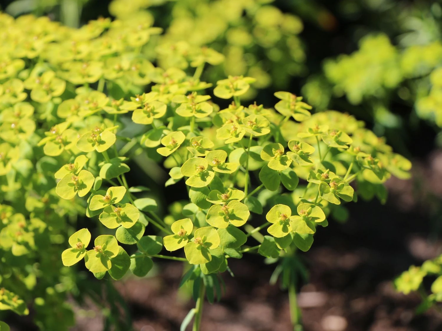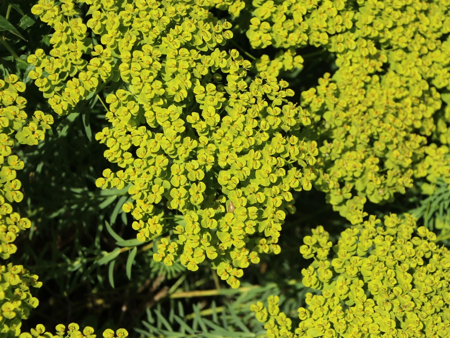 Ihren Namen hat die Bläuliche Wolfsmilch aufgrund der Farbe der Stängel und Blätter. Sie sind blaugrün und geben der Euphorbia eine einzigartige Note. An den schlanken Stielen der Pflanzen dieser Art finden sich kleine zugespitzte Blätter, die fast wie Nadeln aussehen. Durch diese Blattform verdunstet die Euphorbia seguieriana subsp. niciciana wenig Wasser und kommt mit Trockenheit gut zurecht. Kein Wunder, dass sie auch als Steppen-Wolfsmilch bekannt ist. Die Bläuliche Wolfsmilch hat eine maximale Wuchshöhe von rund 40 cm und breitet sich auch in der Breite auf diese Größe aus. Die buschige Staude hat eine sehr edle und ruhige Wirkung und passt gut zu farbenfrohen Pflanzen und Rosen. Für viele Monate erfreut die Bläuliche Wolfsmilch mit ihren Blüten. Sie ist ein wahrer Dauerblüher. Wenn andere Pflanzen schon verwelkt sind, erfreut die Bläuliche Wolfsmilch immer noch mit ihren ausgeprägten hellgelben Hochblättern und den ausgefallenen grau- bis blaugrünen Blättern.