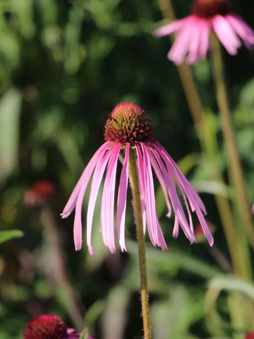 Die luftig wirkende Staude präsentiert herabhängende Blütenblätter in bezauberndem Rosa. Sie wirken filigran und sind das typische Merkmal des Bleichen Scheinsonnenhuts. Wie kleine Federbälle scheinen sie in der Luft zu schweben und erheben sich an aufrechten Stängeln über dem Blatthorst. Mit einer Höhe von 70 bis 80 Zentimetern ist (bot.) Echinacea pallida eine auffällige Blütenstaude im Beet. Mit ihrem Wildblumen-Charakter macht sie auf Freiflächen eine gute Figur und bringt ein naturnahes Flair in jeden Garten. Als Schnittblume wirkt sie dekorativ in Sträußen und entfaltet ein sommerliches Flair in den eigenen vier Wänden. Auch an regnerischen Tagen ein echter Gute-Laune-Anblick!