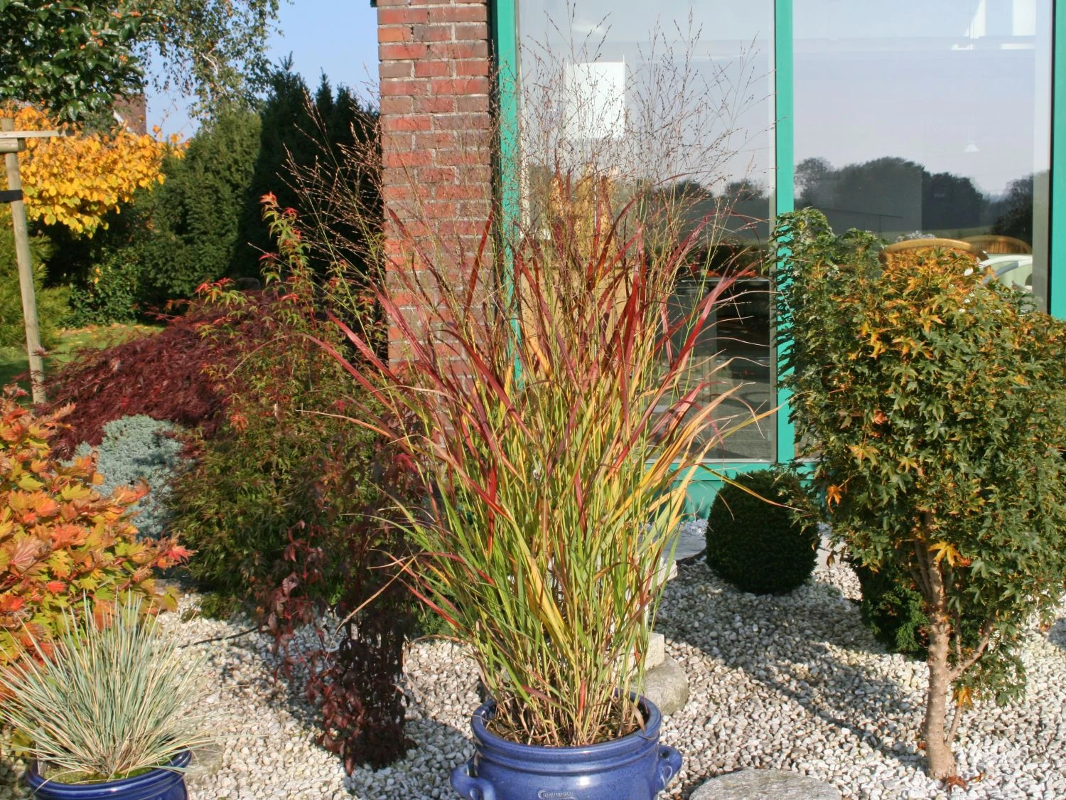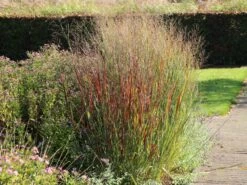 Die Braunrote Ruten-Hirse ‚Hänse Herms‘ Blüten punktet mit vielen Highlights. Ihre Blüten erscheinen von Juli bis September in Form ausnehmend filigraner und lockerer Rispen. Das Blattwerk zeigt sich anfangs in einem frischen Grün. Zum Sommer hin verwandelt es sich in einen bräunlich roten Farbton. Im Herbst beeindruckt es mit einem spektakulären Kupferton. Mit dem aufrechten und filigranen Wuchs ist (bot.) Panicum virgatum ‚Hänse Herms‘ ein schöner Blickfang. Als Solitärgras zieht die Rutenhirse alle Blicke auf sich. Auch im Hintergrund, als strukturbildende Pflanze in Beeten und Rabatten brilliert es. An Sitzplätzen und Terrassen lassen sich die filigranen Halme beobachten, wenn sie elegant im Wind schwingen. Eindrucksvolle Akzente setzt das Gras in vielen Situationen. Im Heide- oder Steingarten, in modernen Gärten, am Gartenteich oder am Rand einer Rasenfläche wirkt es prächtig. Die Braunrote Ruten-Hirse ‚Hänse Herms‘ harmoniert mit vielen Pflanzen. Kontrastreich entfaltet sie sich mit rotblühenden Kissenastern und gelborange blühendem Sonnenhut. Mit Ziergräsern wie der Waldschmiele und Chinaschilf geht Panicum virgatum ‚Hänse Herms‘ fantastische Partnerschaften ein. Setzt der Gärtner Indianernessel, Edel- und Kugeldistel ins Arrangement, wirkt dies ausgewogen und durchdacht.