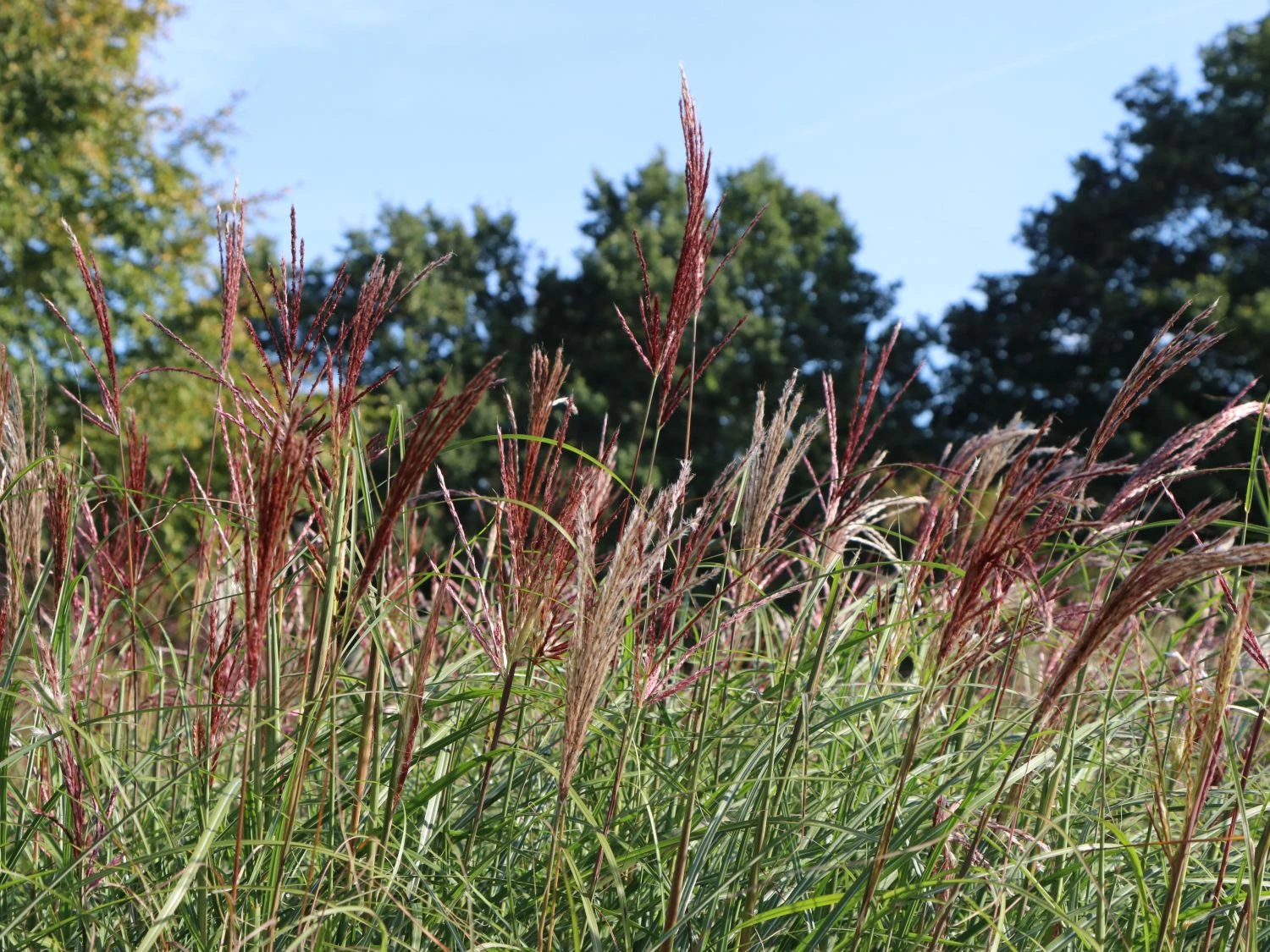 Abseits der Blütezeit anderer Pflanzen erscheinen beim Chinaschilf ‚Red Chief‘ die Blütenwedel von August bis Oktober. Das Gras trägt seine Blüten edel gefärbt von rot zu silber. Die Blüten sitzen in großen Ähren zusammen. Wie die gesamte Pflanze, wachsen die Blüten schön üppig. Das Laub, welches im Herbst seine charakteristische leuchtende Farbe annimmt, ist während den warmen Jahreszeiten von einem tiefen Grün. Die riemen -bis bandförmigen Blätter hängen locker bogig über, was dem Garten eine entspannte, friedliche Atmosphäre verleiht. Das wertvolle Ziergras hat eine mehrjährige Lebensdauer und ist pflegeleicht. Es braucht nicht viel Wasser und hält Temperaturen von bis zu -22 °C stand. So pflanzt der Gärtner Miscanthus sinensis ‚Red Chief‘ langfristig geplant an und es eignet sich als Sichtschutz oder Hecke. Besonders zusammen mit farbenfrohen Stauden wie gelben Chrysanthemen oder violettem Kerzen-Knöterich ist das Ziergras ansehnlich.