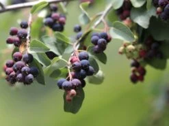 Die Essbare Felsenbirne ‚Ballerina‘ begeistert im Frühjahr als Zierstrauch mit strahlend weißen Blüten und einem bronzefarbenem Laubaustrieb, im Herbst mit leuchtender Laubfarbe. Weniger bekannt ist die (bot.) Amelanchier laevis ‚Ballerina‘ als Obstbaum, dessen süße, essbare Früchte zum Naschen verlocken. Sie bringt nicht nur eine unglaubliche Farbenpracht in den Garten, sie versüßt dem Gärtner das Leben. Verführerisch zeigen sind die leckeren Früchte der Essbaren Felsenbirne ‚Ballerina‘. Nach der Blüte erscheinen kleine, rot-schwarze Beeren zwischen den Blättern. Mit ihrem Kirsch-Mandel-Aroma verführen die erntereifen Früchte im Juli zum Naschen. Mit ihrer leicht weichen Konsistenz, wandern sie vom Strauch direkt in den Mund. Ihr Genuss verlängert sich durch das Verarbeiten der vitaminreichen Beeren zu köstlichen Marmeladen, Säften und Desserts. Auch einheimische Vögel sind von den Früchten der Amelanchier laevis ‚Ballerina‘ begeistert. Wer von den leckeren Früchten profitieren möchte, hüllt die Felsenbirne in ein Vogelschutznetz ein.