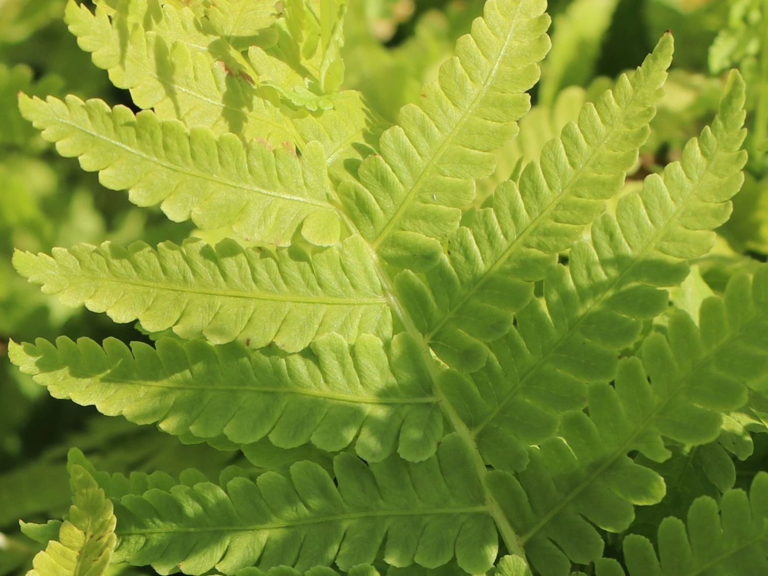 Seine phantastisch frischgrünen Wedel sind doppelt gefiedert, die Blätter sind trichterförmig angeordnet und staff aufrecht wachsend. Die Spitzen sind nach außen gebogen.