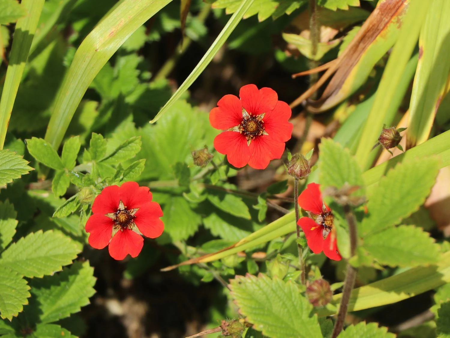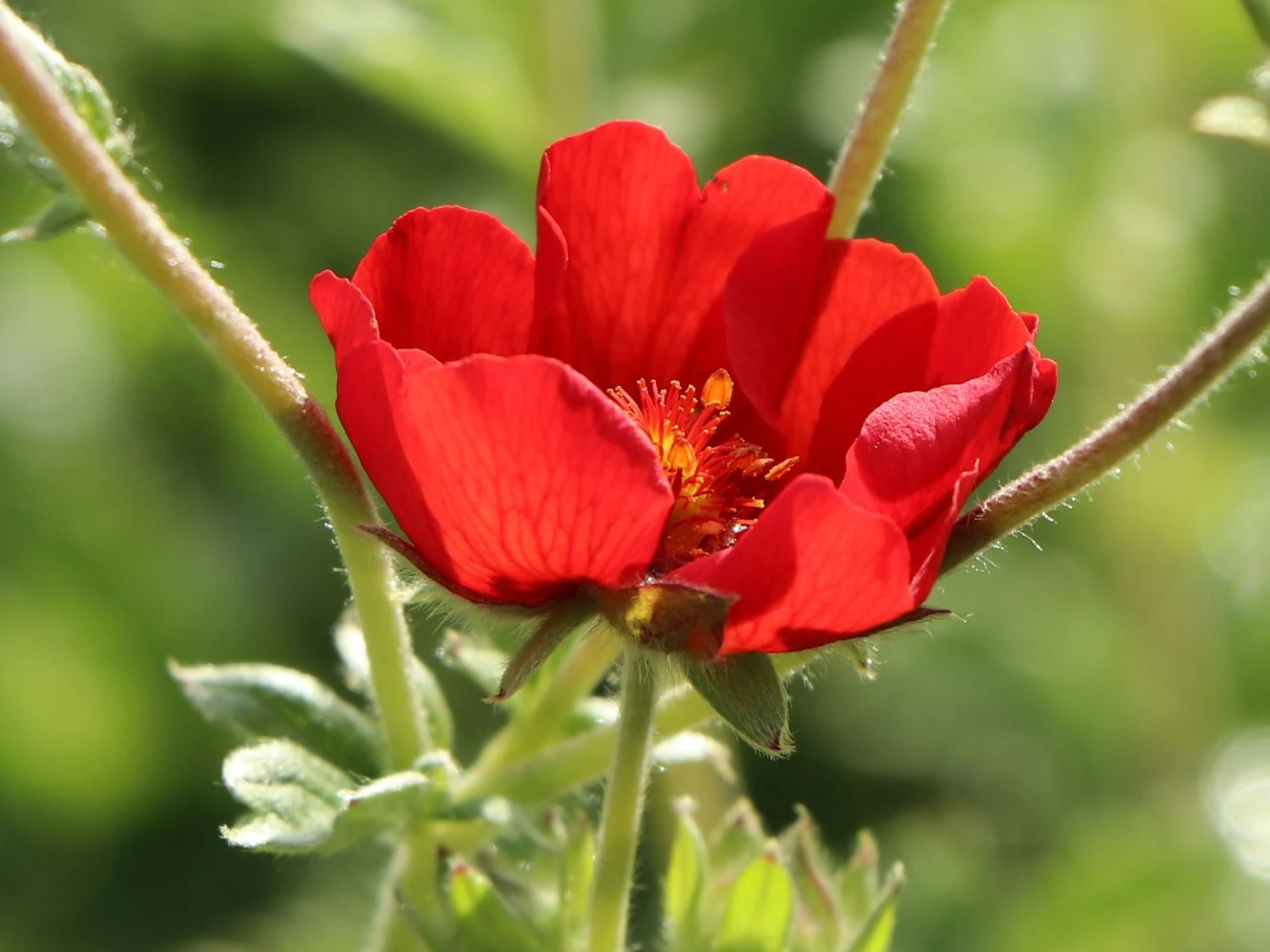 Das Fingerkraut ‚Gibson’s Scarlet‘ zeigt Blüten, die in schönstes Scharlachrot getaucht sind. Auf den ersten Blick erinnert die Blüte entfernt an herrlich blühenden Mohn. Nur sind die Blüten vom Fingerkraut ‚Gibson’s Scarlet‘ kleiner und zahlreicher. Die Blütenmitte der Blüten von (bot.) Potentilla atrosanguinea ‚Gibson’s Scarlet‘ ist schwarz. Die Staubgefäße leuchten gelblich‘-orange aus der schwarzen Blütenmitte heraus. Potentilla atrosanguinea ist als Blutrotes Fingerkraut bekannt und dient als nützliche Nährstaude für Bienen.