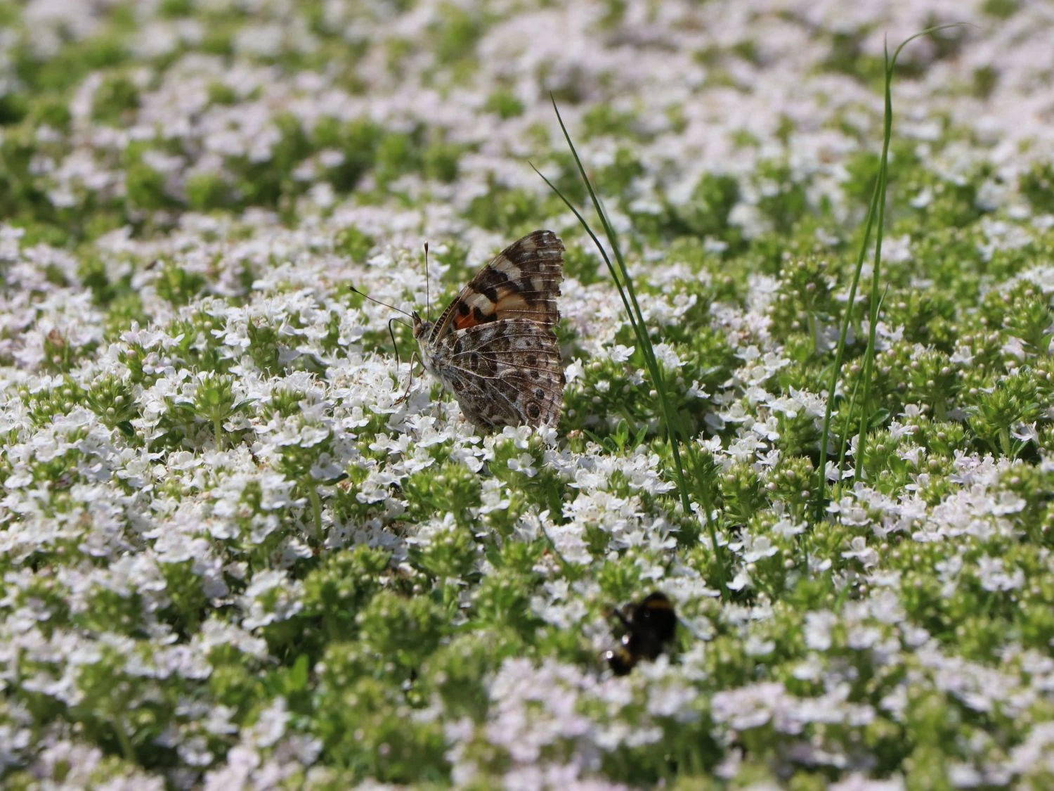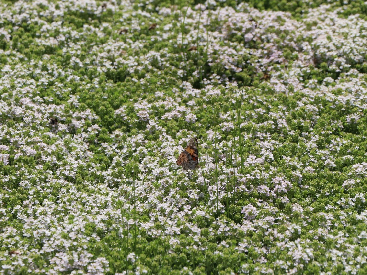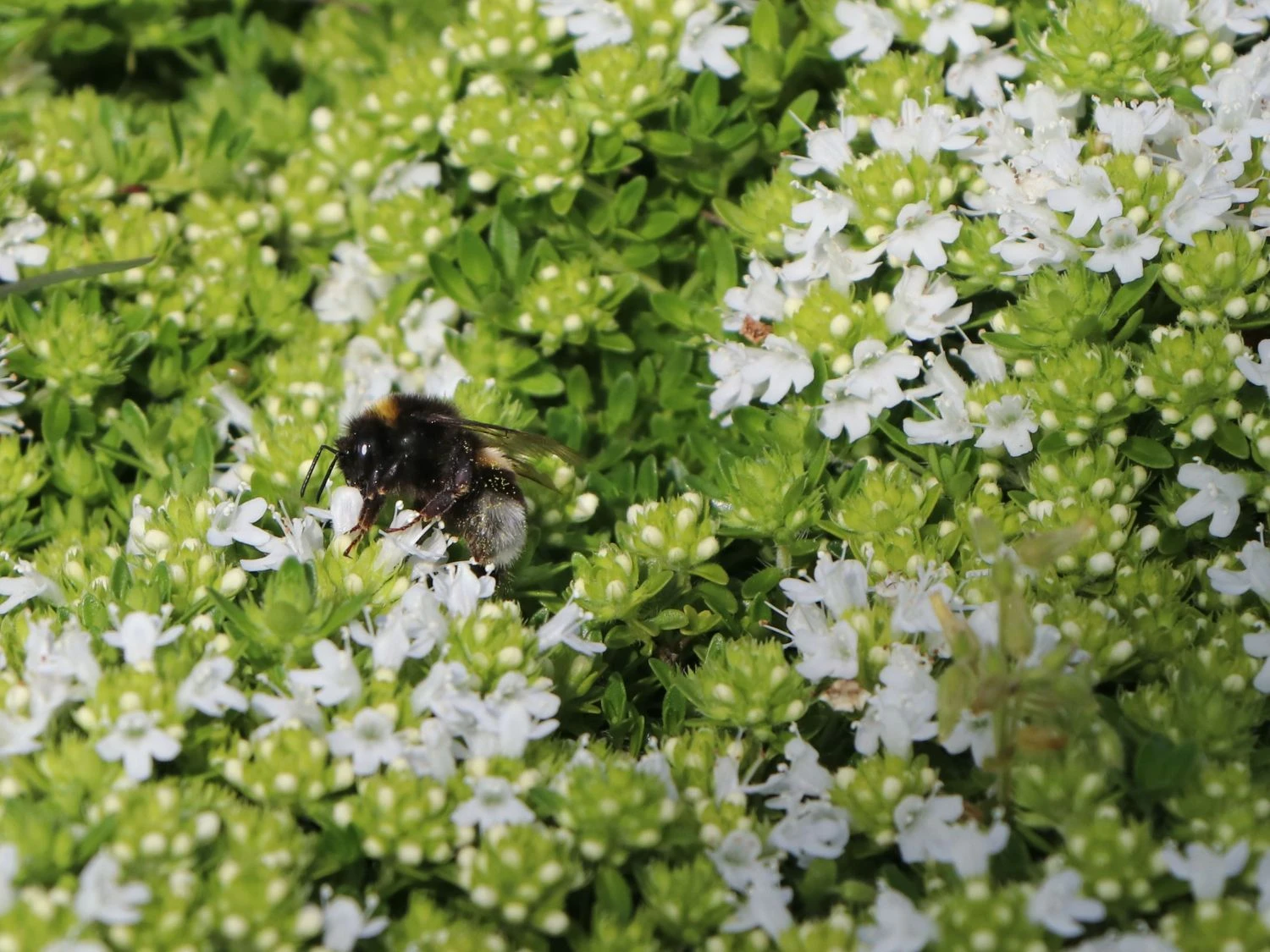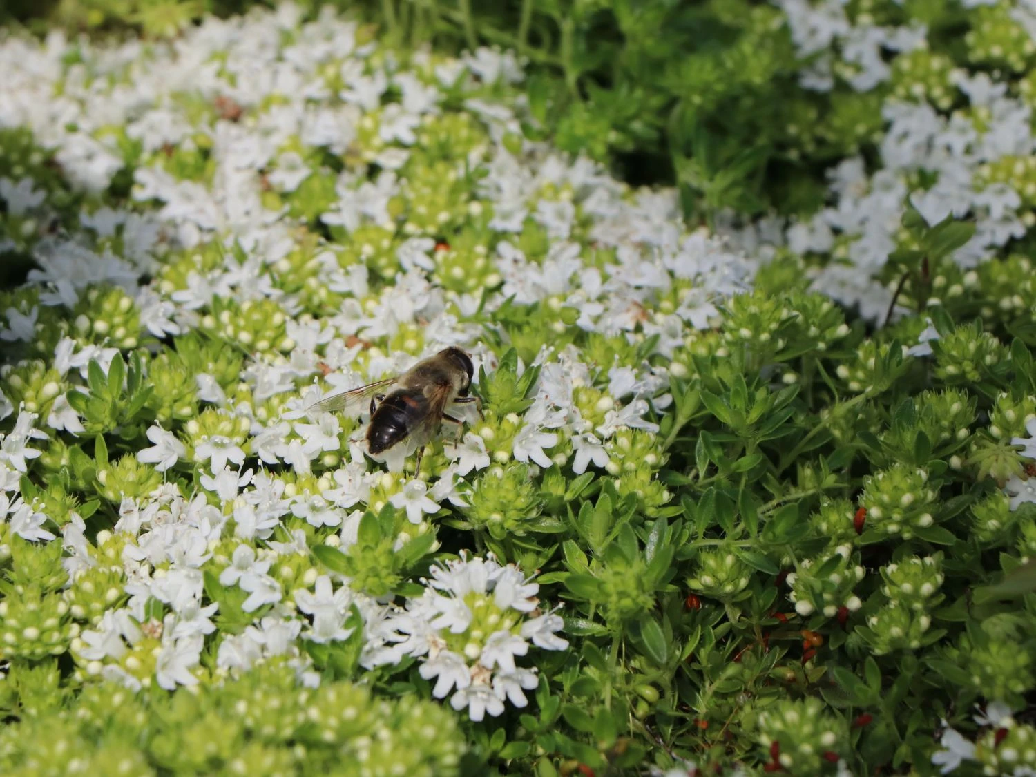 Die Blätter sind sehr zierlich und elliptisch geformt. Bei den Arten und Sorten von Thymus sind die Blattpolster das ganze Jahr zu sehen. Nur in der Blütezeit ist das Polster mit zahlreichen weißen Dolden übersät. Nicht nur in der Blütezeit duftet diese Staude sehr wohltuend. Besonders häufig ist der Frühblühende Thymian ‚Albiflorus‘ in Süd-, West- und Mitteleuropa zu finden. In kleinen Tuffs von 3 bis 10 Pflanzen oder in großen Gruppen von 24 bis 26 Pflanzen pro m² sind sie gut aufgehoben. So gedeiht diese Staude perfekt und ist sogar winterhart. An optimalen Standorten ist sie nicht sehr pflegeintensiv, sollte sie sich zu weit ausdehnen, lässt sie sich mit einem Spaten teilen und an anderer Stelle erneut einsetzen. Besonders beliebt bei Insekten und Faltern ist diese Staude wegen ihres intensiven Blüten- und Blattduftes und so verwandelt sie den Garten in eine duftende Parfümerie. Am besten eignet sich der Thymus in Steingärten. Der Frühblühende Thymian ‚Albiflorus‘ wächst kriechend über größere Steine und bildet auch hier ansehnliche Polster.