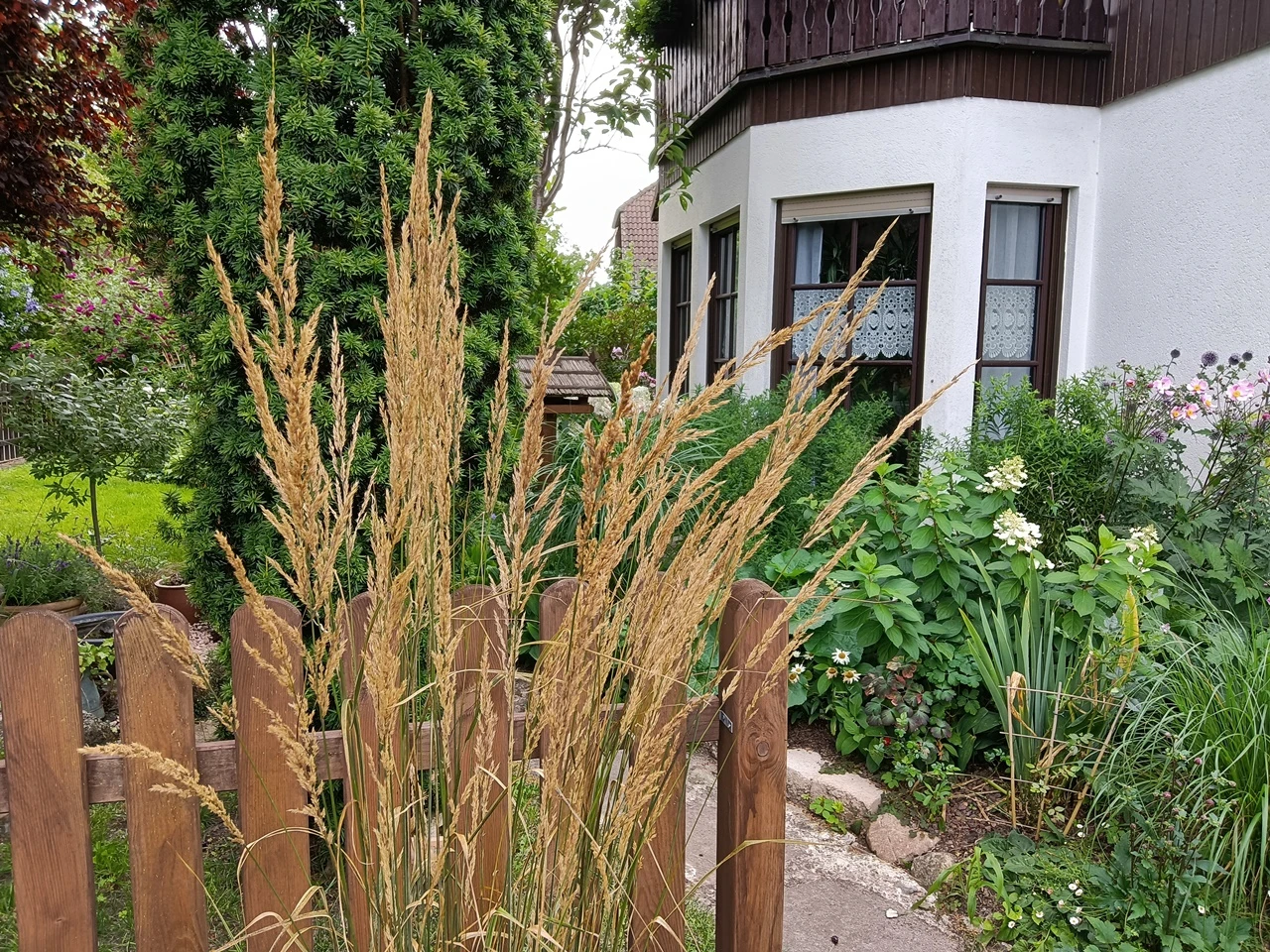 Ein herrlich geheimnisvolles Gefühl erzeugen wunderschöne Gräser. Das hoch wachsende Gestreiftblättrige Reitgras ‚Overdam‘ ist eines davon. Die ungewöhnlichen Blätter schmücken sich mit weißen Streifen. Daneben bilden die hübschen, rispenförmigen Blüten von (bot.) Calamagrostis x acutiflora ‚Overdam‘ einen zauberhaften Anblick.