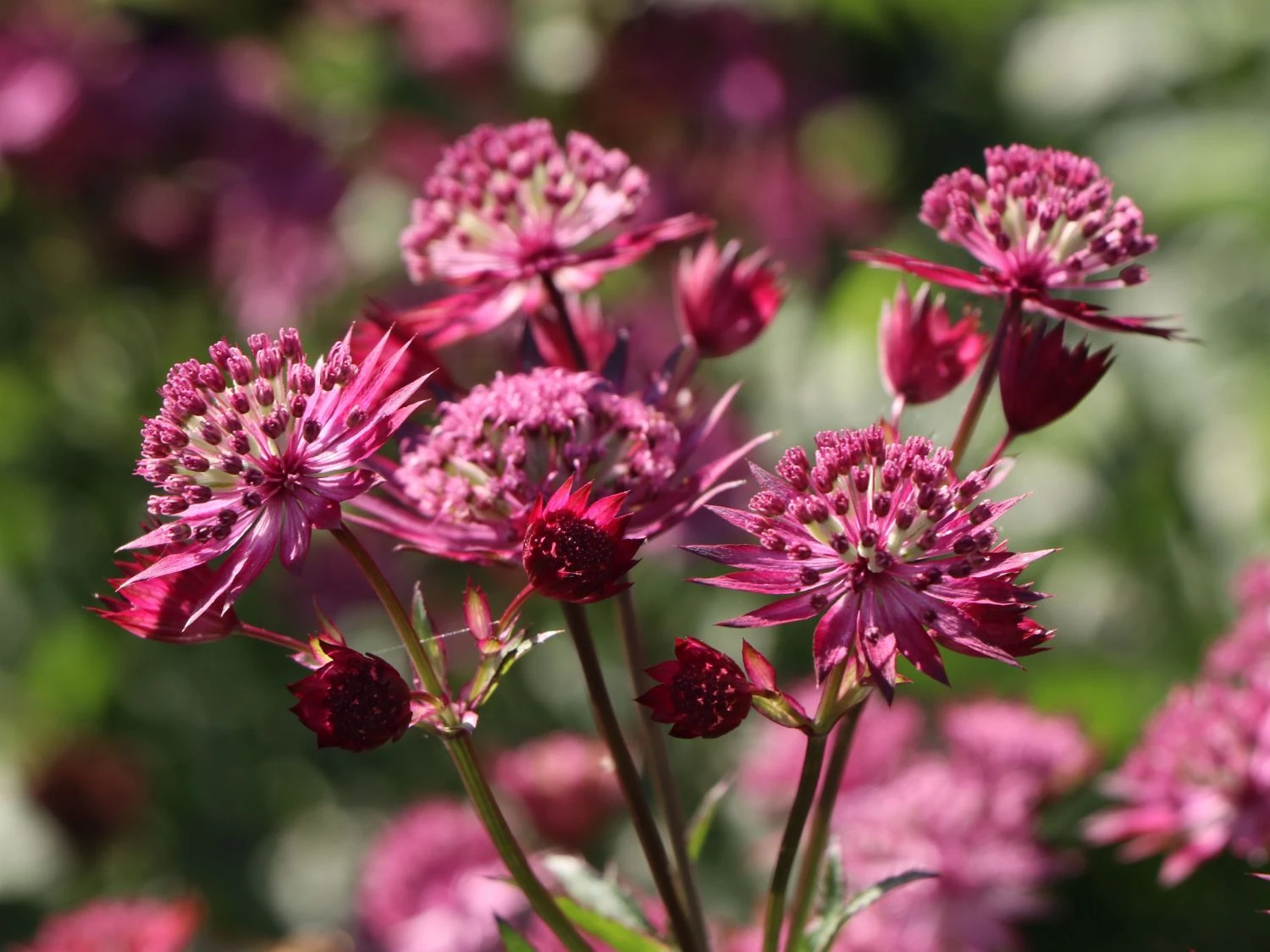 Die Große Sterndolde ‚Star of Love‘ begeistert den Betrachter mit ihrer mehrfarbigen Blütenpracht. Die Staude bildet im Hochsommer filigrane strahlenförmige Blüten. Diese sind dunkelrot mit einer weißen Mitte. Die (bot.) Astrantia major ‚Star of Love‘ verwandelt jedes Beet von Juni bis August in ein rotes Blütenmeer. Auch im Kübel und als Schnittblume für die Vase überzeugt die zauberhafte Pflanze. Die Große Sterndolde präsentiert sich unkompliziert und blühfreudig. Die große dichte Dolde bestehen aus vielen kleinen strahlenförmigen Blüten. Sie werden bis zu vier Zentimeter groß und ziehen mit ihrer Leuchtkraft alle Blicke auf sich. Auch Bienen, Hummeln und Schmetterlinge widerstehen den Blüten nicht. Entfernt der Gärtner den verblühten ersten Flor, erfreut ‚Star of Love‘ mit einer Nachblüte im September. Die strahlenförmigen Blüten stehen in dichten Dolden über dem grünen Blattwerk. Die Blätter sind in Abschnitte geteilt und bilden einen schönen Kontrast zu den Blüten. Im Frühjahr sind die grünen Blätter dunkel schattiert. Auch die standfesten Blütenstiele zeigen sich in einem dunklen Farbton.