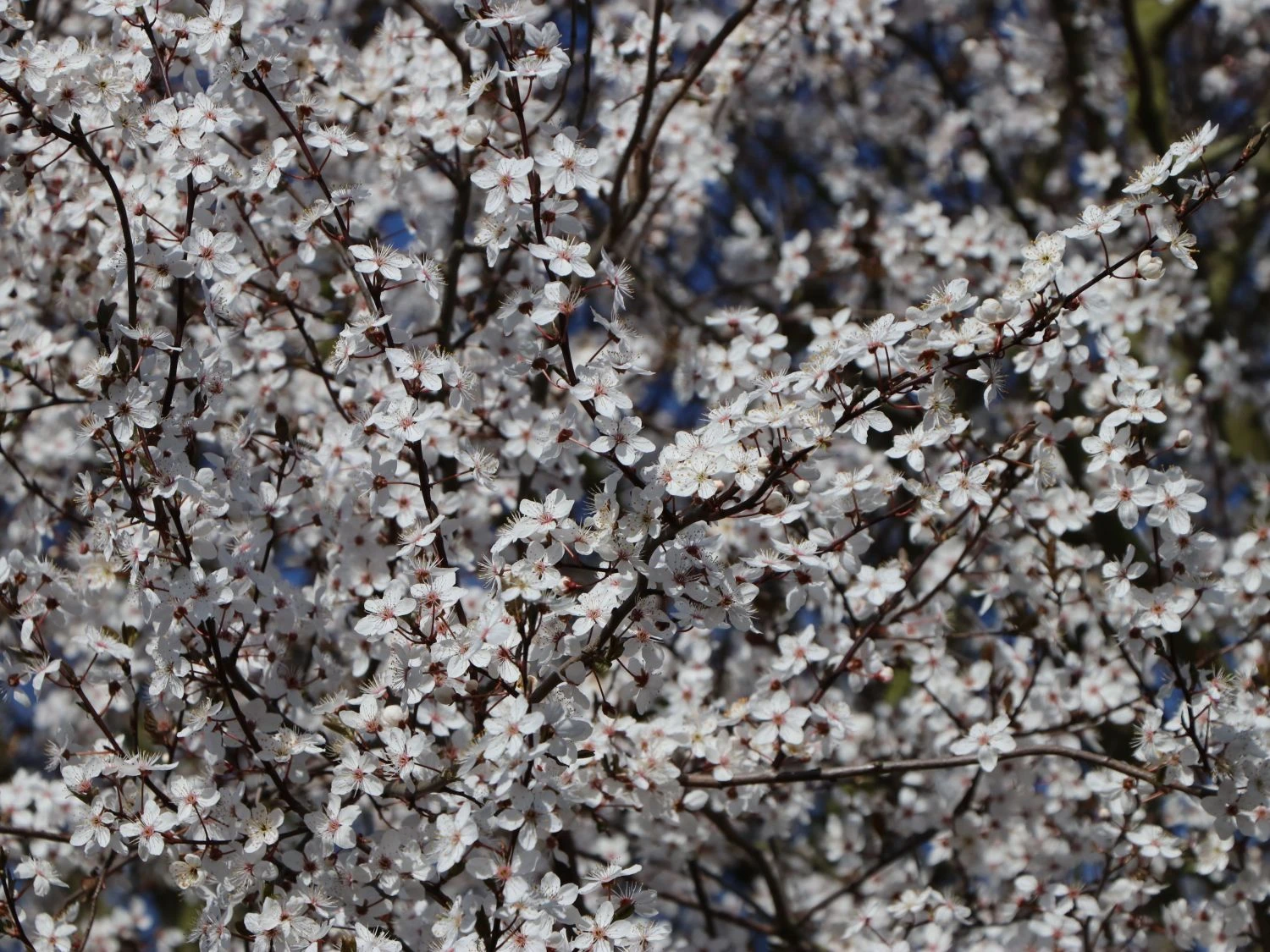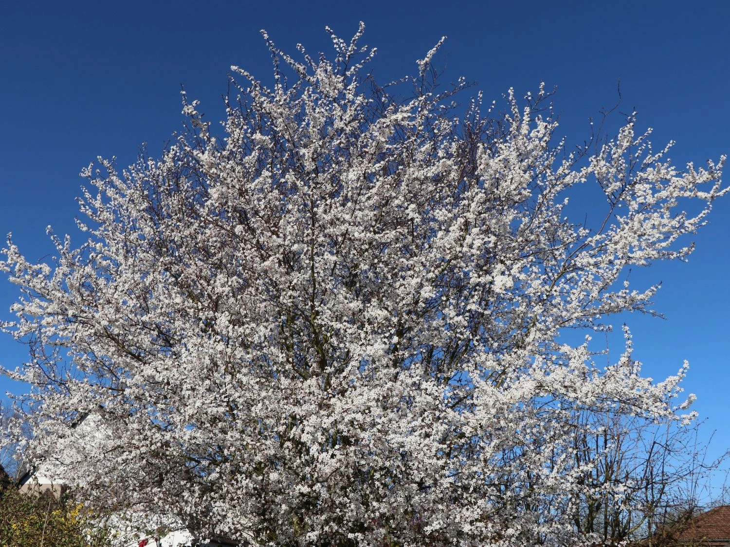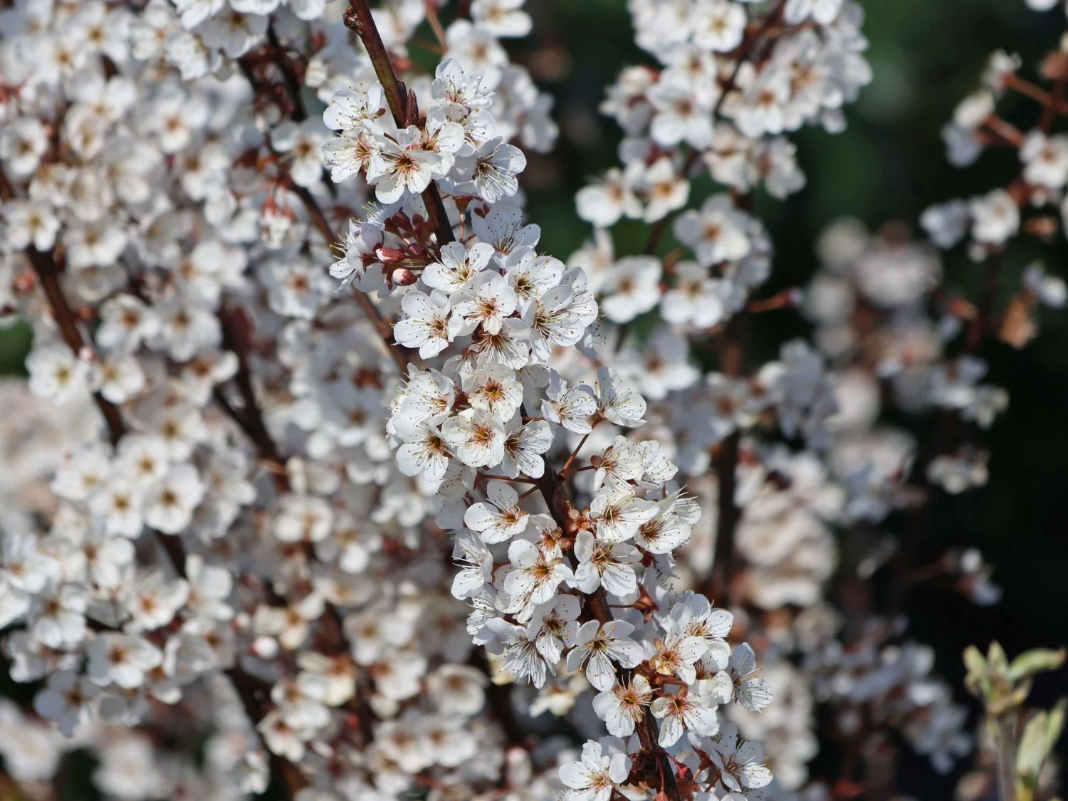 Die Großfrüchtige / Essbare Blutpflaume ‚Trailblazer‘ / ‚Hollywood‘ erfreut den Gärtner in jeder Hinsicht durch ihre Attraktivität. Das dunkle, kräftig rotbraune Laub des Baumes setzt im Garten herrliche Akzente. Ein Erlebnis ist die Blütezeit. Sie beginnt im zeitigen Frühjahr. Im März begrüßen erste Blüten die Frühlingssonne. Innerhalb kurzer Zeit legt die Blutpflaume, vielen auch als Kirschpflaume bekannt, zahllose entzückende Blüten nach. Weiß leuchten die zarten Blütenblätter. Filigrane Samenfäden recken sich aus der Mitte der Blüte. Anfang April steht (bot.) Prunus cerasifera ‚Trailblazer‘ / ‚Hollywood‘ in voller Pracht. Mit seinem Blütenreichtum zählt dieses Obstgehölz zu den Gewächsen, die dem Pflanzenfreund früh im Jahr Entzücken bereiten. Ist Ende April die Zeit der Blüte vorüber, bereitet die Großfrüchtige / Essbare Blutpflaume ‚Trailblazer‘ / ‚Hollywood‘ die Freuden des Sommers vor. Dann beginnt sie damit, ihre großen Früchte auszubilden. Bis zum September reifen sie zu einem schmackhaften Obst. Ab September sind die circa vier bis fünf Zentimeter messenden Früchte reif. Sie sind ein süßer und saftiger Genuss! Vom Strauch gepflückt und frisch verzehrt eine köstliche und gesunde Nascherei. Ihre schöne Optik entfaltet die Blutpflaume in der Nähe von Gehölzen mit kräftig grünem Laub. An ihrem Standort liebt sie es sonnig und warm.