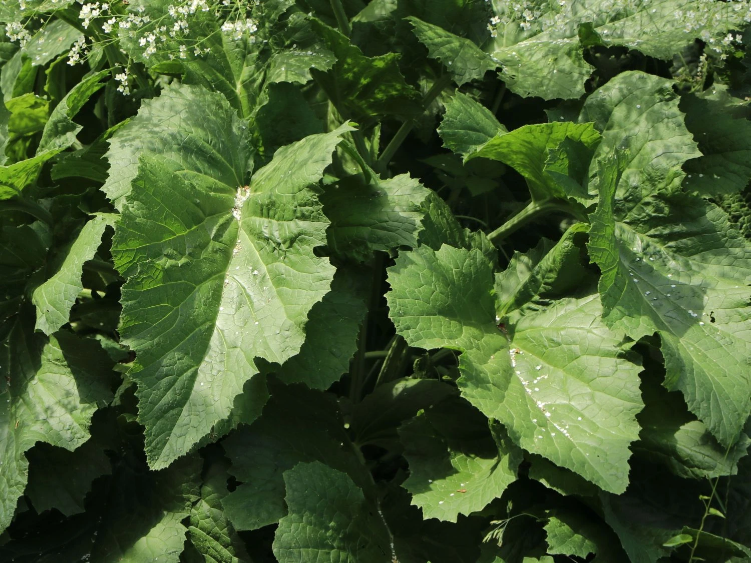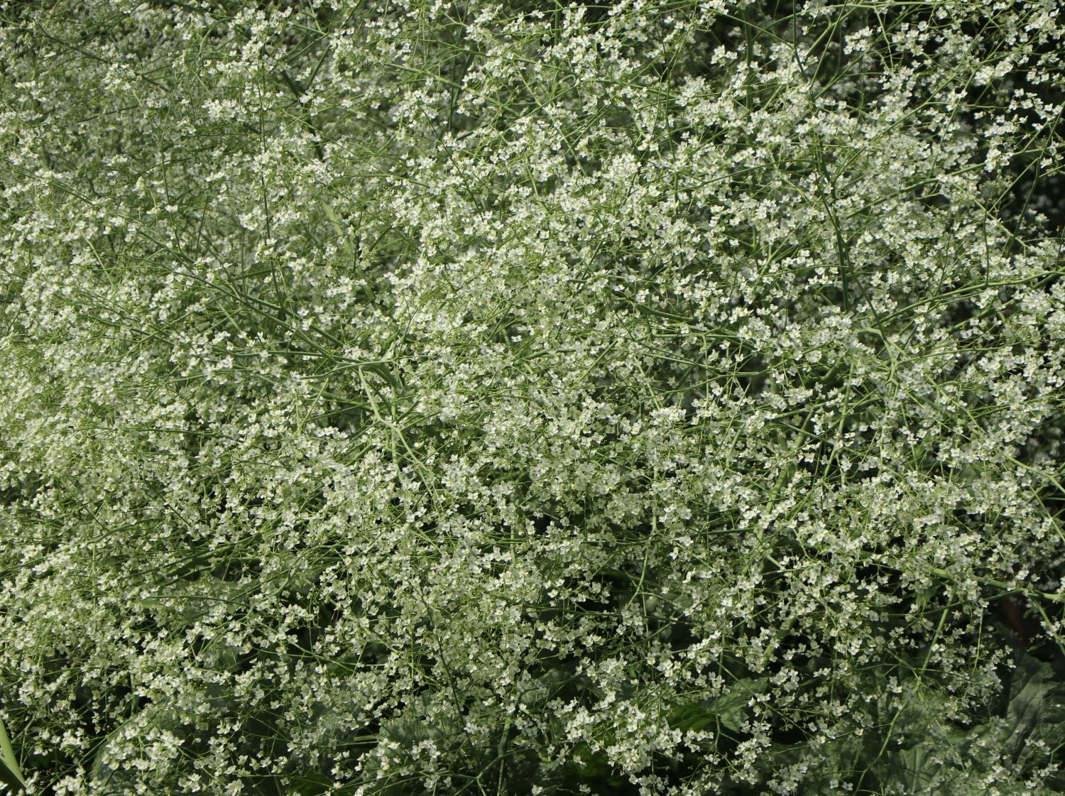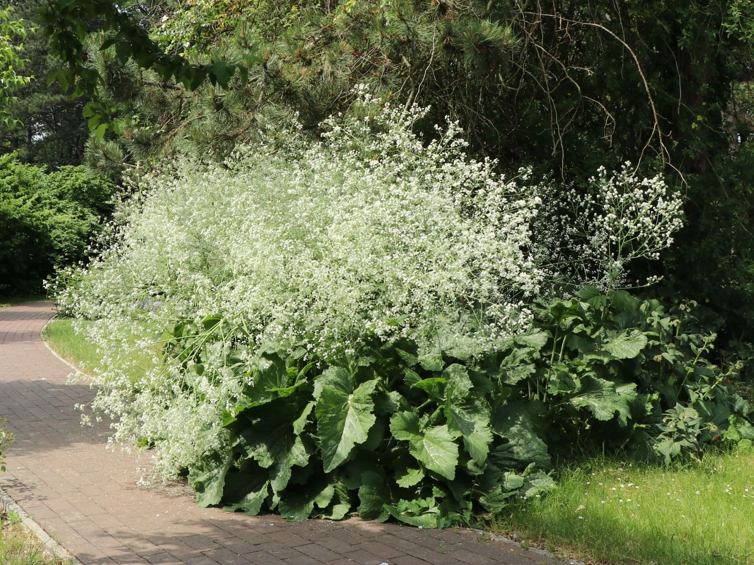 Mit dem erstaunlichen Kontrast zwischen markant kohlartigem Blattschmuck und feinen, duftenden Blütendolden fällt diese große Pflanze auf. Anders als der deutsche Name vermuten lässt, ist der Herzblättrige Blütenkohl nicht essbar. Eigentlich heimisch im nördlichen Kaukasus, gehört Crambe cordifolia zur Familie der Kreuzblütlergewächse. Der mannshohe Herzblättrige Blütenkohl ist nicht nennenswert kultiviert. Damit ist das sichtbar Ursprüngliche und der hohe Wuchs zu erklären. Durchweg erfreulich sind die zu berichtenden Aspekte über diese Staude. Sie ist von einer bemerkenswerten Schönheit, die Leichtigkeit und Lebendigkeit ausstrahlt. Der filigrane Blütenflor in Weiß erinnert, aus der Ferne betrachtet, an einen Brautschleier.
