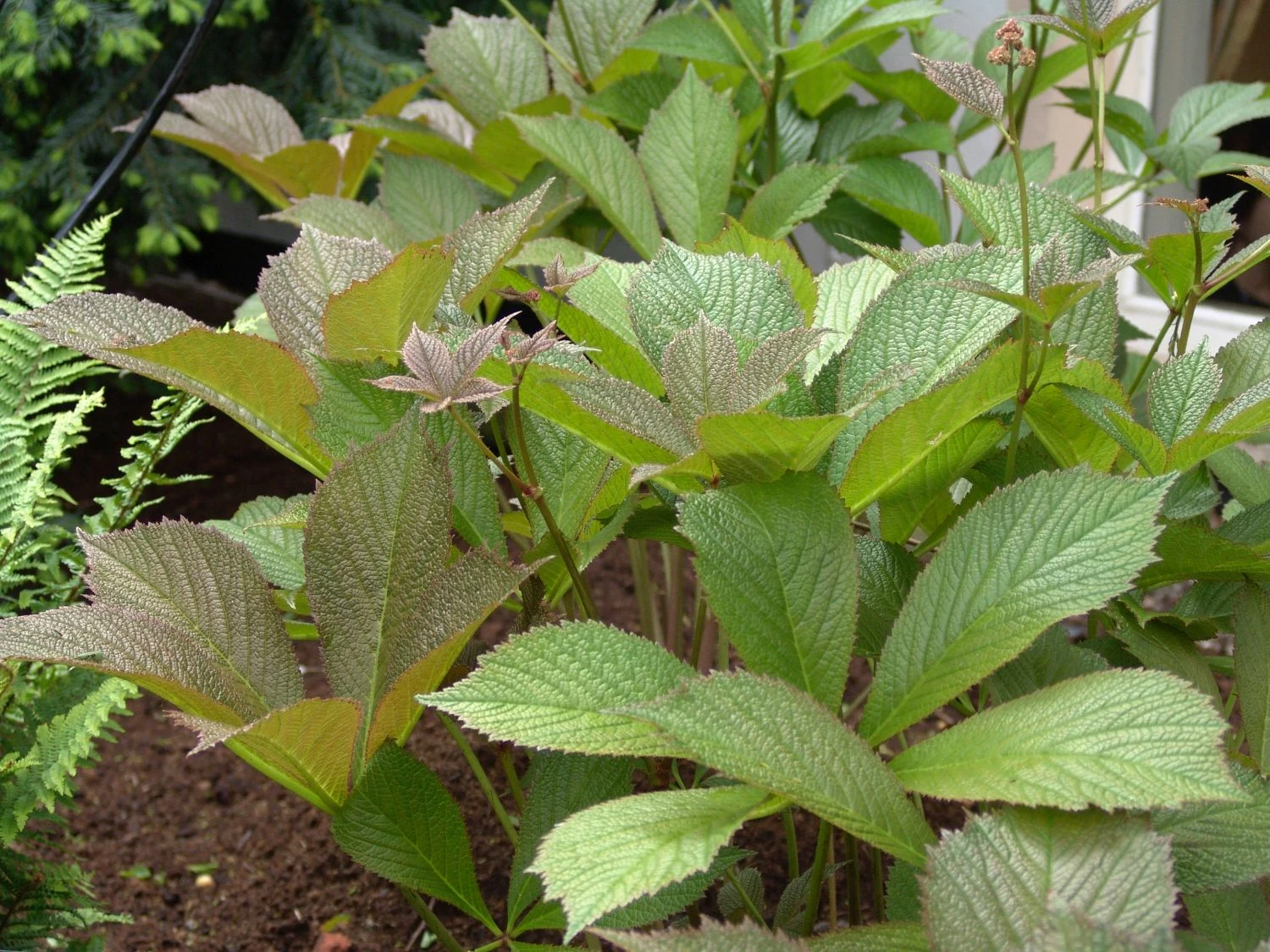 Das Prinz-Henri-Schaublatt gehört zur Familie der Steinbrechgewächse und stellt eine faszinierende und schattenliebende Blattschmuckstaude dar. Ihren Ursprung findet (bot.) Rodgersia henrici in den Gebirgsregionen Chinas und im Himalaya. Der rhizombildende, ausladende Wuchs erreicht Höhen von bis zu 1,50 m. An den schlanken Stielen des Prinz-Henri-Schaublatts sitzen große und handförmige Blätter, die in ihrer Form leicht an Kastanienblätter erinnern. Sie sind glatt und an den Rändern gesägt. Im Frühjahr, wenn sich die Blattknospen öffnen, sind die Blätter noch schokoladenartig gefärbt. Später wandeln sie sichin ein Dunkelgrün und bezaubern im Herbst in einem feurigen Rot.