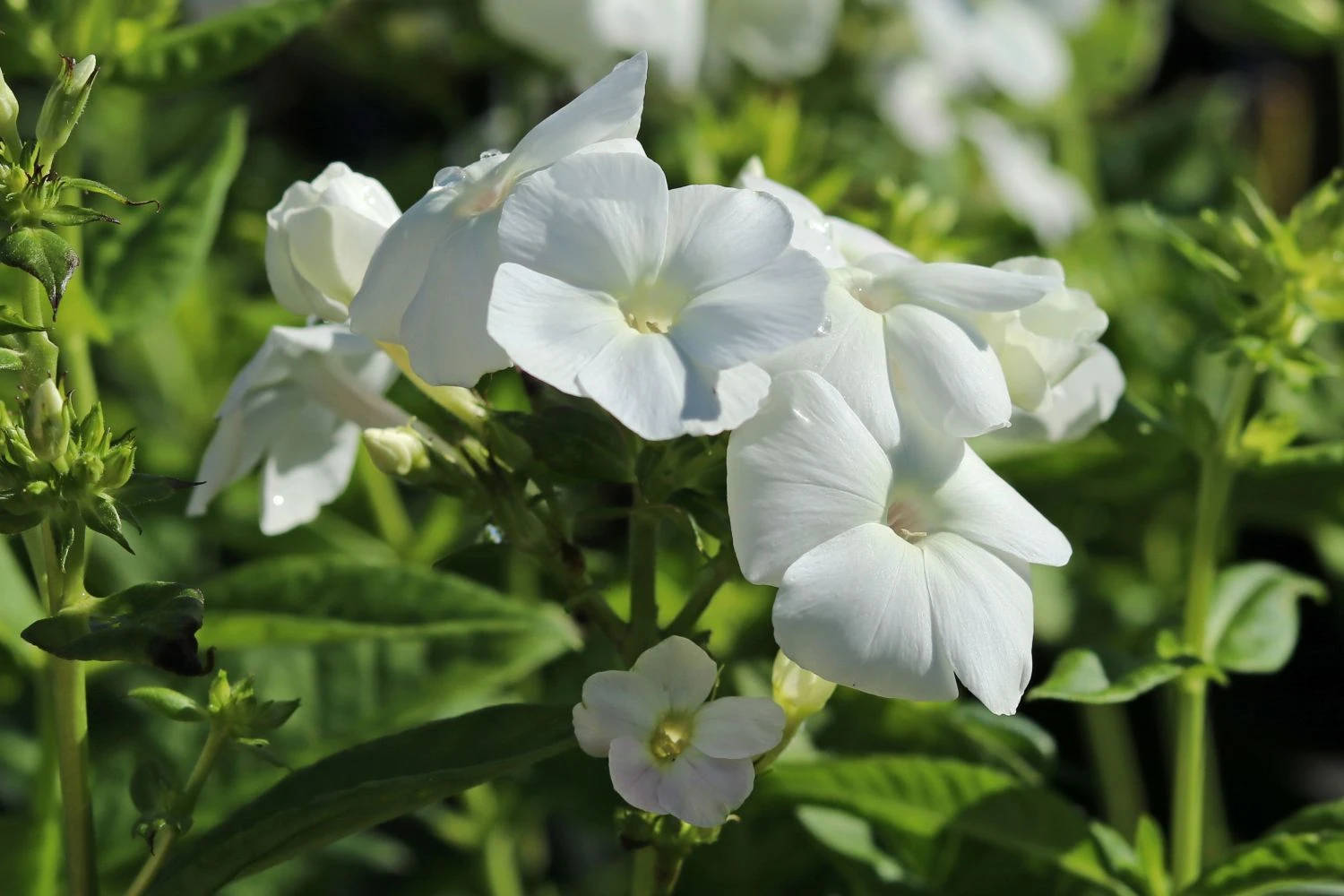 Die Hohe Flammenblume ‚Danielle‘ mit ihren vielen schneeweißen Blütendolden ist eine Bereicherung für jedes Staudenbeet. In kleinen Gruppen derselben Farbe oder aber kombiniert mit anderen Phlox-Sorten, beispielsweise welchen in Blau oder Rot, erfreut sie den ganzen Sommer über im Garten das Auge der Betrachters. Auch Kornblumen oder Dahlien können in ihrer Nachbarschaft wunderschön aussehen. Die Staude macht allerdings auch vor vielen immergrünen Pflanzen wie Lebensbäumen einen sehr guten Eindruck. Der Phlox paniculata ‚Danielle‘, wie die Pflanze mit botanischem Namen heißt, eignet sich auch sehr gut als Schnittblume, denn er blüht bereits im Juni und oft bis in den Oktober hinein immer noch, wenn die abgeblühten Blütendolden regelmäßig zurück geschnitten werden und die Stauden einen optimalen Standort und gute Bodenbedingungen haben. Mit den dicht gefüllten weißen Blütendolden lassen sich zusammen mit anderen Schnittblumen sehr schöne Sträuße für die eigene Vase oder zum Verschenken zusammenstellen.