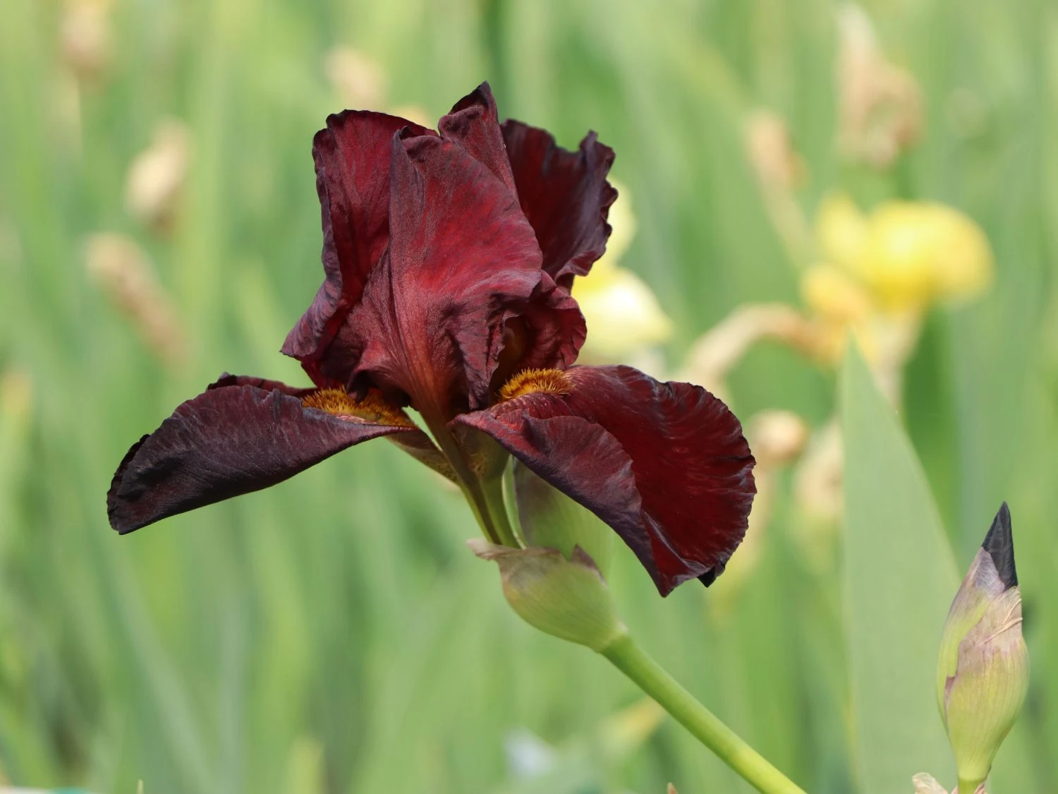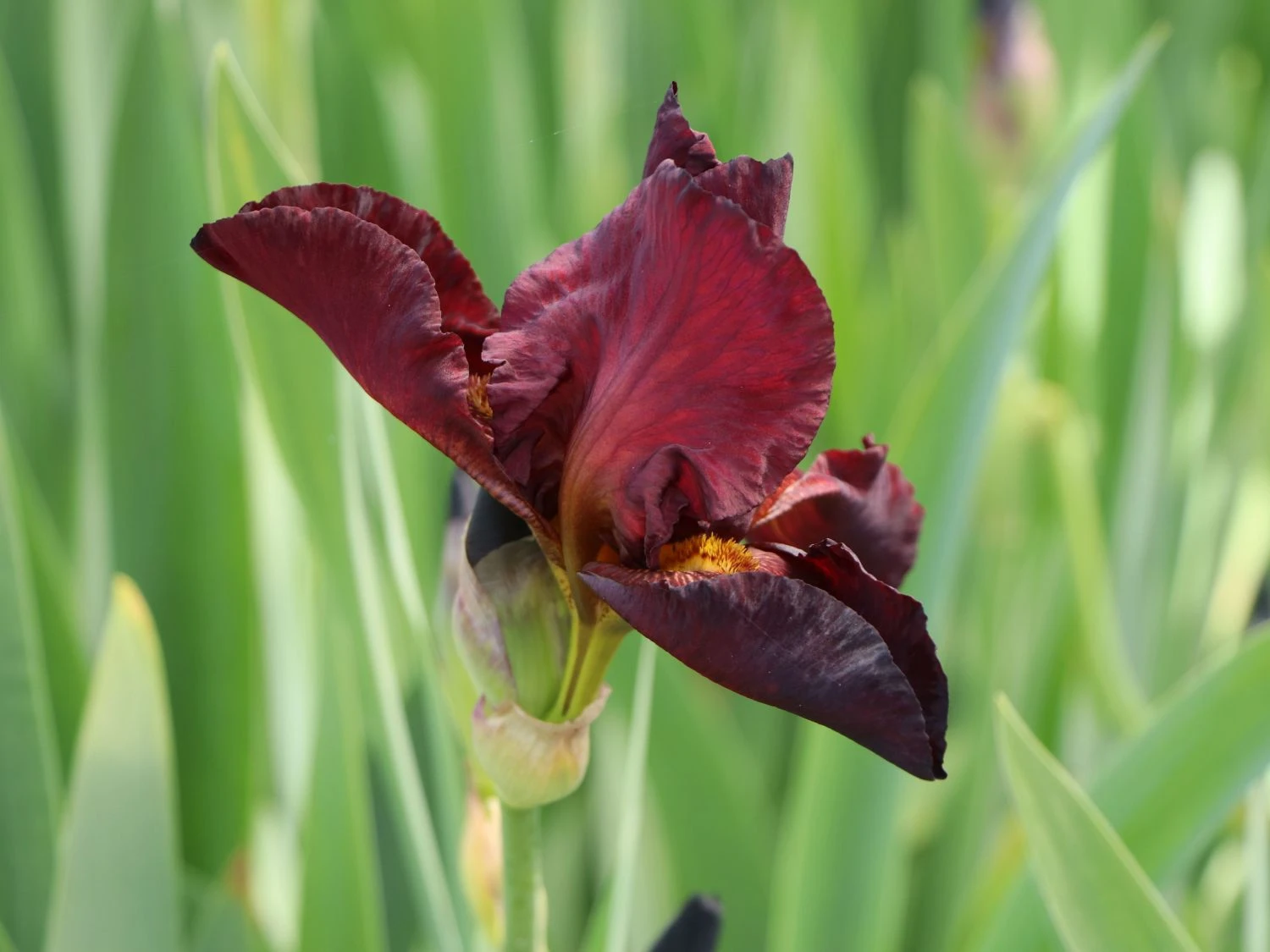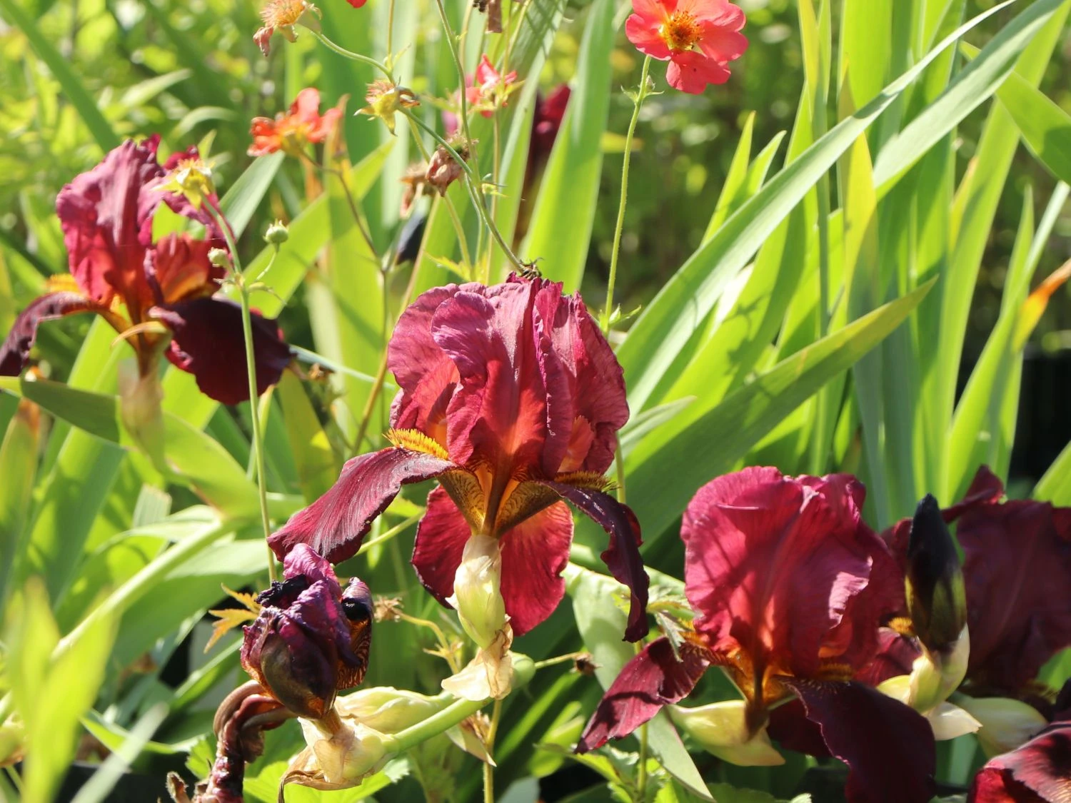 Am besten steht die Hohe Schwertlilie ‚Caldron‘ in einem sonnigen Bereich und genießt dort die warmen Strahlen. Die großartige Staude lässt sich sowohl einzeln als auch in kleinen Gruppen einsetzen. Sie zeigt sich gesellig und lässt sich gerne auf eine Nachbarschaft mit mehreren Exemplaren ein. Dafür ist ist Iris x barbata-elatior ‚Caldron‘ bei einem Pflanzabstand von rund 35 bis 45 cm zu kleinen Tuffs von bis zu maximal fünf Pflanzen einzusetzen. Die braunroten Blüten sind zweikreisig und setzen sich aus den Dom- und Hängeblättern zusammen. Das grüne, schwertförmig-zugespitzte Blattwerk bildet einen schönen Kontrast zur Blütenfarbe. Die sommergrünen Blätter fallen zum späten Herbst ab. Um Iris x barbata-elatior ‚Caldron‘ ein langes Leben zu ermöglichen, ist sie möglichst nicht umzupflanzen. Die abgeblühten Blütenstände sind regelmäßig auszuschneiden oder zu auszubrechen, um eine weitere Blütenbildung zu fördern. Ansonsten ist guten Standorten keine weiter Pflege nötig. Diese zierende Staude ist gut winterhart und benötigt bis zu Temperaturen von -28°C keinen Winterschutz. Sie zieht sich in ihre Rhizome zurück, gut durch die kalten Monate zu kommen.