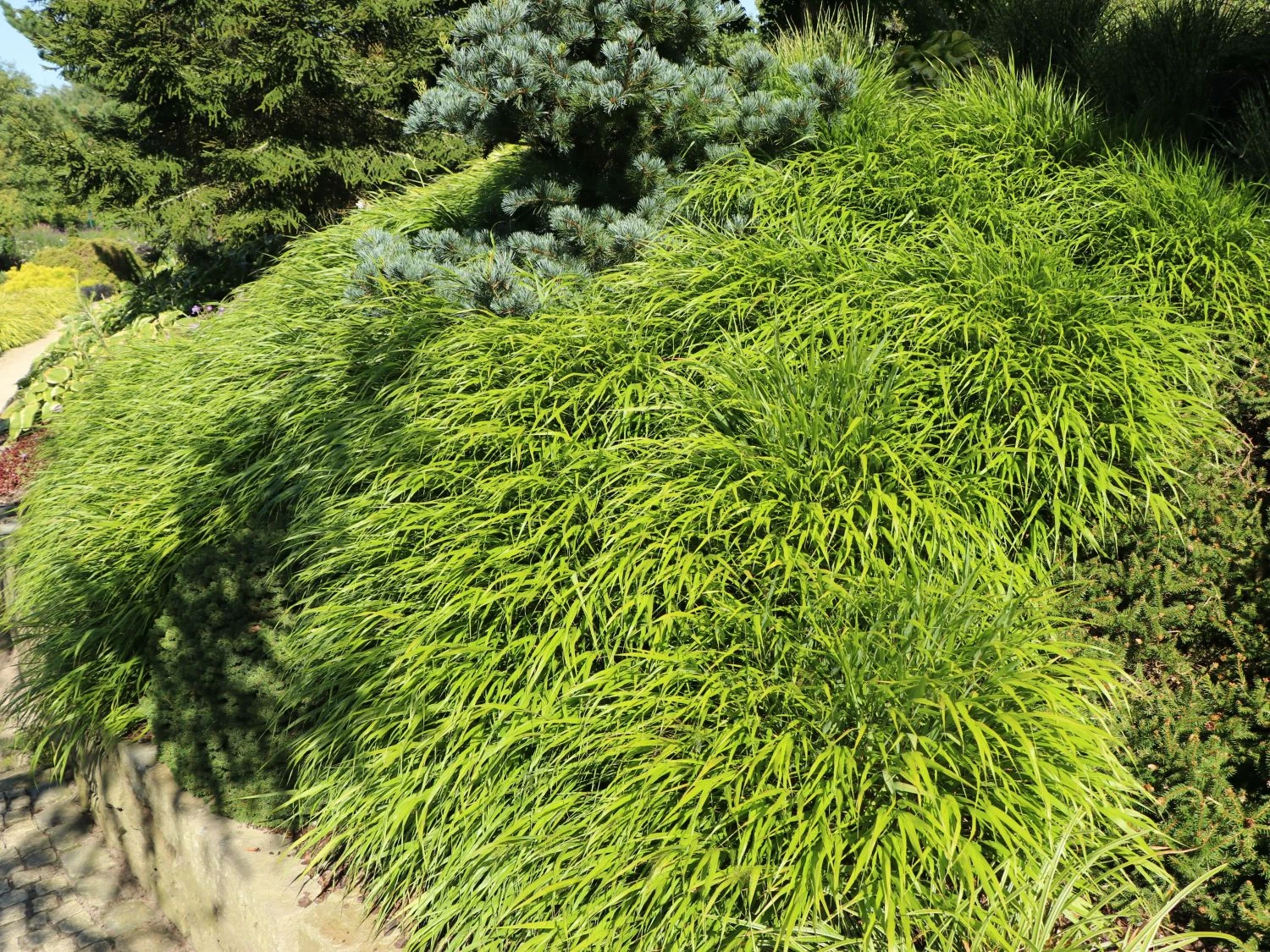 Mit seinen hohlen und knotigen Halmen, zählt das Japan Berggras zur Familie der Süßgrasgewächse. Wie sein Name schon andeutet, stammt es aus Japan. Es kommt ursprünglich vom Mount Hakone auf der Hauptinsel Honshu. Dort wächst das Japan-Zwergschilf in lichten Wäldern und an Waldrändern. Aus diesem Grund bevorzugt es in unseren Gärten einen halbschattigen bis absonnigen Standort. Das berücksichtigt der Gärtner bei der Pflanzung. Am besten gedeiht Hakonechloa macra auf frischen bis feuchten Böden. Die Erde ist locker, nährstoff- und humusreich ideal für das Wachstum der Pflanzen dieser Art. Sind diese Voraussetzungen gegeben, entwickelt sich das Japan-Berggras zu einem prächtigen Horst. In Japangärten bildet es einen markanten Blickfang und fügt sich in jedem anderen Garten ebenso harmonisch ein. Der Austrieb erfolgt im späten Frühjahr. Die Wartezeit belohnt das Japan Berggras mit Blättern, die in einem frischen Grün das Auge erfreuen. Die langen Blätter bilden in ihrer Fülle einen dichten, überschwänglich fallenden Horst.