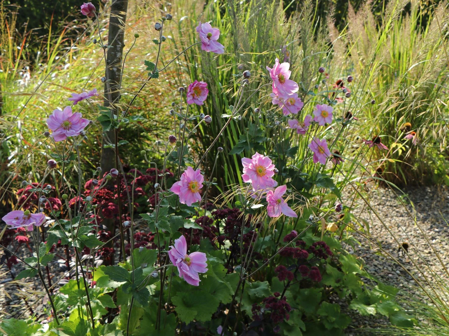 Halbschattige Bereiche bekommen Glanz, Farbe und einen beschwingten Ausdruck durch diese großen tanzenden Blüten auf ihren langen Stielen. Als Leitstaude ist sie empfehlenswert durch ihren breitbuschigen Wuchs und ihre Höhe. Angenehme Nachbarn sind Astilben, attraktive Gräser wie Rutenhirse, Lampenputzergras oder Chinaschilf sowie Silberkerzen. Vor dunklem Hintergrund gepflanzt, wirkt die ‚Königin Charlotte‘ herrlich eindrucksvoll. Auch einzeln oder in kleinen Tuffs von einer bis drei, maximal fünf Pflanzen, gibt sie ein wunderschönes Bild im Garten. Ebenso in kleinen Trupps von drei bis fünf, maximal zehn Pflanzen wirkt sie einzigartig. Mit einem Abstand von 40 bis 50 Zentimeter, finden vier bis sechs Pflanzen auf einem Quadratmeter ausreichenden Platz. Auch als Schnittblume ist die Japan-Herbst-Anemone eine gute Wahl. Als Arrangement in der Vase zaubert sie königliches Flair in die eigenen vier Wände.