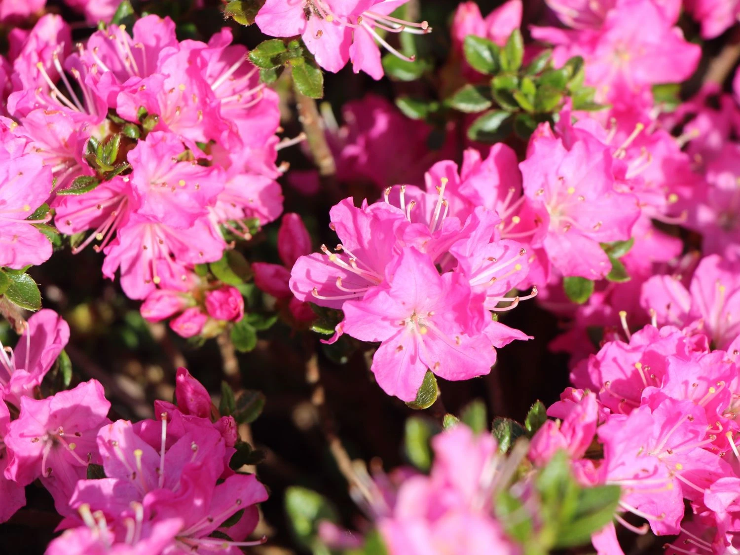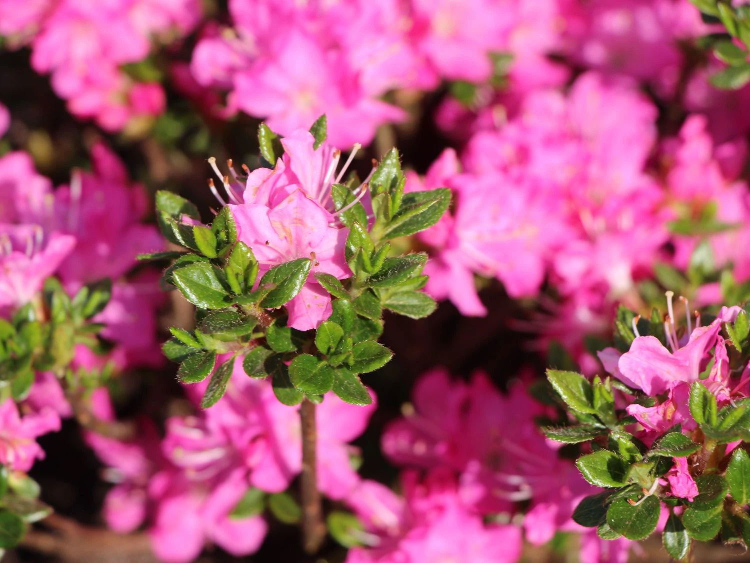 Die Japanische Azalee ‚Maiogi‘ gehört zu den eher kleinblumigen Sorten. Ihre Blüten sind reinrosa, im Verblühen heller. Sie haben einen Durchmesser von 1,8 bis 2 cm.