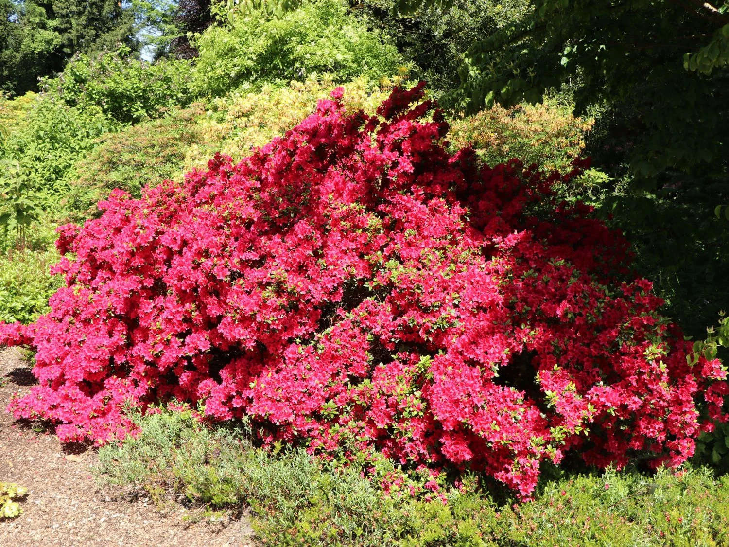 Das sattgrüne Laub bietet für den dichten Flor den perfekten Hintergrund. Bei der Japanischen Azalee ‚Rubinstern‘ handelt es sich um eine sehr schwachwüchsige Sorte. Das Blütengehölz wächst flachkompakt auf eine Breite von rund 70 bis 90 cm und erreicht eine Wuchshöhe von 50 bis 70 cm. Diese Dimensionen nimmt Rhododendron obtusum ‚Rubinstern‘ gemächlich an. Nach circa zehn Jahren im Garten entwickelt sich die Pflanze auf etwa 80 cm Höhe. Im Winter trotzt das Gehölz Temperaturen von bis zu -22 °C. Bereits seit 1975 bewährt sich die Japanische Azalee ‚Rubinstern‘. Eine gelungene Kreation des renommierten Rhododendron-Züchters Hans Hachmann!
