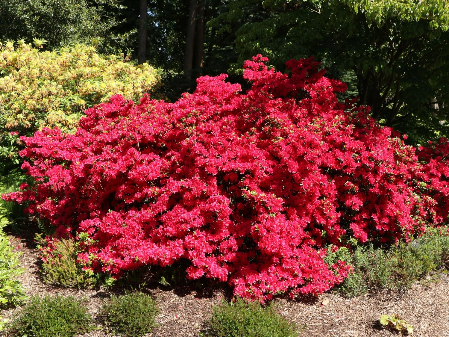 Die Japanische Azalee ‚Rubinstern‘ verwandelt den Garten zur Blütezeit in einen fulminanten Blütentraum. Überdicht bedecken rubinrote Blüten den Strauch und schenken ihm ein regelrechtes Leuchten. Wie passend, dass die Blüten sternförmig sind, denn so kam (bot.) Rhododendron obtusum ‚Rubinstern‘ zum klingenden Sortennamen. Die Blütentage dieser Sorte liegen zwischen dem 24. Mai und dem 10. Juni. Spektakulär öffnen sich die Knospen der Japanischen Azalee ‚Rubinstern‘ zu Sternen und geben den Blick auf die attraktive Zeichnung in Dunkelrot frei.