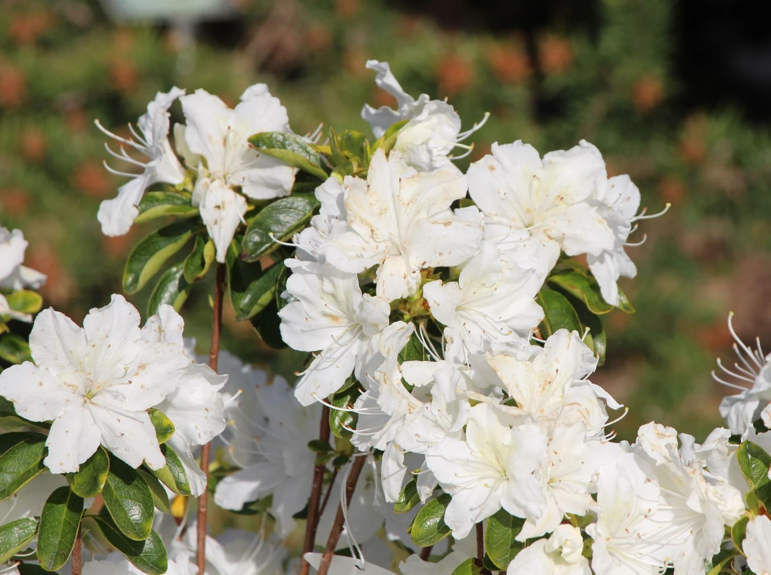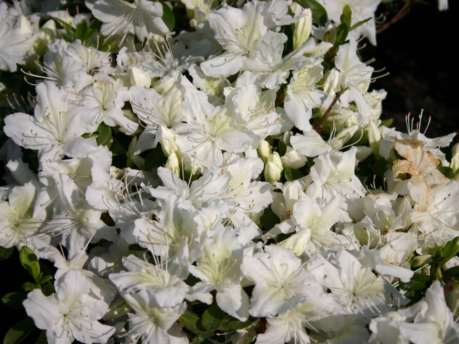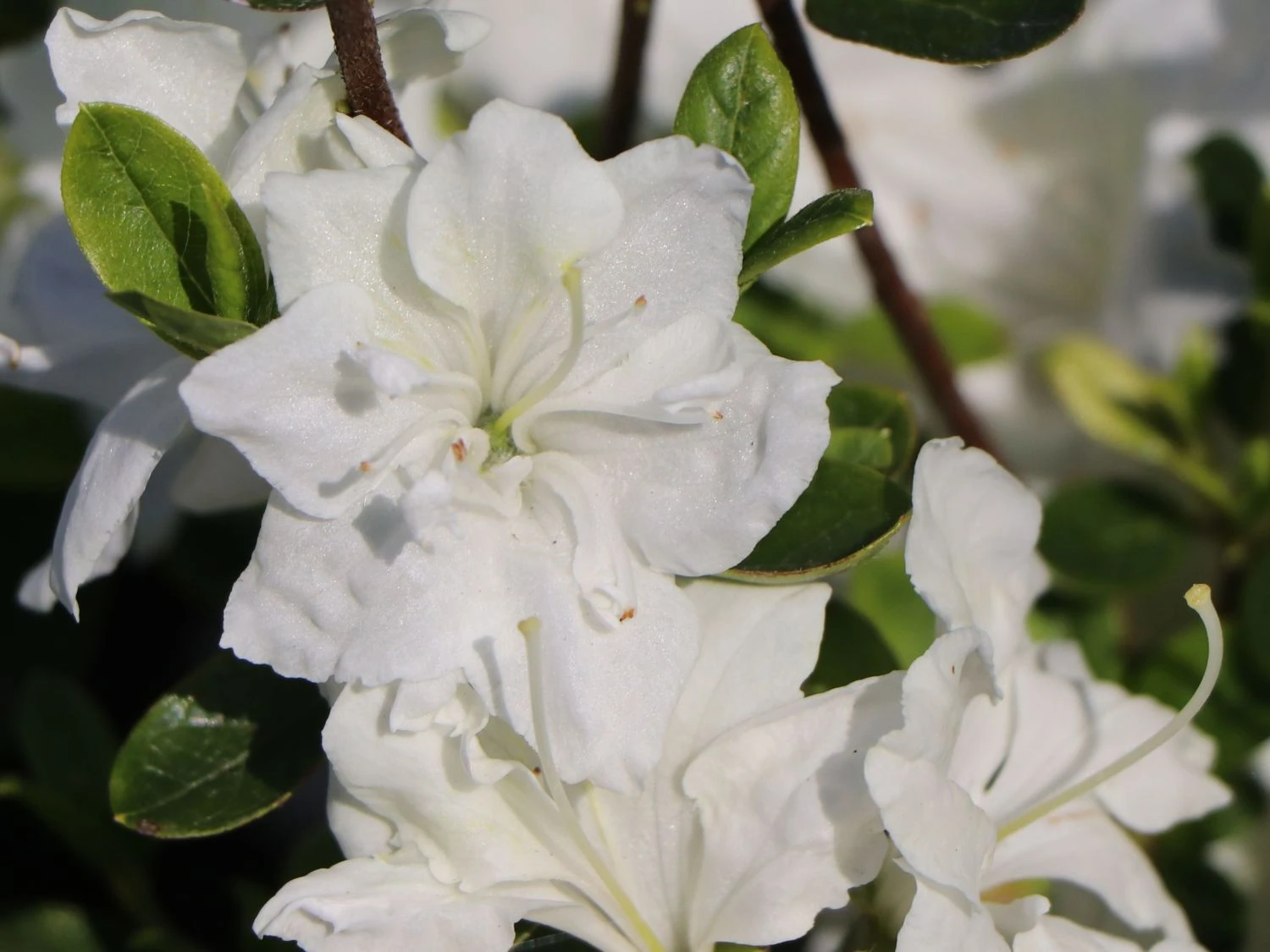 Die Japanische Azalee ‚Schneesturm‘ ist das Gegenteil vom ungeliebten Winterchaos und dennoch erinnert die reinweiße Blüte an Schnee. Die Blütenränder kräuseln sich wie sanfte, malerische Schneeverwehungen. An den oberen Kronblättern schimmern sie hellgrün. Die Blüten öffnen sich weit und stehen dem Betrachter entgegengestreckt. Die Blütentage sind von Ende Mai bis Anfang Juni, genauer vom 26. Mai bis 08.Juni. Die Blätter sind eiförmig, ledrig und glänzend frischgrün. Der Rhododendron obtusum ‚Schneesturm‘ ist wintergrün. Die maximalen Ausmaße, die die Pflanze nach rund 10 Jahren erreicht, beträgt 100 cm in der Breite und 75 cm in der Höhe. Der Wuchs der Japanischen Azalee ‚Schneesturm‘ ist gleichmäßig breit-rund, dicht-buschig und gut verzweigt.