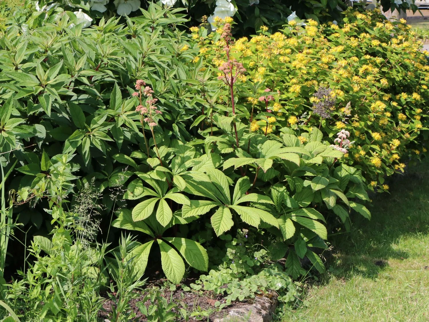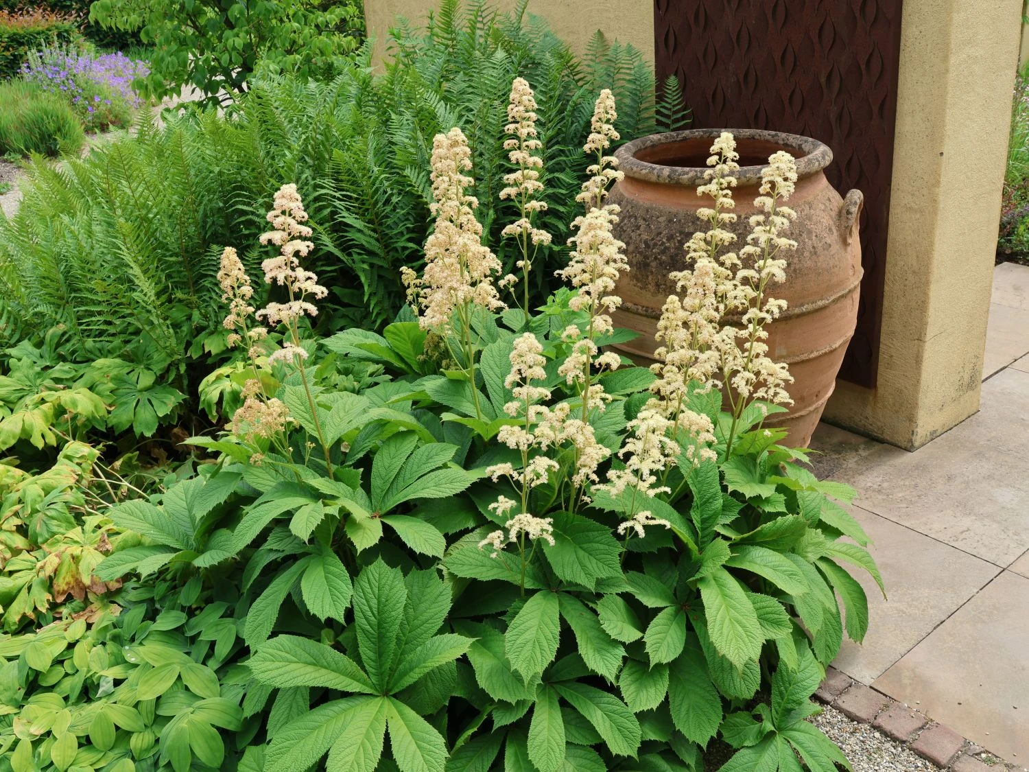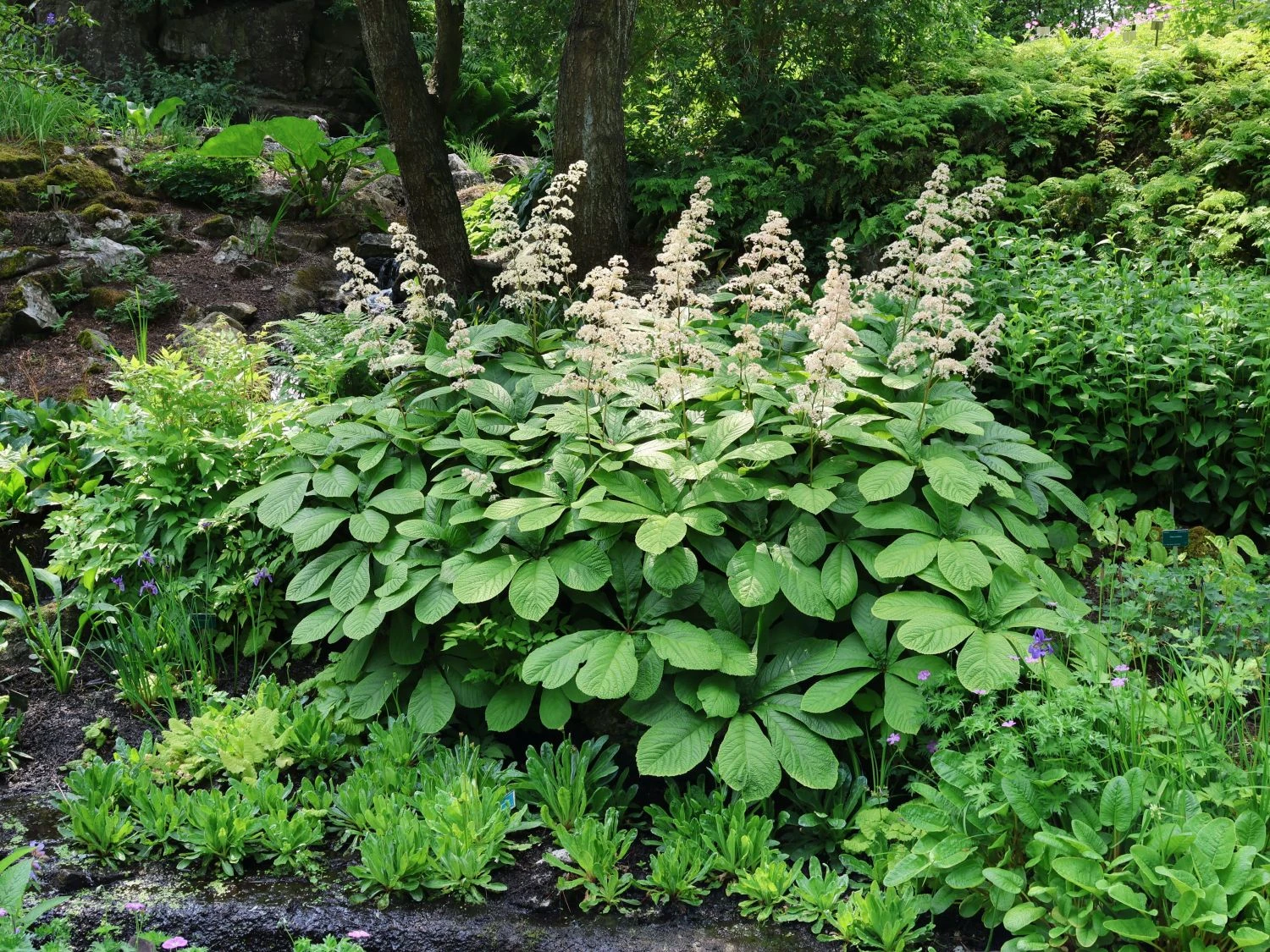 [p]Das Kastanienblättrige Schaublatt hat stark geäderte, dunkelgrüne Blätter, die denen der Rosskastanie ähneln. Diese Pflanze fällt durch ihr prächtiges Laub und die grünlich-weißen Blütenrispen auf. Sie beeindrucken vor allem mit ihrer überdimensionalen Größe. Neben den beeindruckenden Blättern sind die grünlich-weißen Blütenrispen eine traumhafte Augenweide! Sie thronen in der Zeit von Juni bis Juli über den Blättern. Bestehend aus vielen kleinen sternchenförmigen Einzelblüten, bilden sie einen wunderschönen Kontrast zu den riesigen Blättern. Aufgrund des ausladenden Wuchses, eignet sich (bot.) Rodgersia aesculifolia vor allem als Solitärpflanze im Gehölzrand oder im Uferbereich von Bachlauf- und Teichanlagen. Auch in kleineren Gruppen wirkt Kastanienblättriges Schaublatt wundervoll. Mit Riesen-Segge, hoher Prachtspiere, den glänzenden Wedeln des Glanz-Schildfarns, Geißbart oder Waldglockenblume bildet sie harmonische Arrangements. Zudem ist diese Pflanze ein wunderschöner Blickfang in der Nachbarschaft zu größeren Bäumen sowie unter lichten Sträuchern. Ursprünglich kommt Kastanienblättriges Schaublatt aus China. Dort ist sie in Feuchtwäldern, auf Bergwiesen, an Flussufern und Bergbächen zu finden. Das Gewächs gehört zu den ausdauernden Stauden. Sie bildet Horste und wächst aufrecht und ausladend. Dabei stehen die fünf- bis siebenteiligen Blätter in einer Höhe von bis zu 70 Zentimetern. Die überdurchschnittlich großen Blätter sitzen an langen rostfarbenen, behaarten Stängeln. Auch die zauberhaften, fedrigen Blütenrispen sitzen an langen Blütenstielen, die weit über die imposanten Blätter hinausragen. Die Blüten von Rodgersia aesculifolia erreichen Wuchshöhen von bis zu 160 Zentimetern. Die jungen Triebe haben im Frühjahr einen rötlichen Schimmer und später eine bronzene Nuance.[/p]