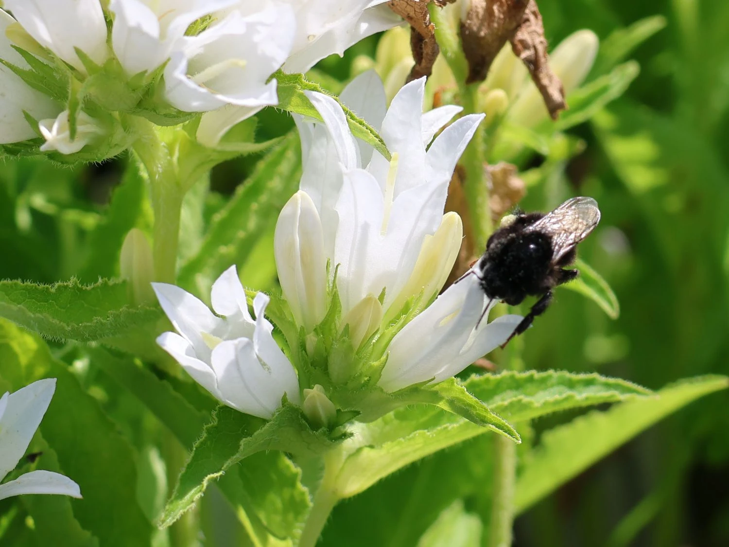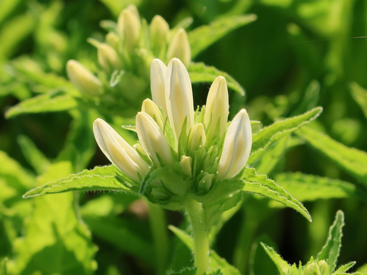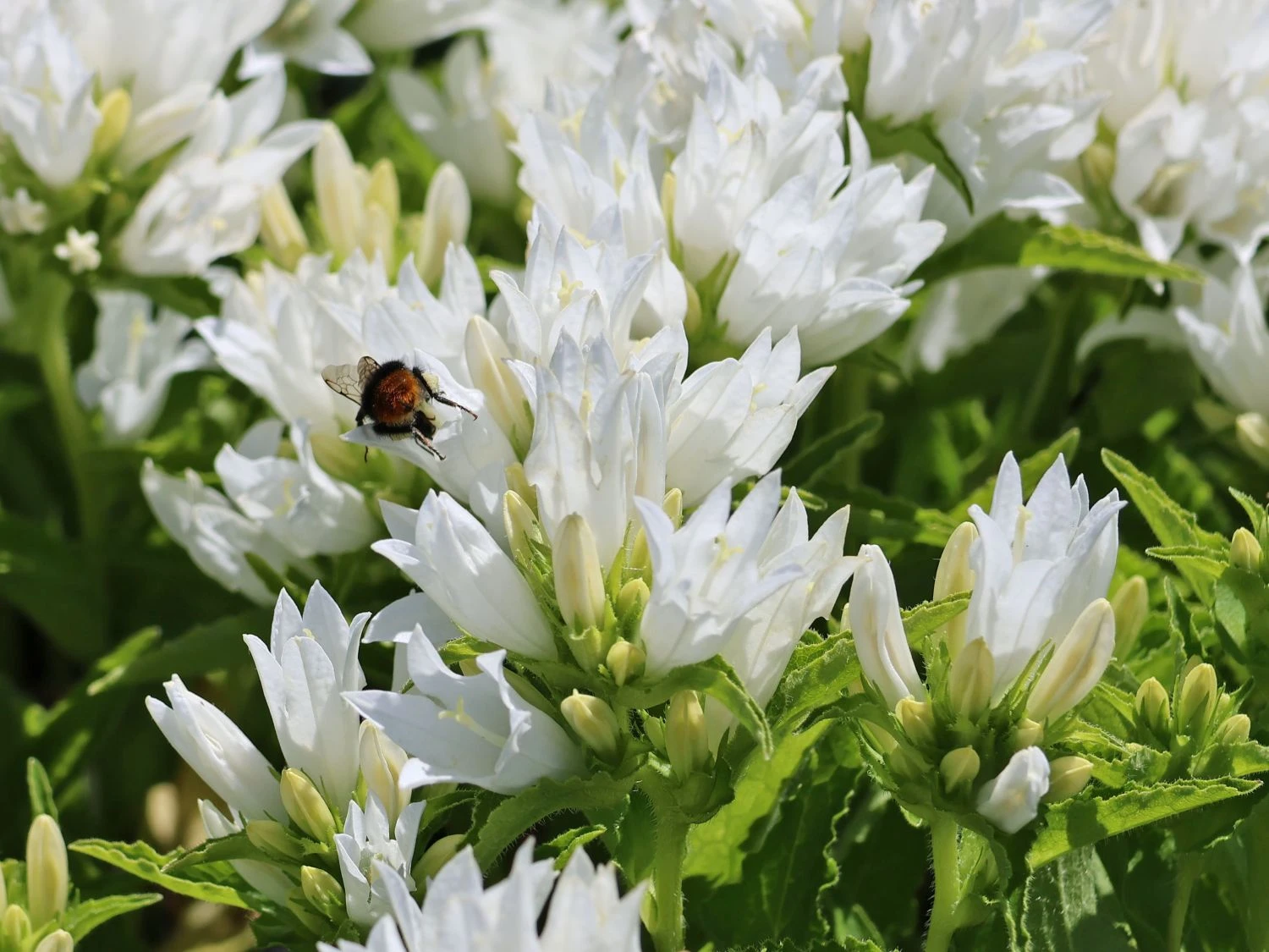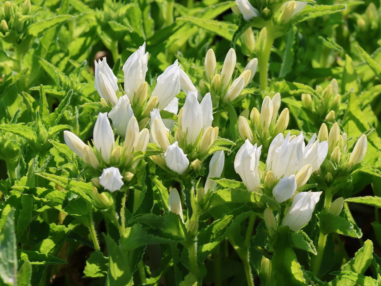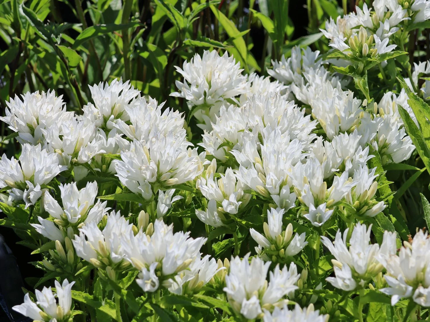 Die Knäuel-Glockenblume ‚Genti White‘ setzt mit ihrem reichen Flor den ganzen Sommer lang lichte Akzente im Garten. Sie entfaltet ihre Knospen im Juni und blüht unermüdlich bis August. Ihre zierlichen, glockenförmigen Blüten sitzen in üppigen Büscheln zusammen. Getreu ihrem Sortennamen, erstrahlen sie in reinem Weiß. Bienen, Hummeln und Schwebfliegen besuchen die Blüten in großer Zahl. Die Staude (bot.) Campanula glomerata ‚Genti White‘ besitzt kräftiges, sommergrünes Laub. Ihre Blätter sind lanzettlich geformt und leicht behaart. Sie verfügen über einen gezähnten Blattrand. Mit ihrem frischen, mittelgrünen Farbton bilden sie einen intensiven Kontrast zu den weißen Blüten und bringen diese noch mehr zum Leuchten. Die Knäuel-Glockenblume ‚Genti White‘ zeichnet sich durch einen dichten, horstigen Wuchs aus. Ihre bezaubernden Blütenstängel wachsen aufrecht. Sie erreicht eine Höhe von 40 bis 50 Zentimeter. Ihre Breite beträgt 30 bis 40 Zentimeter.