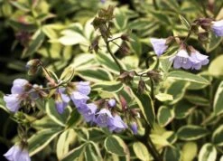 Die Kriechende Jakobsleiter ‚Stairway to Heaven‘ ® ist für jeden Liebhaber der panaschierten Pflanzen äußerst empfehlenswert. Ihr Blattwerk ist in einem zarten hell gelb/rosa umrandet und zeigt im Austrieb einen absolut dezenten Hauch. Diese einzigartige Kombination ist das entscheidende Merkmal dieser Staude. Die Polemonium reptans ‚Stairway to Heaven‘ ® wurde im Jahr 1999 innerhalb des Gartens der New England Wildflower Society von William Cullina in Massachusetts entdeckt und ist heutzutage die wohl perfekteste Form mit einem mehrfarbigen Laub. Mit ihrer glockenförmigen tiefblauen Blütenpracht, welche in lockeren dichten Trauben wächst, ist die Kriechende Jakobsleiter ‚Stairway to Heaven‘ ® in jeden schattigen Bereich einer Gartenanlage das i-Tüpfelchen.