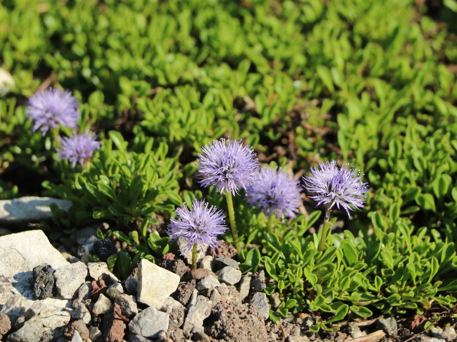 Die Kugelblume erreicht eine maximale Höhe von 40 cm und kann so optimal am Anfang oder mittig vom Staudenbeet ihren Platz finden. Ihr Wuchs ist zudem tiefgründig und rosettenbildend, sodass eine Gruppe von bis zu 15 Stück dieser Sorte wunderbar pro Quadratmeter gepflanzt werden können. So einsteht durch das hell- bis frischgrüne Laub der Pflanze ein erfrischender Teppich, der mit den vielen kugelförmigen Blütenköpfen besticht. Nicht nur im Staudenbeet, sondern auch auf Freiflächen finden Gruppen der Globularia punctata einen ehrenvollen Platz. Im Steingarten können beispielsweise Einzelexemplare oder kleinere Gruppen der Staude großartiges bewirken. Besonders der Kontrast zu dem grau der Steine in Verbindung mit dem frischen Grün des Laubes und der violettblauen Farbe der Blüten ist ein wundervoller Anblick.