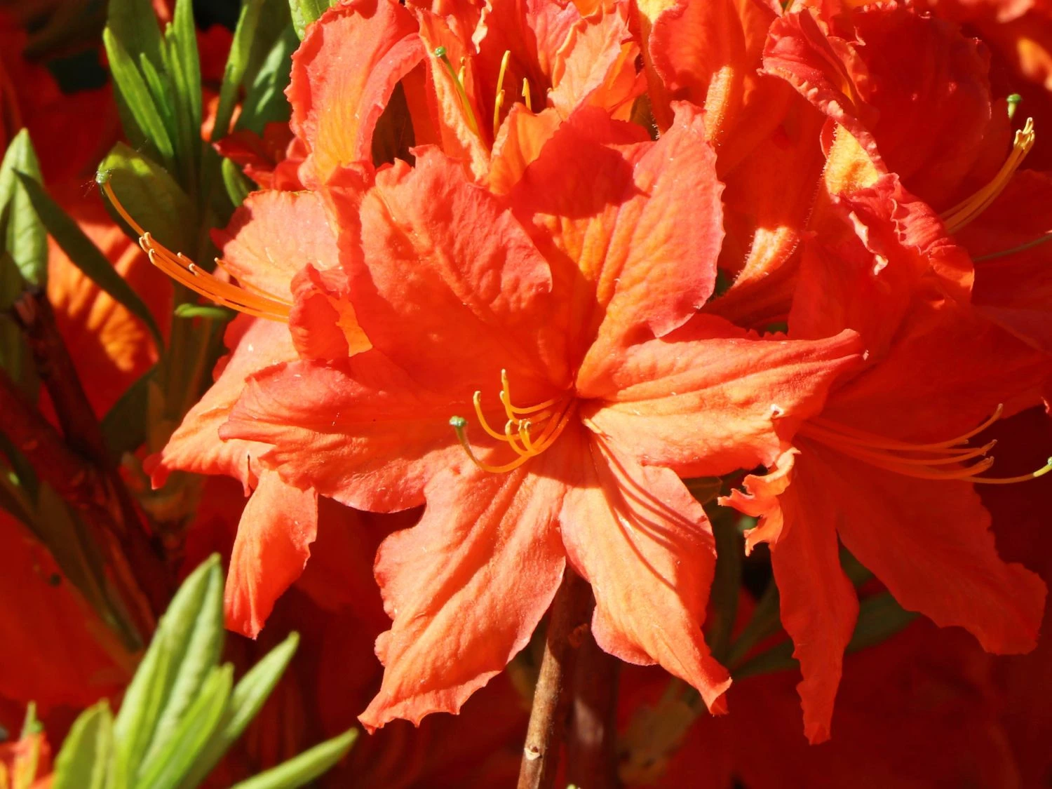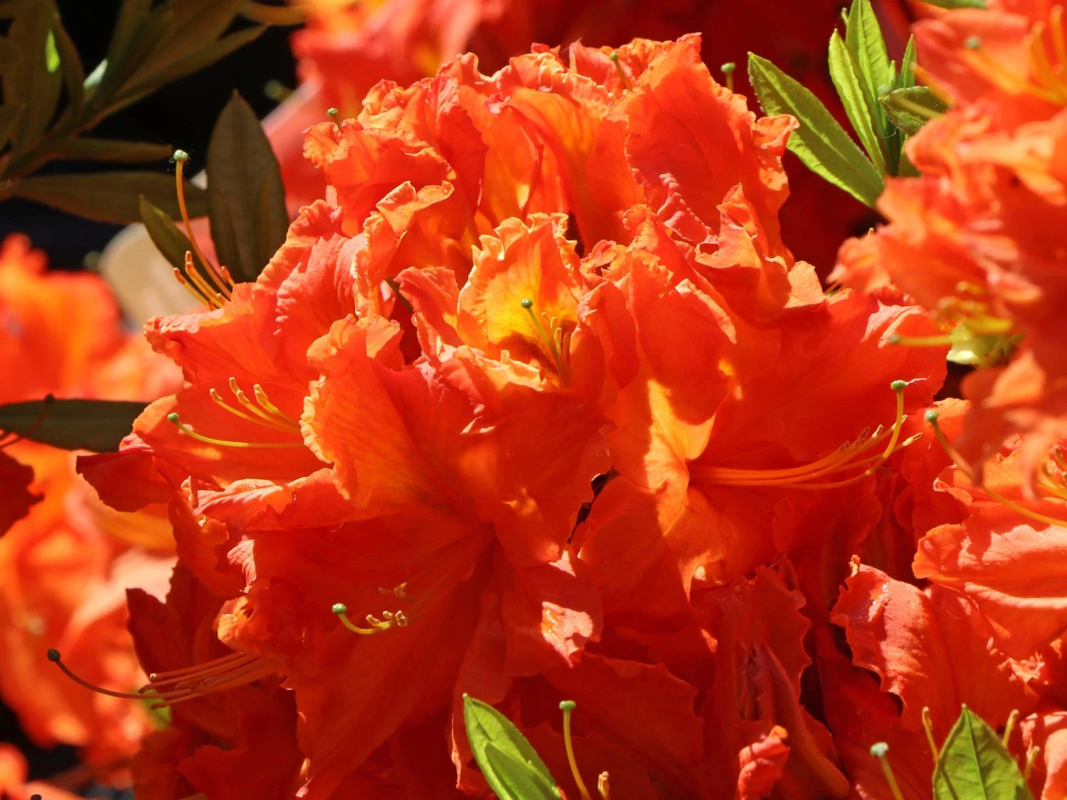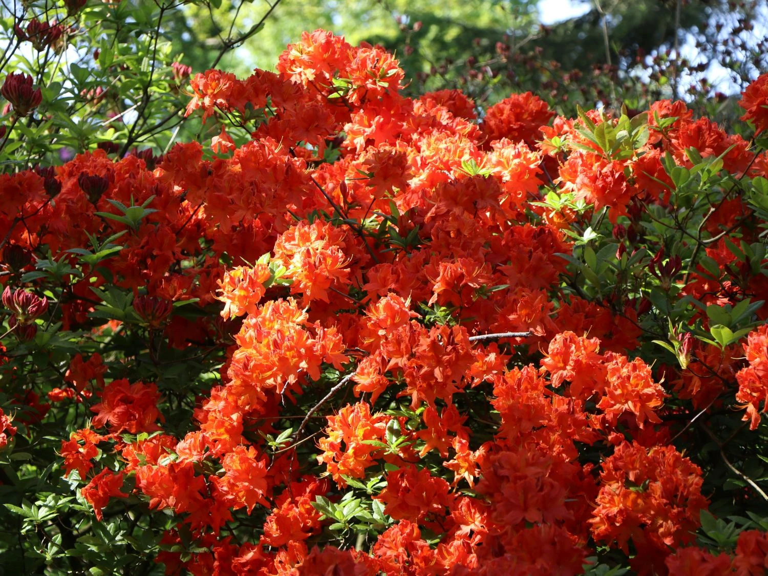 Die Laubabwerfende Azalee ‚Fridtjof Nansen‘ beeindruckt mit ihrem unglaublich reichen Flor, der dank seiner Leuchtkraft weithin sichtbar ist. In dichten Dolden präsentieren sich die herrlichen Blüten und bedecken die Zweige beinahe vollkommen. Die einzelnen Blüten sind kelchförmig und sehr groß, ihr Durchmesser beträgt bis zu 15 cm. Sie funkeln in einem intensiven Glutorange, die Blütenblätter sind rot geflammt. An den Säumen sind sie anmutig gewellt und gekräuselt. Die einzigartige Blütenpracht entzückt den Gartenfreund von Ende Mai bis Mitte Juni. Rhododendron luteum ‚Fridtjof Nansen‘ schmückt sich mit ansehnlichem, sommergrünem Laub. Seine Blätter schimmern auf der Oberseite in einem glänzenden Dunkelgrün, die Unterseite ist heller gefärbt. Sie sind länglich, lanzettlich und leicht zugespitzt. Im Herbst zeigen sie ein prächtiges Orange. Die Laubabwerfende Azalee ‚Fridtjof Nansen‘ ist ein aufrecht und breit wachsender Zierstrauch. Ihr Wuchsverhalten ist mittelstark. Sie erreicht eine Höhe von 100 bis 140 cm sowie eine Breite von 90 bis 110 cm.