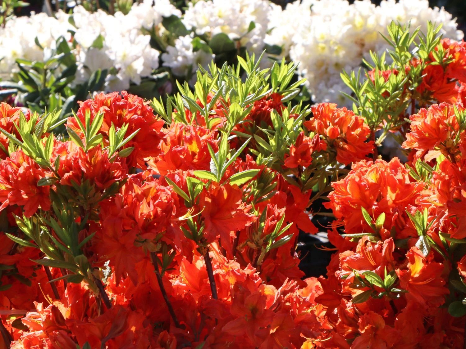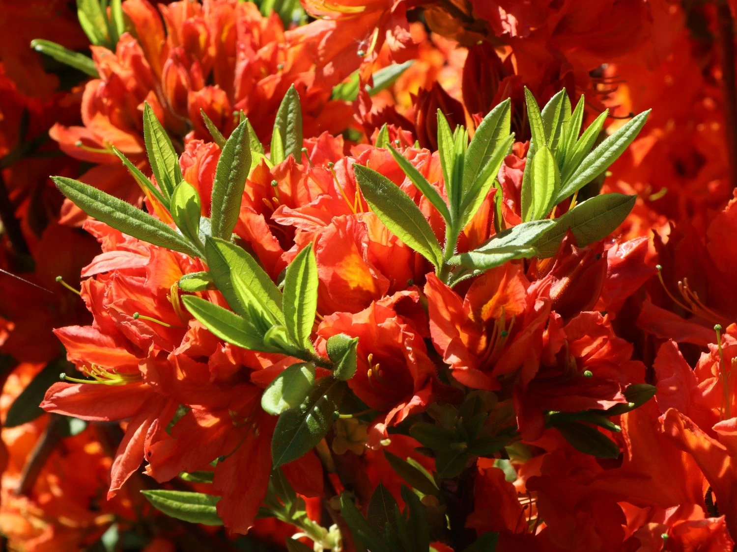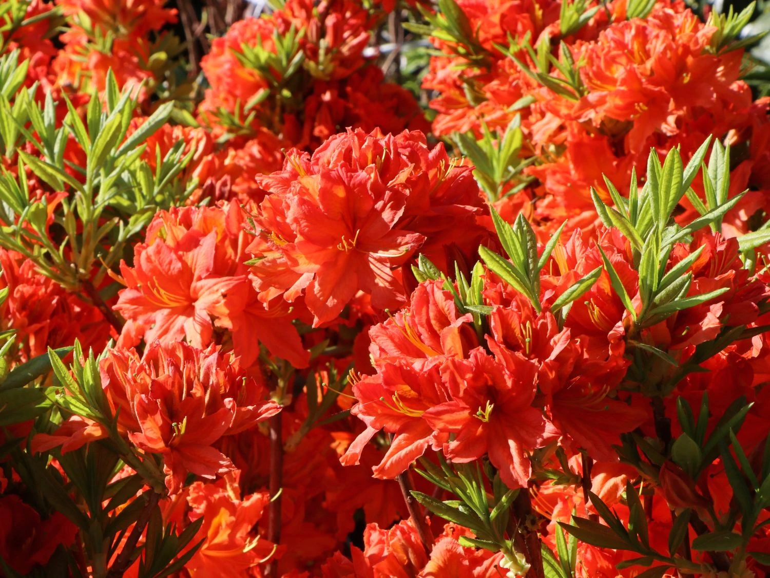 Die Laubabwerfende Azalee ‚Fridtjof Nansen‘ beeindruckt mit ihrem unglaublich reichen Flor, der dank seiner Leuchtkraft weithin sichtbar ist. In dichten Dolden präsentieren sich die herrlichen Blüten und bedecken die Zweige beinahe vollkommen. Die einzelnen Blüten sind kelchförmig und sehr groß, ihr Durchmesser beträgt bis zu 15 cm. Sie funkeln in einem intensiven Glutorange, die Blütenblätter sind rot geflammt. An den Säumen sind sie anmutig gewellt und gekräuselt. Die einzigartige Blütenpracht entzückt den Gartenfreund von Ende Mai bis Mitte Juni. Rhododendron luteum ‚Fridtjof Nansen‘ schmückt sich mit ansehnlichem, sommergrünem Laub. Seine Blätter schimmern auf der Oberseite in einem glänzenden Dunkelgrün, die Unterseite ist heller gefärbt. Sie sind länglich, lanzettlich und leicht zugespitzt. Im Herbst zeigen sie ein prächtiges Orange. Die Laubabwerfende Azalee ‚Fridtjof Nansen‘ ist ein aufrecht und breit wachsender Zierstrauch. Ihr Wuchsverhalten ist mittelstark. Sie erreicht eine Höhe von 100 bis 140 cm sowie eine Breite von 90 bis 110 cm.