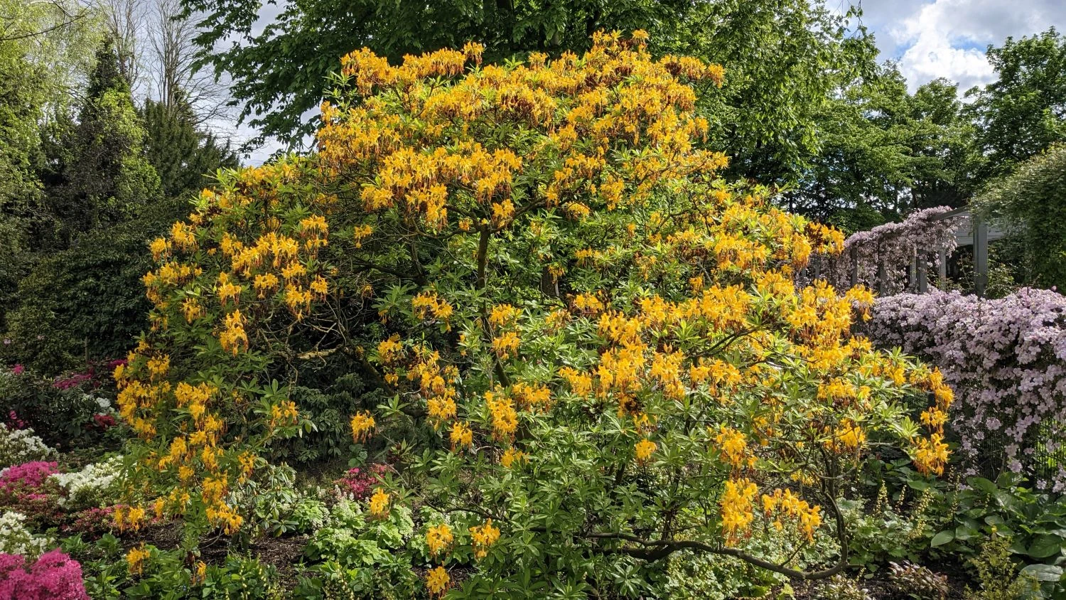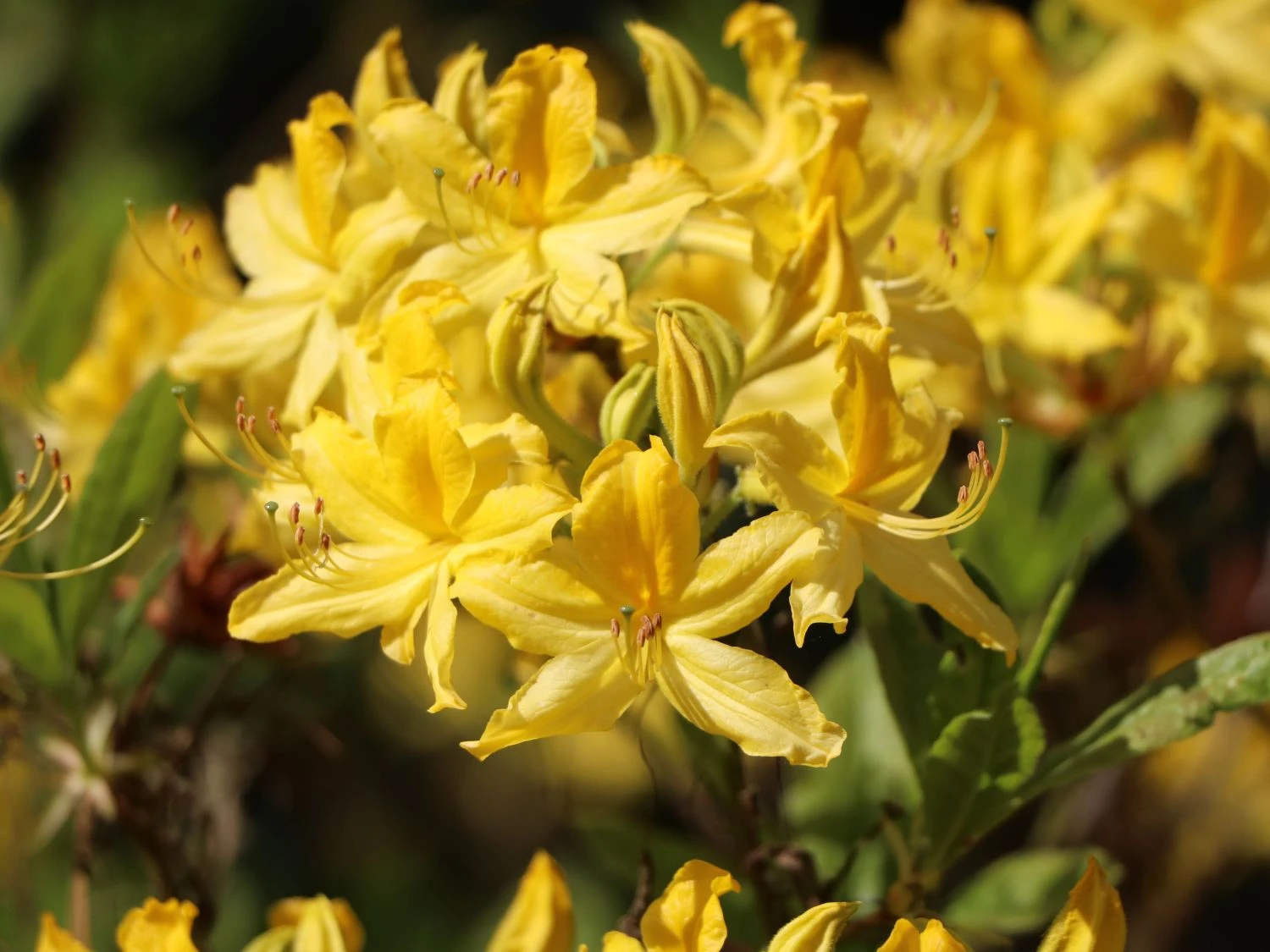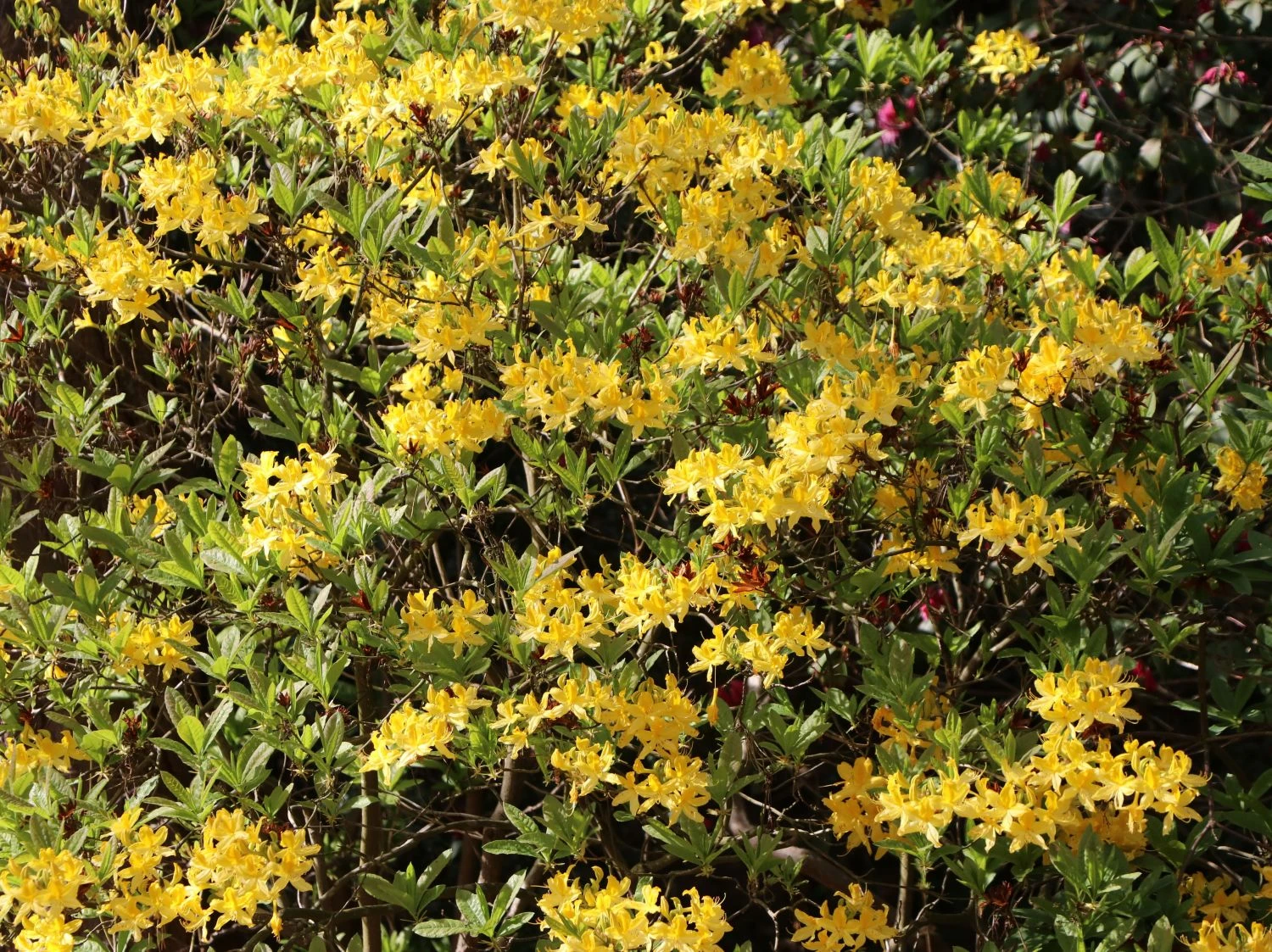 Dicht an dicht sitzen die wunderschönen Blüten an den Zweigen, eine wirkt schöner als die andere. Fast künstlich sehen die gelben Wunderwerke der Natur aus. Die trichterförmigen Blüten sind von einer einmaligen Brillanz. Sie erreichen eine Breite von bis zu sieben Zentimetern und verströmen einen intensiven süßen Duft. Die gelben Staubfäden schauen weit aus den hübschen Blütenröhren hinaus. Gar nicht verwunderlich, dass die duftenden Blüten viel besuchte Landeplätze für Bienen, Hummeln oder andere Insekten sind. Das saisonale Blattwerk von Rhododendron luteum / flavum / Azalea pontica ist sattgrün und glänzend. Die Blätter werden bis zu vier Zentimeter lang. Sie sind breit-elliptisch geformt und am Ende zugespitzt. Wie unkompliziert und robust die Laubabwerfende Azalee / Gelbe Azalee / Pontische Azalee! Das zauberhafte Blütengehölz ist winterhart und verträgt Temperaturen bis circa -25 Grad Celsius. Besonders in Gruppen entwickelt das Ziergehölz ihren Reiz. Der ästhetisch bedachte Azaleenliebhaber setzt sie mit anderen Arten, die sich farblich ergänzen. Dabei achtet er darauf, die Pflanzen nicht zu dicht zu pflanzen. Die Laubabwerfende Azalee ist schnittverträglich. Nur Mut beim Beschneiden der Zweige! Totholz und zu dünne Zweige schneider der Gärtner aus der Laubabwerfenden Azalee / Gelbe Azalee / Pontische Azalee heraus. Durch einen konsequenten Schnitt behält der Strauch eine kompakte Wuchsform. Auch verhindert der sorgsame Gärtner mit einem kräftigen Rückschnitt das Vergreisen des Rhododendron luteum / flavum / Azalea pontica. Die Pflanze liebt einen windgeschützten Standort. Gern steht sie in der Sonne oder im Halbschatten. Die Pflanze bevorzugt einen feuchten, lockeren, durchlässigen und humosen Boden. Aus der Nähe und in Gruppen betrachtet, ist ihre Fernwirkung geradezu überwältigend! Niemand kann sich der einzigartigen Ästhetik der Azalea pontica entziehen! Auch im Pflanzkübel ist dieses Ziergehölz ein aparter Blickfang auf der Terrasse oder dem Balkon!