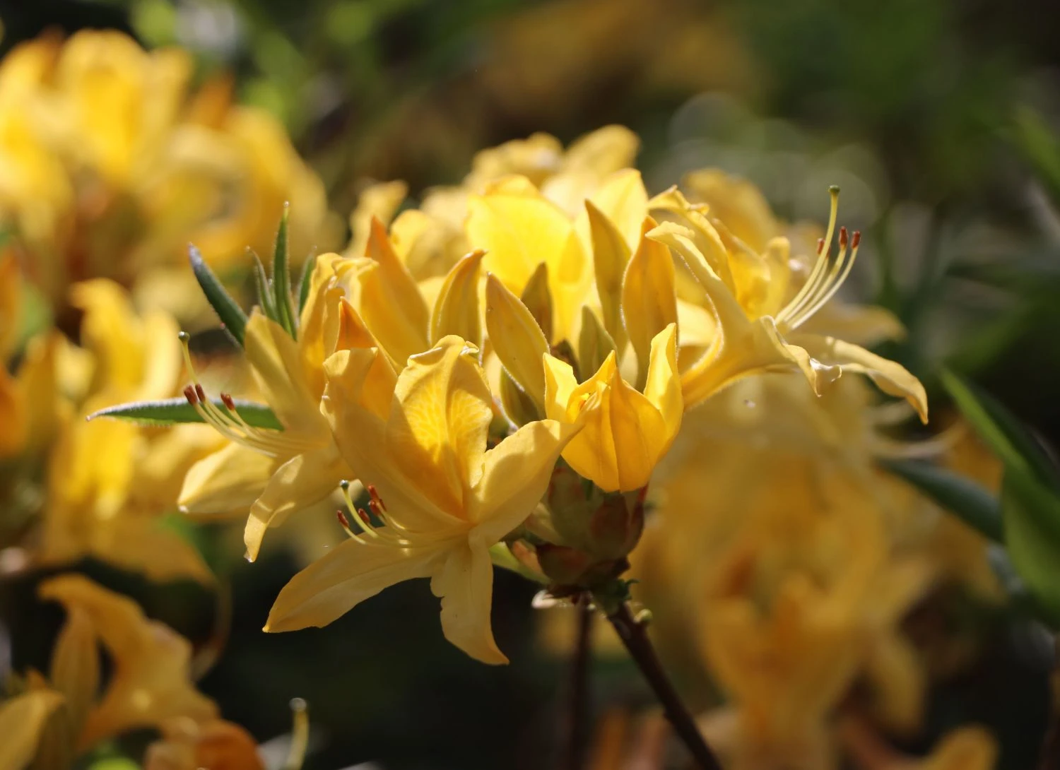Die Laubabwerfende Azalee / Gelbe Azalee / Pontische Azalee ist mit ihren bezaubernden gelben Blüten eine Attraktion in jedem Garten. Von Mitte Mai bis Juni sorgt dieses attraktive Gehölz, mit seinem auffälligen, beinahe exotisch anmutenden gelben Blütenmeer, für bewundernde Blicke. Diese sommergrüne Azalee ist eine europäische Wildform. Diese Art ist wegen ihrer wunderschönen Blüten, ihrer glänzenden grünen Blätter und aufgrund ihres intensiven Duftes bei Gärtnern beliebt. Den (bot.) Rhododendron luteum / flavum / Azalea pontica kennen viele unter dem Namen Gelbe Azalee oder Pontische Azalee. Anders als viele ihrer Verwandten aus der Gattung der Rhododendren, stammt diese Art nicht aus fernen Regionen in Asien und Nordamerika. Ursprünglich ist sie rings um das Schwarze Meer verbreitet. Vor allem im namensgebenden Pontischen Gebirge ist sie anzutreffen. Botanisch zählt die Laubabwerfende Azalee zu den Rhododendren. Anders als diese, verliert sie vollständig ihre Blätter im Herbst. Zuvor leuchten die Blätter der Laubabwerfenden Azalee / Gelbe Azalee / Pontische Azalee in herrlichen Farbtönen gelb bis orangerot. Rhododendron luteum / flavum / Azalea pontica verfügt über einen dicht verzweigten, breiten Wuchs. Das Gehölz erreicht eine Wuchshöhe von bis zu 1,80 Meter und breitet sich auf bis zu 1,30 Meter aus. Das zauberhafte, gelbblühende Gehölz ist gut verzweigt und zeigt sich starkwüchsig.