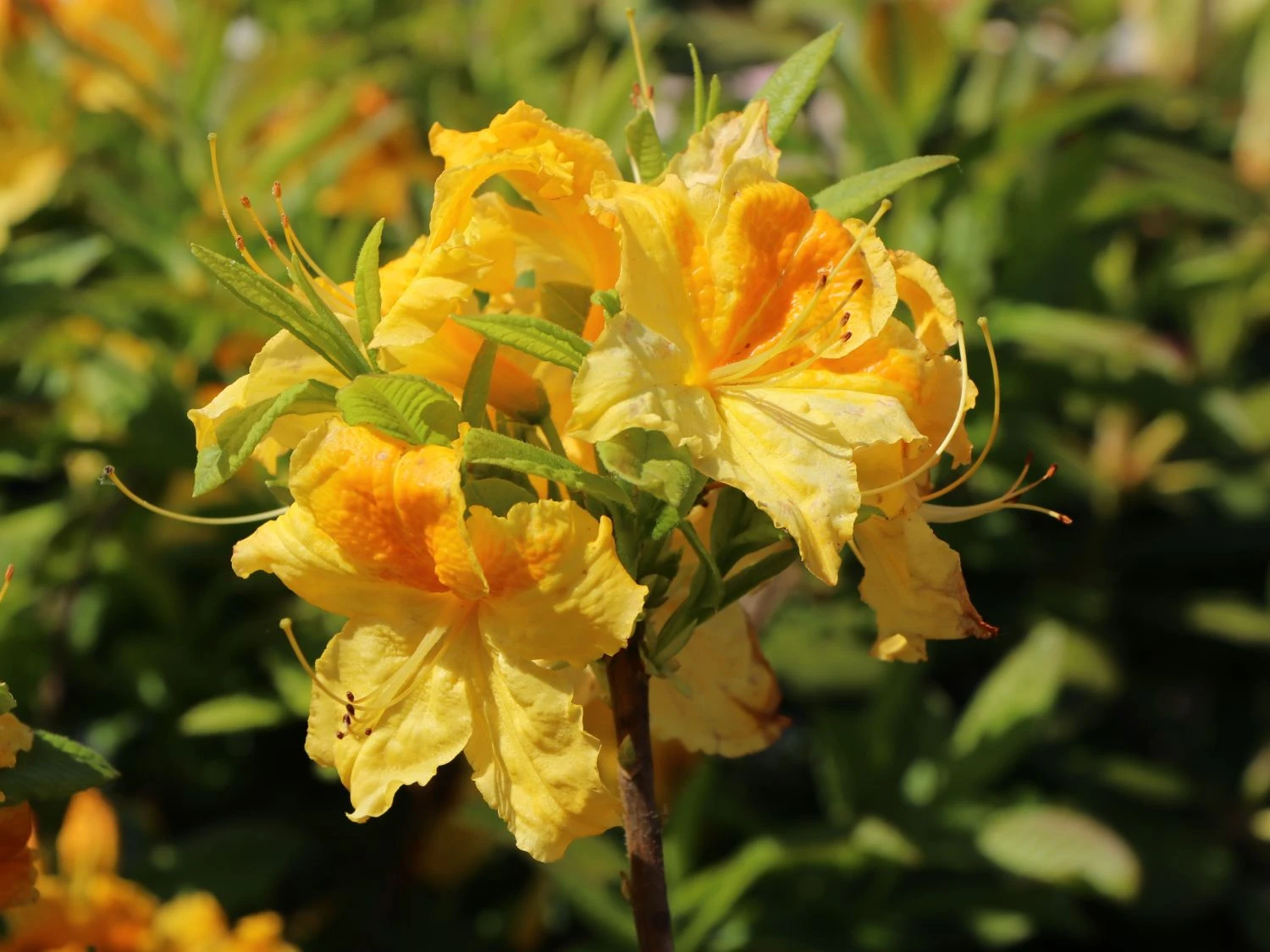 Die Laubabwerfende Azalee ‚Goldtopas‘ begeistert mit der unvergleichlichen Leuchtkraft ihrer Blüten. Mit ihrem üppigen Flor schmückt sie den Garten von Ende Mai bis Mitte Juni. Ihre opulenten, weit geöffneten Blütenkelche erreichen einen Durchmesser von bis zu 10 cm. Sie verzaubern mit ihrem strahlenden, intensiven Gelb und dem wirkungsvollen orangen Farbfleck. Dieser spektakulären Farbkombination verdankt die als Gelbe Azalee bekannte Pflanze ihren Namen. Sie verströmen einen zarten und angenehmen Duft. Rhododendron luteum ‚Goldtopas‘ schmückt sich mit länglichen, lanzettlichen, vorn zugespitzten Blättern. Sein Laub erscheint in einem glänzenden Dunkelgrün, das einen kräftigen Kontrast zu den leuchtend gelben Blüten bildet. Die Laubabwerfende Azalee ‚Goldtopas‘ wächst aufrecht, kompakt, gut verzweigt und wird deutlich breiter als hoch. Dabei hängen ihre Blütendolden locker und anmutig über und sind mit bis zu 10 der wunderschönen Blüten besetzt. Der Zierstrauch erreicht eine Höhe zwischen 100 und 120 cm. Seine Breite beträgt 120 bis 160 cm und jedes Jahr legt er 20 bis 30 cm an Höhe und Umfang zu.