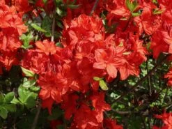 Laubabwerfende Azalee ‚Parkfeuer‘ – ihre weit offenen Blüten strahlen in einem Reinrot. Innen sind sie orangerot getönt und verströmen einen leichten angenehmen Duft. Für ausreichend Kontrast ist durch die weißen Staubgefäße gesorgt.