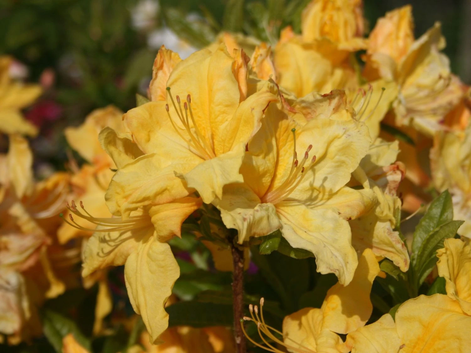 Laubabwerfende Azalee ‚Windsor Sunbeam‘ – Mit dem Blütendurchmesser von 8 – 11 cm ist sie eine Sorte mit außergewöhnlich großen Blüten. Jede dieser Blüten ist trichterförmig und breitflächig. Ihre leuchtend reingelbe Farbe ist fleckartig goldgelb getönt.