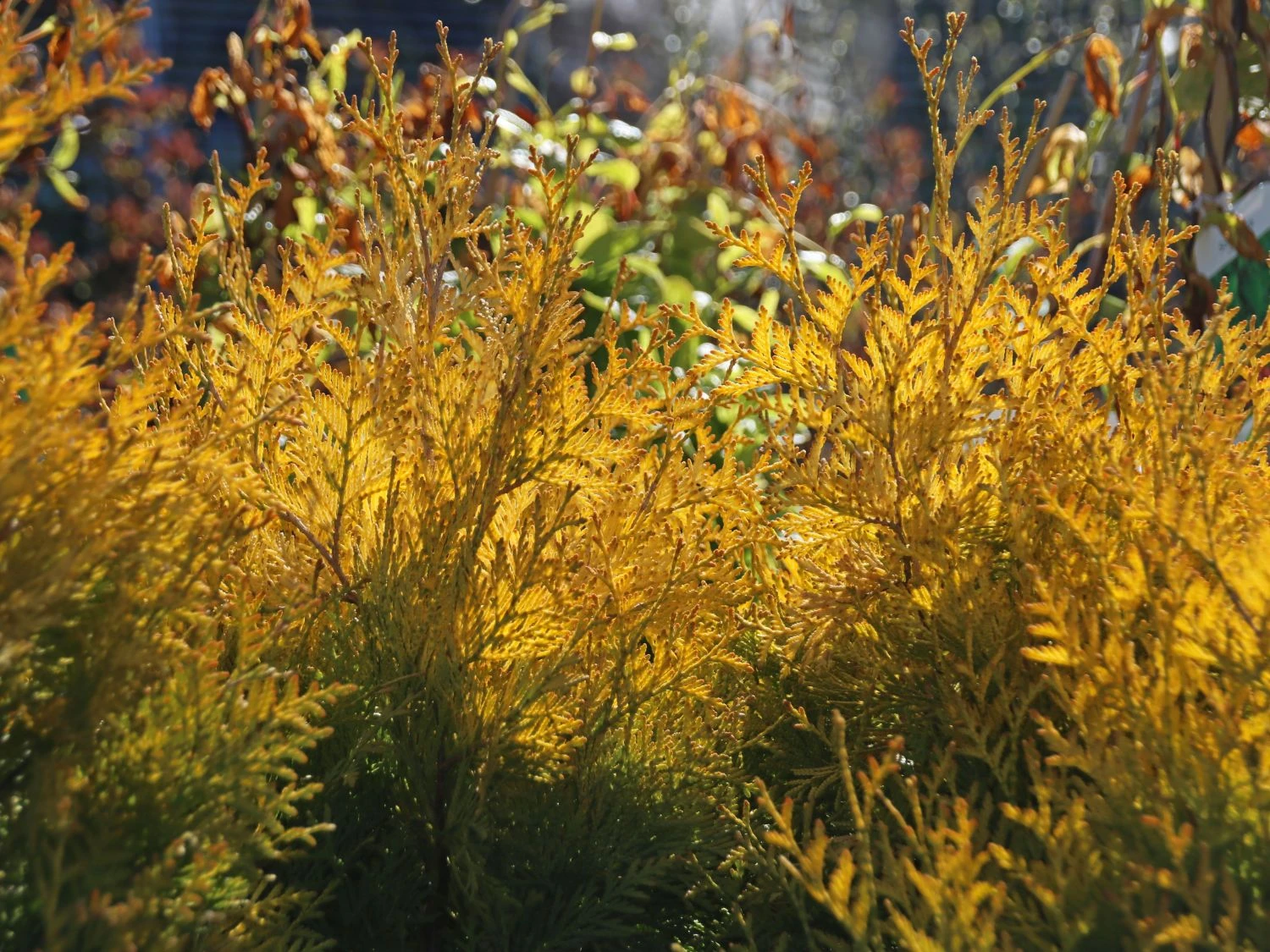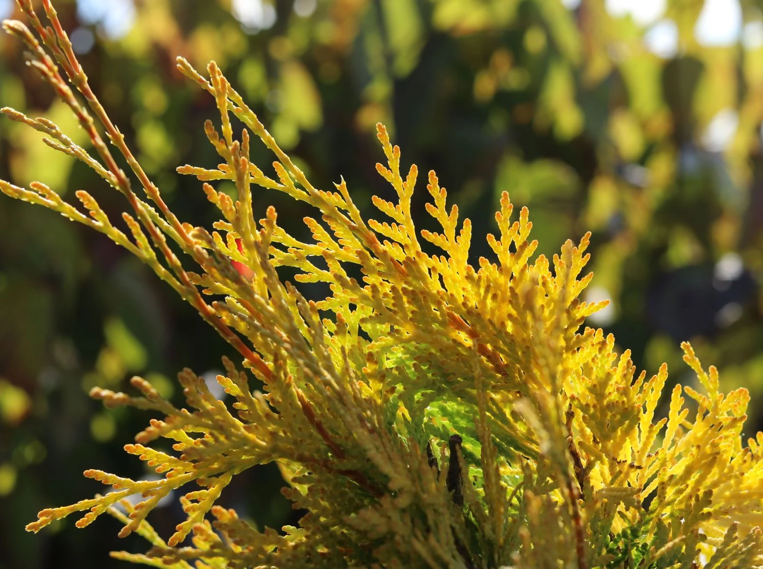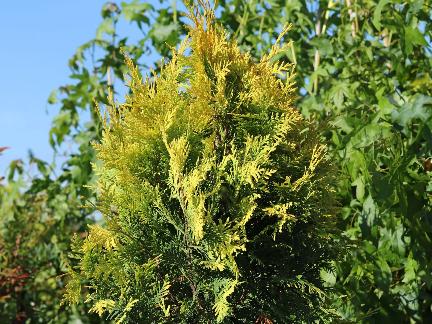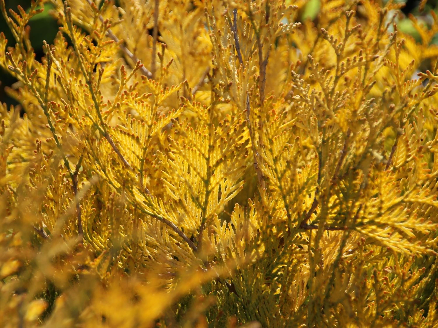 Der Lebensbaum ‚Sunkist‘ bezaubert mit seiner leuchtend-gelben Nadelfarbe. Beim Einpflanzen von Thuja Lebensbäumen sind der Kreativität des Gärtners keine Grenzen gesetzt. Vielfach sind sie als Heckenpflanzen im zierenden Einsatz. Dafür sprechen ein paar gute Gründe. Langsames Wachstum, ganzjährig gelbe Nadeln und das gute Vertragen von Rückschnitten. Zudem wirken Lebensbäume solitär gestellt unglaublich attraktiv. Vielfach zieren sie öffentliche Parkanlagen wie Friedhöfe und Parks. Auch bieten sich die schönen Gehölze für kunstvoll gestaltete Formen an. Der Abendländische Lebensbaum (Thuja occidentalis) ist mit seiner anspruchslosen Art und und seinem immergrünen Wesen ein dankbarer und langjähriger Bewohner im Garten. Als Element einer Hecke erreicht die Sorte ‚Sunkist‘ eine Höhe von drei bis vier Meter. Sehr alte Lebensbäume erreichen Wuchshöhen von bis zu fünf Metern. Allerdings stehen diese Exemplare an optimalen Standorten und sind ungebremst in ihrem Wachstum. Unsere hiesigen Ziergehölze erreichen diese Ausmaße in seltenen Fällen. Gärtner genießen das langsame Wachstum der Thuja occidentalis ‚Sunkist‘. In der Homöopathie ist eine bereitete Essenz aus Zweigspitzen bekannt. Alle Sorten des Lebensbaumes gelten als giftig. In den Spitzen der Zweige sind ätherische Öle und das Thujon enthalten. Für Schafe, Kühe, Schweine, Ziegen, Hunde, Katzen, Pferde und Rinder ist der Lebensbaum giftig. Auch Hasen, Meerschweinchen, Kaninchen, Hamster und Vögel vertragen den Genuss der Pflanze nicht. Besonders empfindlich zeigen sich Pferde. Im Altertum war das Holz des Lebensbaumes ein beliebtes Bauholz. Es ist extrem haltbar und ein wichtiger Bestandteil der Baukunst. Der Abendländische Lebensbaum kam 1596 nach Europa, aus ihm entstanden in der Folge die vielen verschiedenen Sorten.