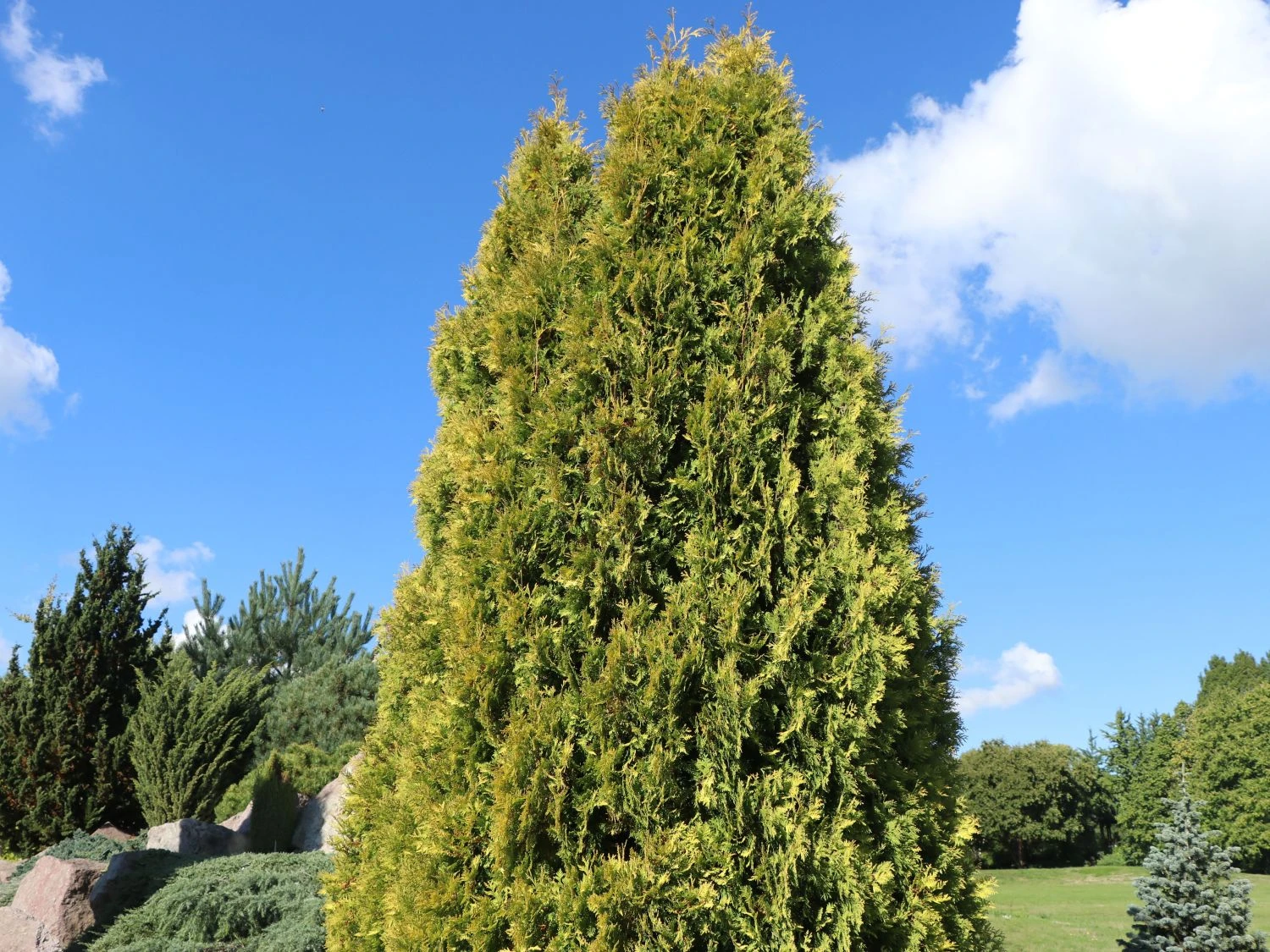 Dieses immergrüne Zypressengewächs ist bei Gärtnern ein beliebtes Gehölz. Der Lebensbaum ‚Sunkist‘ begeistert mit seinem aufrechten, dichten und schmal-kegelförmigen Wuchs. Die grüngelben bis goldgelben Blattschuppen von (bot.) Thuja occidentalis ‚Sunkist‘ sorgen für ein dekoratives und attraktives Äußeres. Aus der Familie der Lebensbäume stammend, liegt das Hauptvorkommen der Thuja-Arten in den USA und Kanada. Die Bäume der Thuja gehören dort zu den häufigsten Waldbäumen. Die (bot.) Thuja occidentalis ‚Sunkist‘ bevorzugt als lichtliebender Baum einen sonnigen bis halbschattigen Standort. Optimal ist ein durchlässiger, frischer Gartenboden. Winterliche Fröste sind für alle Sorten der Thuja kein Problem. Sie zeichnen sich durch gute Winterhärte aus. Allerdings ist ein Austrocknen in langen, heißen Sommern zu vermeiden. Hier ist tiefgründiges Bewässern nötig. ‚Sunkist‘ erreicht eine Wuchshöhe von drei bis vier Meter. In seinem Durchmesser erreicht zwischen einem und zwei Meter. Um diese Maße zu erreichen, legt er jährlich 20 bis 30 Zentimeter an Höhe und Breite hinzu.