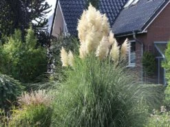 Mit der erstaunlichen Ausdruckskraft seiner weißen Rispen und einer Höhe von oft über zwei Meter, bilden diese einen herrlichen Blickmagneten, der auch gern an Gartengewässern gepflanzt wird. Pampasgras benötigt vor allem im Sommer und während seiner Blütezeit, die im September und Oktober erfolgt, viel Wasser und gedeiht deshalb dort prächtig. Das Pampasgras ‚Weiße Feder‘ speichert Wasser und übt auf den Boden eine belüftende Wirkung aus.