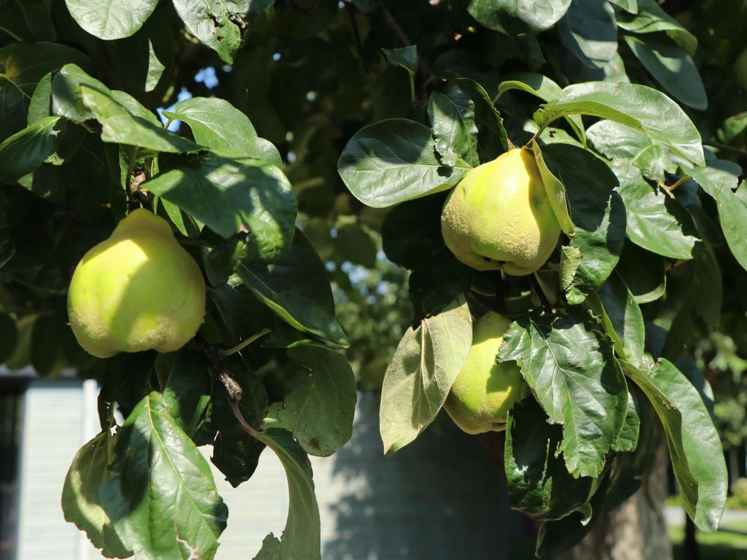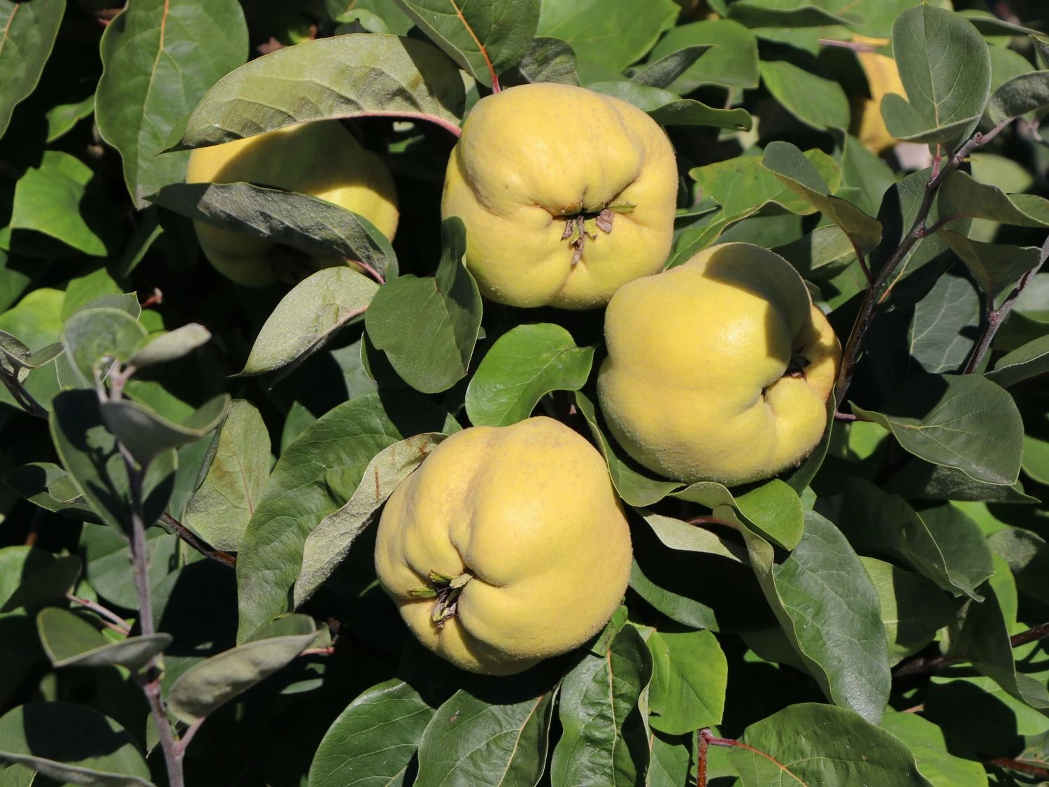 Die Portugiesische Zwerg-Birnenquitte ‚Champion‘ ergänzt den Garten auf unverwechselbar schöne Weise. In der Zeit von Oktober bis November reifen die zartfleischigen, großen, goldgelben Früchte heran. Die Quitten von (bot.) Cydonia ‚Champion‘ haben einen süß-säuerlichen Geschmack und sorgen mit ihrer attraktiven reingelben Farbe für einen fröhlichen Farbtupfer im späten Herbst. Einen zusätzlichen Blickfang liefert die charakteristische Rinde. Sie ist grau und löst sich in unregelmäßigen Platten ab. Die Wuchshöhe variiert ein wenig, angepasst an die Bedingungen des Standorts. Im Frühjahr erscheinen die sommergrünen Blätter der Portugiesischen Zwerg-Birnenquitte ‚Champion‘. Diese sind eiförmig, mittelgrün und wechselständig an den Trieben angeordnet und entwickeln sich auf eine Größe von 5 bis 10 cm. Im späten Herbst leuchten sie mit vielen anderen schönen Herbstfärbern um die Wette und sorgen für einen weiteren Glanzpunkt im Garten. Diese einmalig schöne Zwerg-Birnenquitte ist hitzeverträglich und kommt auch mit städtischem Klima gut zurecht. Somit ist sie eine wunderbare Bereicherung – sowohl im heimischen Garten als auch auf einem kleinen Stadtbalkon. Denn auch dort gedeiht sie im Kübel, verzaubert mit ihrem schönen Anblick und liefert zudem ihre gesunden Früchte frei Haus.