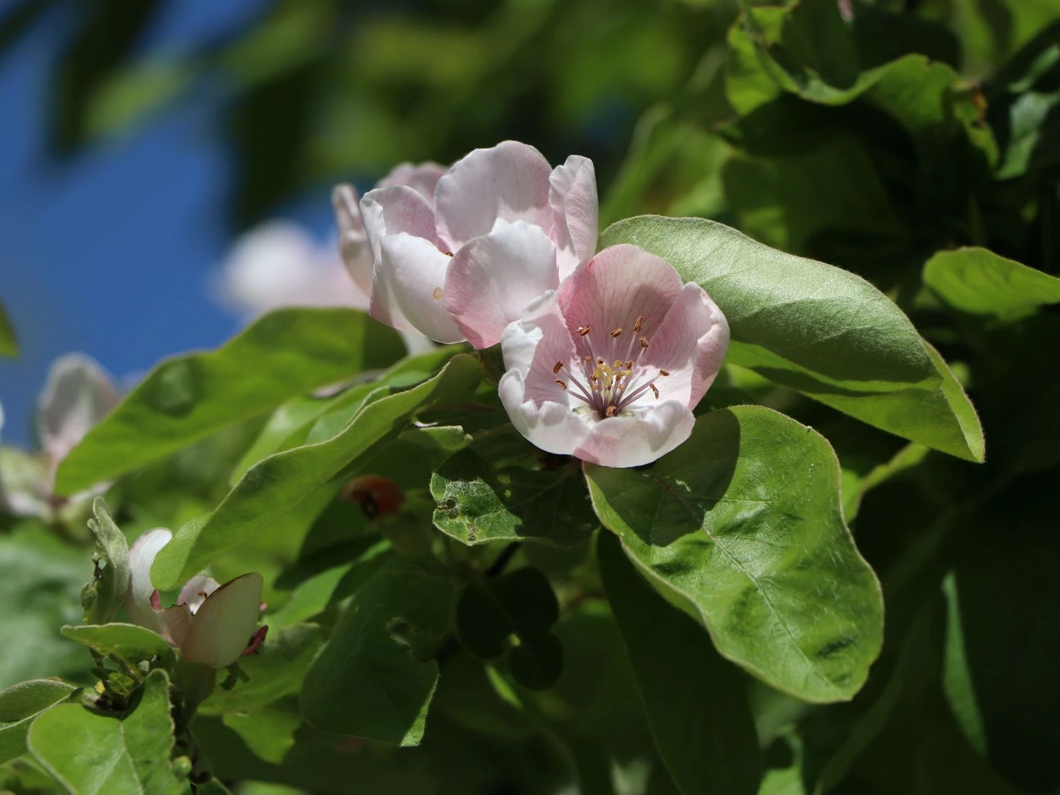 Bereits im Frühjahr zieht die Portugiesische Zwerg-Birnenquitte ‚Champion‘ alle Aufmerksamkeit auf sich. Es ist die Zeit der Blüte! Die rosa Blüten erscheinen in Hülle und Fülle und mit ihnen Bienen, Hummeln und Schwebfliegen, die sich an dem großen Angebot von Nektar und Pollen erfreuen. Die bereits in einem insektenfreundlichen Garten angesiedelten Bienenvölker schließen dieses neu angepflanzte Ziergehölz sofort in ihr Herz und kümmern sich ausgiebig um das Bestäuben der schönen Blüten. Die 4 bis 5 cm großen Blüten sind schalenförmig und erscheinen ab Mai. Aus den Früchten bildet Cydonia ‚Champion‘ die birnenförmigen und herrlich duftenden Früchte, die sich zu vielerlei Leckereien verarbeiten lassen. Der bevorzugte Standort der Portugiesischen Zwerg-Birnenquitte ‚Champion‘ ist sonnig bis halbschattig in einer windgeschützten Lage. Die Pflanze benötigt einen ausreichend feuchten, durchlässigen und nährstoffreichen Erdboden. Hier streckt der Tiefwurzler seine Wurzeln tief in das Erdreich hinein.