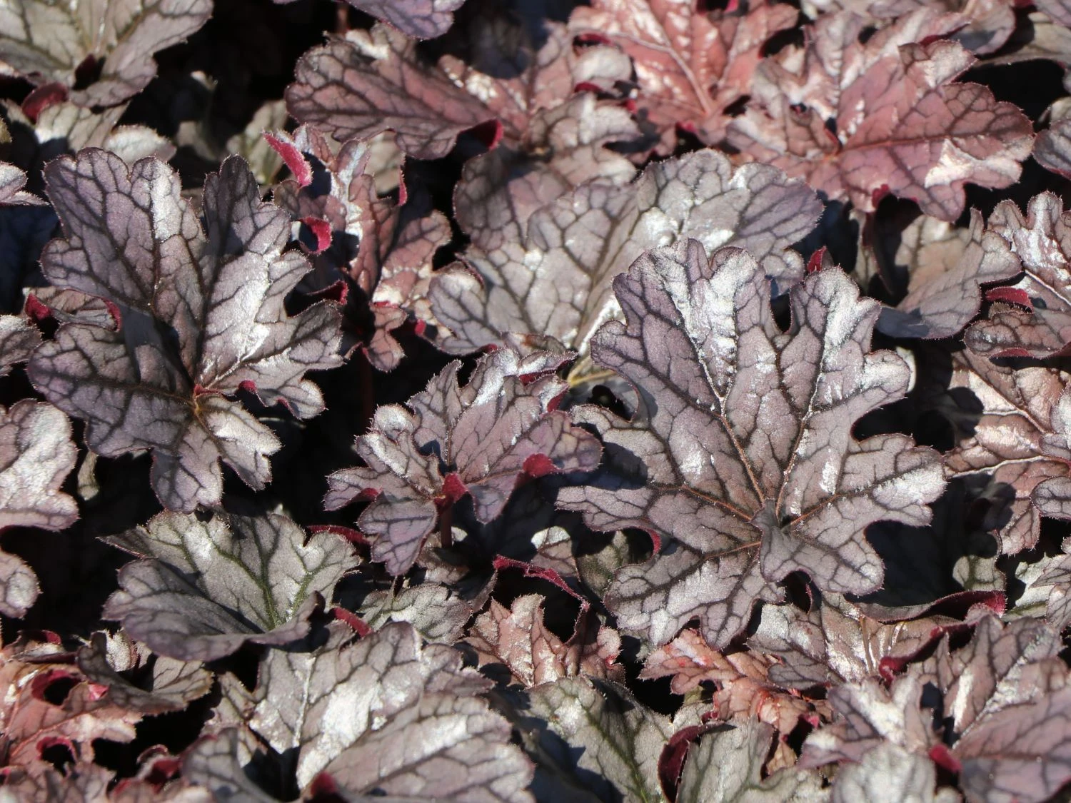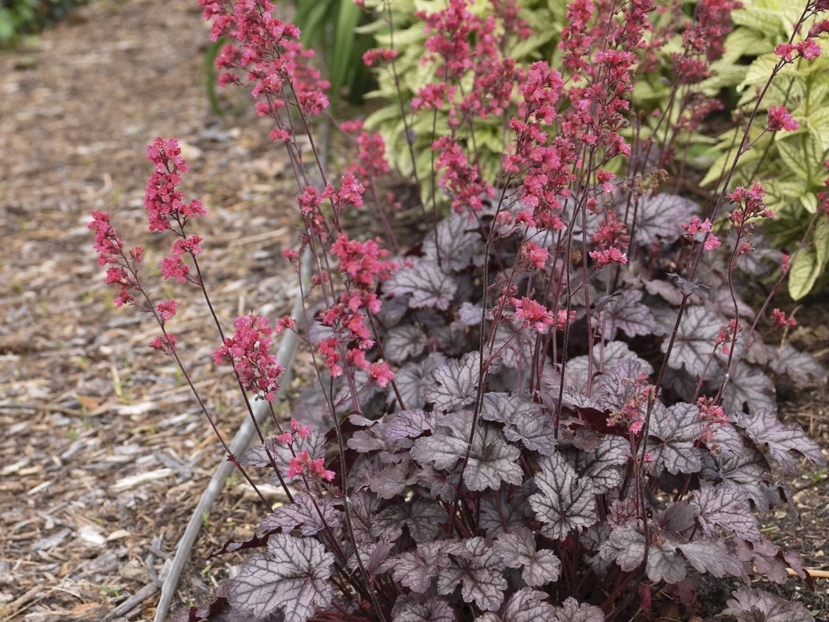 Das Purpurglöckchen ‚Timeless Treasure‘ stammt aus der Familie der Steinbrechgewächse und begeistert nicht nur mit seinen Blüten. Es besitzt zudem eine attraktive Färbung der Blätter. Die Oberflächen schimmern silbern im Kontrast zu den dunkelgrünen Blattadern. (Bot.) Heuchera ‚Timeless Treasure‘ erreicht Wuchshöhen bis 50 Zentimeter. Das grundständige und locker rosettenartig angeordnete Laub sorgt für einen halbkugeligen und kompakten Wuchs. Mahagonifarbene Blatt- und Blütenstängel ergänzen den Mix aus außergewöhnlichen Attributen. Während der langen Blütezeit von Juni bis August ragen aufrechte Rispen weit über das Laub hinaus. Sie tragen eine Vielzahl an dunkelrosa- bis pinkfarbenen Blüten, die an kleine Glöckchen erinnern. Ihr Nektar lockt Bienen und Schmetterlinge an. Aus bestäubten Blüten entwickeln sich Kapselfrüchte mit schwarz-braunen Samen. Weil es sich bei dem Purpurglöckchen ‚Timeless Treasure‘ um ein wintergrünes Gewächs handelt, trägt es auch in der kalten Jahreszeit zu einer Verschönerung des Gartens bei. Die Frostverträglichkeit der winterharten Pflanze liegt bei -20°C.
