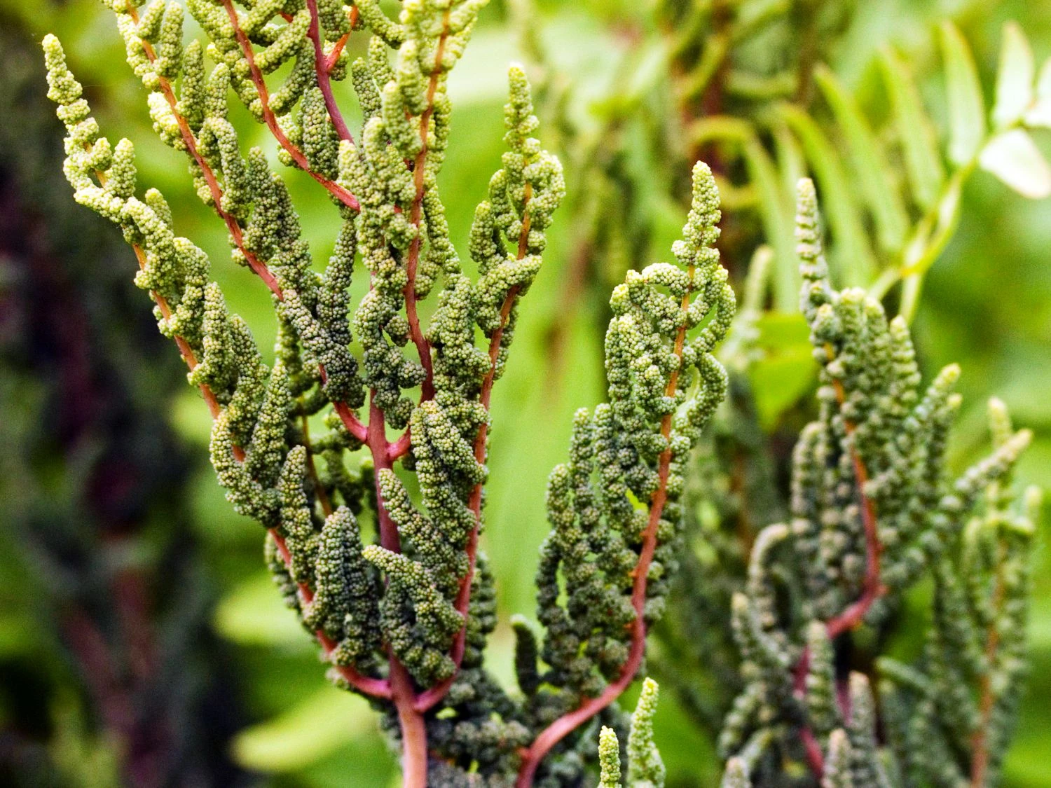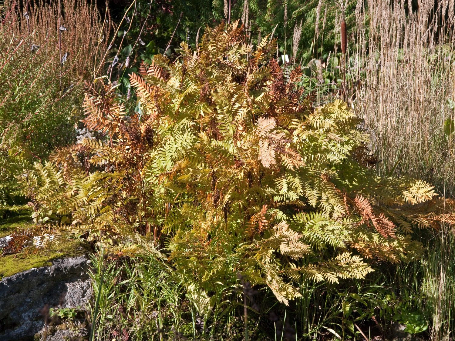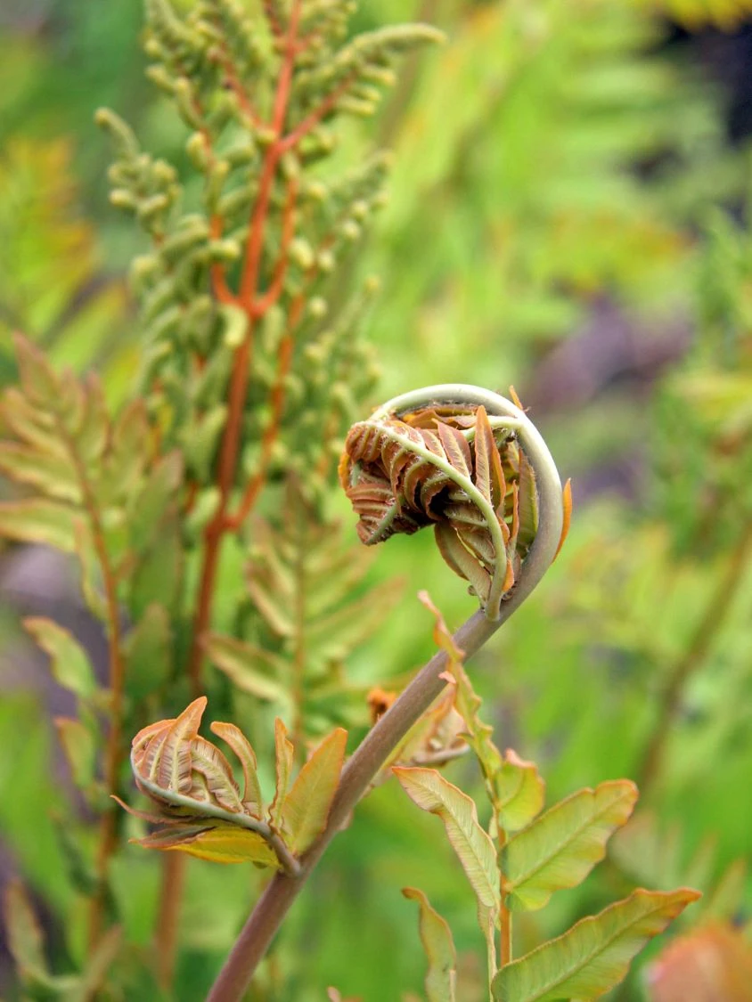 Der Purpurkönigsfarn ‚Purpurascens‘ ist ein majestätischer Vertreter des Königsfarns und eine zauberhafte Blattschmuckstaude. Der Purpurkönigsfarn bevorzugt kalkarme, feuchte Böden und erreicht dort ein sehr hohes Alter. Innerhalb von 2 Jahren erreicht die Pflanze ihre Endhöhe. Der Königsfarn Osmunda regalis ‚Purpurascens‘ erreicht normalerweise eine Höhe von 100 bis 120 cm. Unter idealen Bedingungen erreicht er eine Höhe von bis zu 180 cm. Im Austrieb bilden sich an den purpur-rötlichen Stielen doppelt gefiederte Wedel, die sich im weiteren Verlauf dunkelgrün färben. Im Herbst nehmen die Wedel des Königsfarns eine goldgelbe Tönung an. Der Purpurkönigsfarn ‚Purpurascens‘ trägt auf der Unterseite seiner Blätter keine Sporen, sondern bildet Sporenwedel. In ihrem unteren Teil sind sie grün gefärbt, während sie im oberen Teil eine dunkle, rotbraune Farbe annehmen und Sporen tragen. Ein typisches Merkmal für diese Farne sind die Ballen faseriger Wurzeln, die sie bilden.