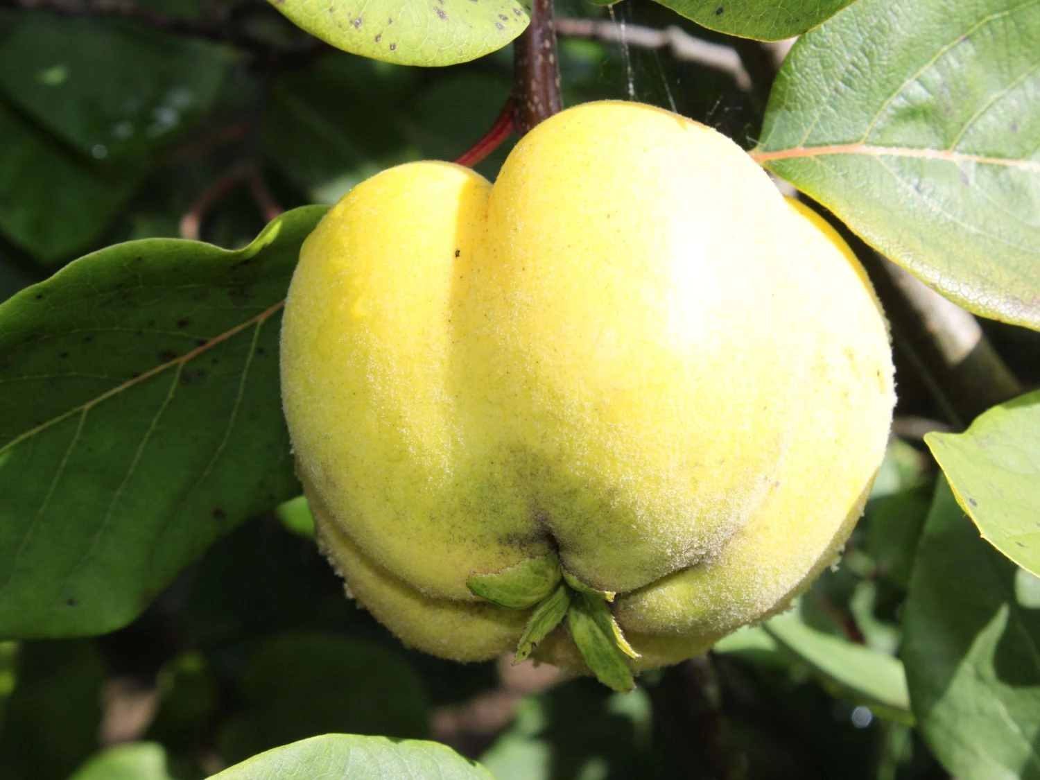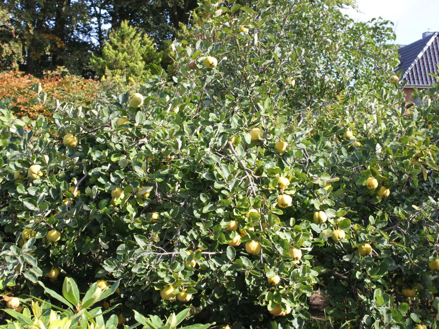 Für eine reiche Ernte empfiehlt sich das Setzen einer weiteren Sorte. Aus den bestäubten Blüten entwickeln sich im Laufe des Sommers große Quittenfrüchte. Die Früchte der Quitte ‚Konstantinopeler Apfelquitte‘ erlangen ein Gewicht von bis zu 250 Gramm. Sie haben ein apfelähnliches Aussehen mit teilweise unregelmäßiger Form. Ihre Schale variiert zwischen hell- und goldgelb und kann auf der Sonnenseite bräunlich sein. Die glatte Schalenoberfläche ist bis zur Reife leicht filzig. Das Fruchtfleisch der Quitte ‚Konstantinopeler Apfelquitte‘ ist von weißer bis gelber Färbung. Quitten reifen Anfang bis Mitte Oktober. Der Gärtner erkennt die Reife daran, dass sich der Stiel mühelos von den Ästen lösen lässt. Die großen gelben Früchte bieten einen fantastischen Anblick im herbstlichen Garten! Nach dem Pflücken sind Quitten bis in den Dezember hinein genießbar. Quittenfleisch ist extrem hart und für den Frischverzehr ungeeignet. Erst nach dem Kochen und der Verarbeitung zu Gelee, Mus, Saft, Likör oder Wein wird der köstliche Geschmack dieser Früchte deutlich! Sie schmecken unglaublich köstlich und sind, nach ihrer Zubereitung, aufgrund ihrer Vitamine, Nährstoffe und Pektine, lecker und gesund. Die Früchte verströmen einen herrlichen Duft! Dieser zieht durch alle Räume und ist angenehm apfelartig. Das Laub der Cydonia ‚Konstantinopler Apfelquitte‘ ist anfangs behaart und steht wechselständig an den Trieben. Die Blätter werden bis zu zehn Zentimeter lang und sieben Zentimeter breit. Im Herbst verliert der Quittenbaum seine Belaubung und zieht sich in die Winterruhe zurück. Da der Baum langsam wächst, sind kaum Pflegemaßnahmen notwendig. Der Gärtner lichtet nach Jahren einige Äste nach Bedarf aus. Dieses schöne Gewächs ist eine wunderschöne Bereicherung des Obstgartens. Die Blüten sind im Frühjahr eine Augenweide und die köstlichen Früchte im Herbst lassen sich vielfach verarbeiten. Ein Geheimtipp für Obstfreunde.