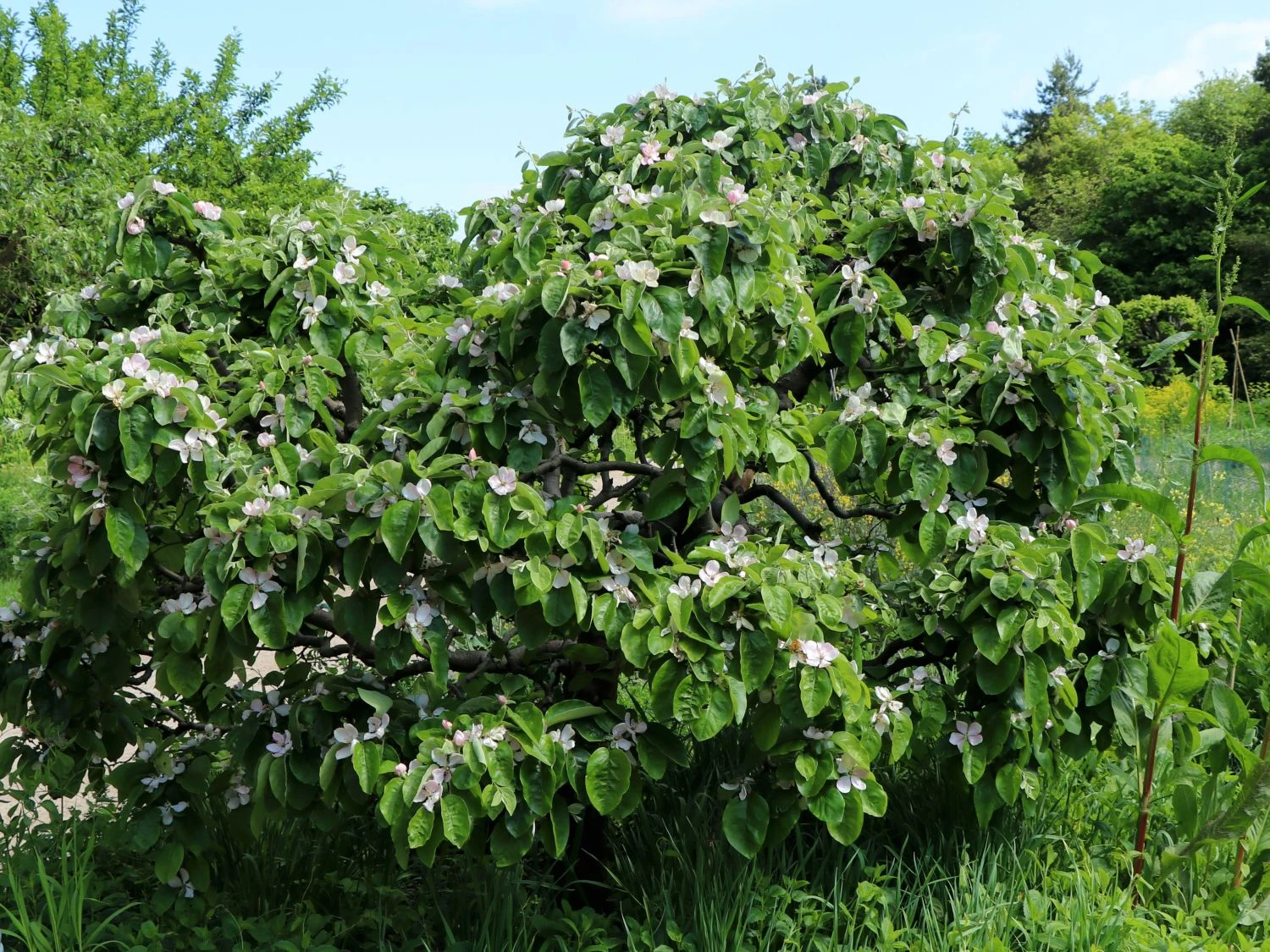 Die Quitte ‚Konstantinopeler Apfelquitte‘ zählt zu den alten Kultursorten der Quitte. Sie stammt vermutlich aus dem Kaukasusgebiet und ist seit Jahrhunderten in unseren Breiten in Kultur. Der Name „Quitte“ geht auf die kretische Stadt Kydonia zurück, dem heutigen Chania. Die Quitte gehört zu den Rosengewächsen, der Gärtner unterscheidet zwischen Apfel- und Birnenquitten. Die Früchte der Birnenquitte sind etwas weicher, die der Apfelquitte werden größer. Die ‚Konstantinopeler Apfelquitte‘ wächst mittelstark und aufrecht. Sie streckt sich zwischen zwei bis vier Meter in die Höhe. Die Krone ist breit und ausladend und oft sparrig verzweigt. Die Erträge setzen früh ein und der Obstbaum erweist sich als unkompliziert und winterhart. Wie alle Quitten benötigt (bot.) Cydonia ‚Konstantinopler Apfelquitte‘ einen sonnigen bis halbschattigen und geschützten Standort. Die Quitte ‚Konstantinopeler Apfelquitte‘ ist für Hausgärten, für die Kübelpflanzung sowie den Obstbau bestens geeignet. Die Quitte gedeiht auf durchlässigen, nicht zu trockenen und gerne nährstoffreichen Böden. Die zauberhaften Blüten verwöhnen das Auge! Diese zeigen sich von April bis in den Juni. Die reinweißen Blüten sind schalenförmig. Sie erlangen eine Größe von fünf bis sieben Zentimetern und zählen zu den schönsten Obstbaumblüten in unseren Breiten. Bienen und Hummeln, die Hauptbestäuber von Quitten, fliegen auf den Nektar!