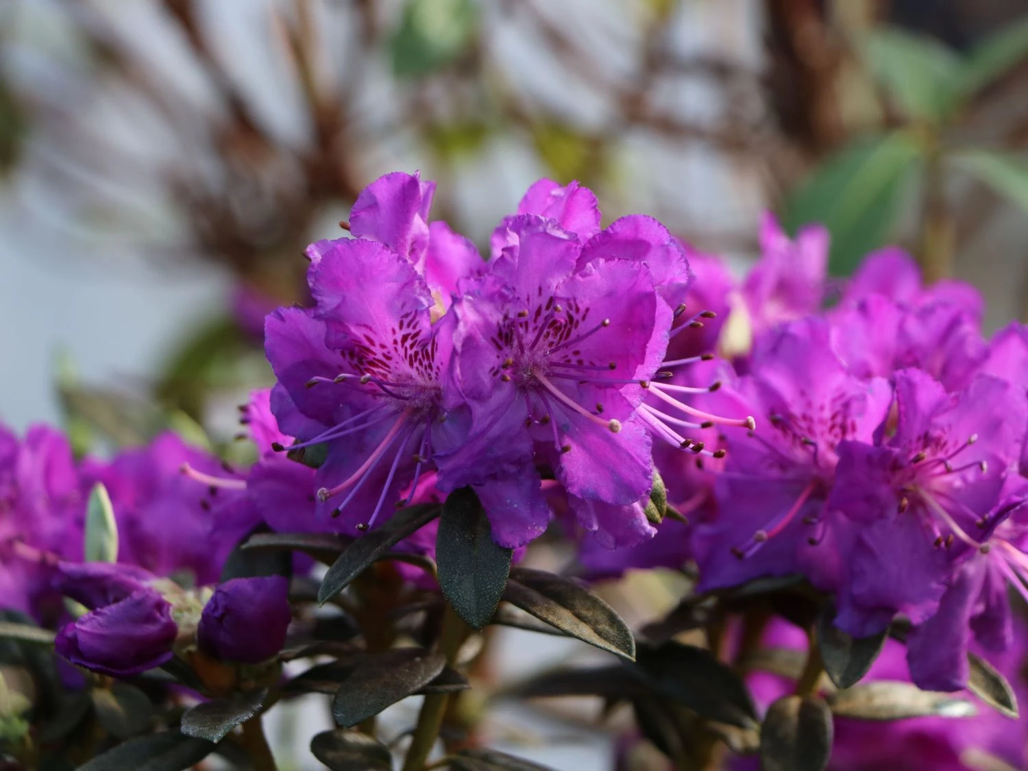 Violette Blüten haben einige Rhododendren, aber der ‚Azurella‘ sticht aus ihnen heraus, da seine Kronblätter rundum schwarzviolette Zeichnungen aufweisen. Die gleichfarbigen Staubblätter leisten gekonnt ihren Beitrag zu dieser Besonderheit der Blüten.