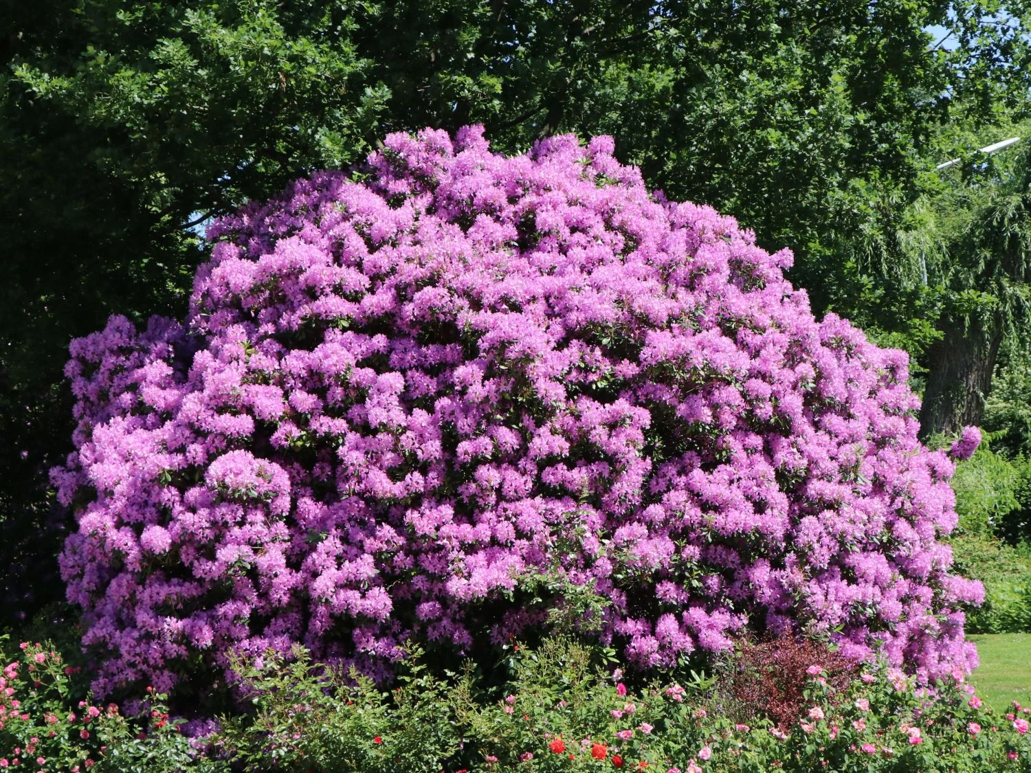 Diese schönen Pflanze bietet sich für unterschiedlichste Arrangements im Garten an. Auf einem kleineren Grundstück bietet sich der Zierstrauch als Solitär auf einer Freifläche an. Größere Gärten lassen sich mit Gruppen dieser schönen Rhododendron-Sorte zauberhaft gestalten. Hier kombiniert der Gärtner Rhododendron Hybride ‚Catawbiense Grandiflorum‘ mit anderen, vorzugsweise heller oder dunkler blühenden Sorten. Traumhaft schön wirkt der Strauch, wenn er innerhalb einer Gruppe die dunkelsten Blüten aufweist, eingesäumt von weiß blühenden Sträuchern. Zauberhaft wirkt eine Terrasse, die eine lange Reihe unterschiedlicher Rhododendren umsäumt. Durch die enorme Wuchsbreite benötigt der Rhododendron ‚Catawbiense Grandiflorum‘ bereits beim Einpflanzen ausreichend Raum. Hat er nicht genügend Platz, entwickelt er sich spärlich. Der voluminöse und buschige Wuchs entwickelt sich am besten auf einem sorgfältig gewählten Standplatz. Gärtner, die einen attraktiven pflegeleichten und extrem winterharten Strauch bevorzugen, haben am Rhododendron Hybride ‚Catawbiense Grandiflorum‘ echte Freude. Auch in schneereichen und eisigen Regionen sind keine Maßnahmen zum Überwintern nötig. Lediglich Jungpflanzen in Kübeln schützt der Gärtner ausreichend. Gut eingewurzelte große Sträucher verbleiben ohne speziellen Schutz im Garten und überdauern die kalten Monate problemlos. Der Rhododendron ‚Catawbiense Grandiflorum‘ ist robust und windfest. Auch bei stärkerem Sturm nimmt er keinen Schaden. Pflanzt ihn der Gärtner nicht an einer Senke mit Staunässe, lässt sich dieser Rhododendron von Starkregen nicht beeindrucken. Zu nasse Füße verzeiht dieser zauberhafte Zierstrauch nicht. Torfhaltiger Gartenboden sorgt für ausreichend Nährstoffe und den richtigen pH-Wert für dieses Gehölz. In der Blütezeit erstrahlt ein herrlich violett blühender Busch auf dem Grundstück. Dieser Liebling ist ein charmanter und gern gesehener Blickfang. Mit seinem immergrünen Laub verzaubert er vor und nach der Blüte und ist ein ganzjährig wirkungsvoller Akzent im Garten. Erscheint die schöne Blüte in hellem Lilaton, macht dieser Strauch seinen Bewunderer sprachlos.